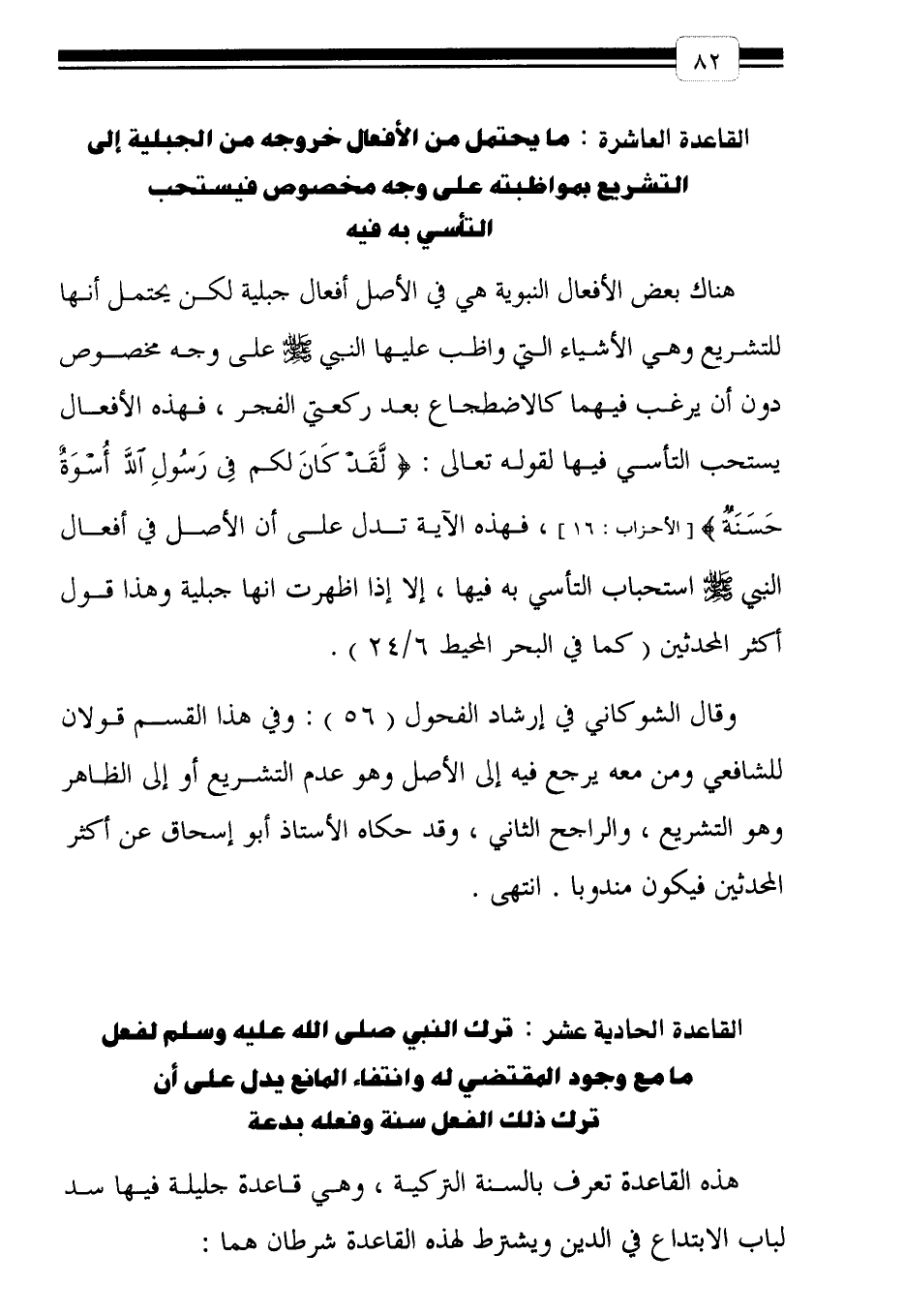 القاعدة الحادية عشر: ترك النبي صلى الله عليه وسلم لفعل ما مع وجود المقتضي له وانتفاء المانع يدل على أن ترك ذلك الفعل سنة وفعله بدعة