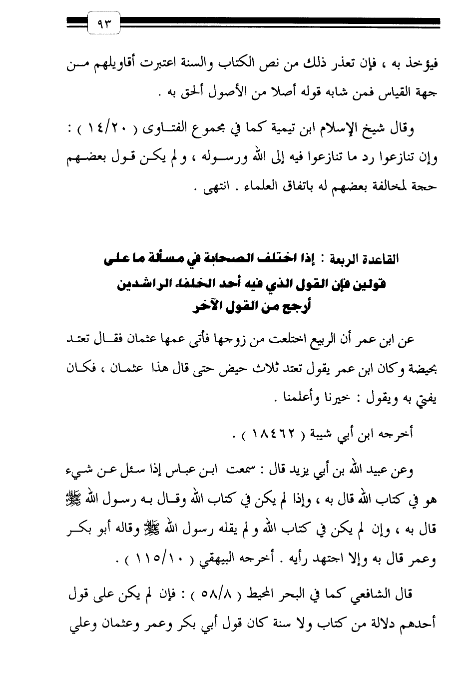 القاعدة الربعة: إذا اختلف الصحابة في مسألة ما على قولين فإن القول الذي فيه أحد الخلفاء الراشدين أرجح من القول الآخر