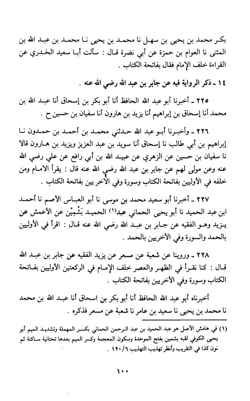 227 - أَخْبَرَنَا أَبُو سَعِيدٍ مُحَمَّدُ بْنُ مُوسَى نا أَبُو الْعَبَّاسِ الْأَصَمُّ , نا أَحْمَدُ بْنُ عَبْدِ الْحَمِيدِ , نا أَبُو يَحْيَى الْحِمَّانِيُّ عَبْدُ الْحَمِيدِ بَشْمِينُ عَنِ الْأَعْمَشِ , عَنْ يَزِيدَ وَهُوَ الْفَقِيهُ , عَنْ جَابِرِ بْنِ عَبْدِ اللَّهِ , رَضِيَ اللَّهُ عَنْهُ قَالَ: §«اقْرَأْ فِي الْأُولَيَيْنِ بِالْحَمْدِ وَالسُّورَةِ وَفِي الْأُخْرَيَيْنِ بِالْحَمْدِ»