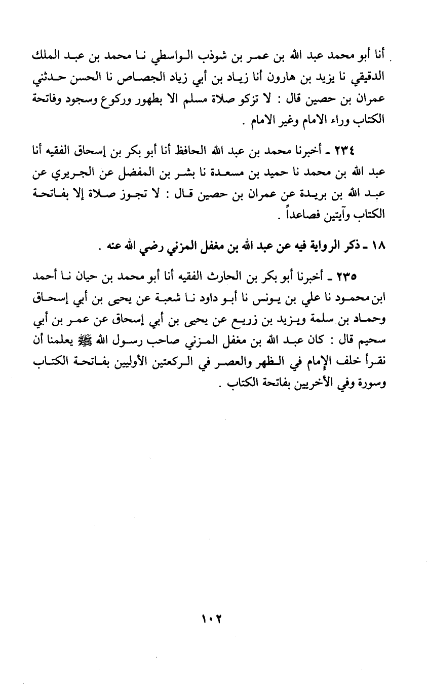234 - أَخْبَرَنَا مُحَمَّدُ بْنُ عَبْدِ اللَّهِ الْحَافِظُ , أنا أَبُو بَكْرِ بْنُ إِسْحَاقَ الْفَقِيهُ , أنا عَبْدُ اللَّهِ بْنُ مُحَمَّد , نا حُمَيْدُ بْنُ مَسْعَدَةَ , نا بِشْرُ بْنُ الْمُفَضَّلِ , عَنِ الْجُرَيْرِيِّ , عَنْ عَبْدِ اللَّهِ بْنِ بُرَيْدَةَ , عَنْ عِمْرَانَ بْنِ حُصَيْنٍ , قَالَ: §«لَا تَجُوزُ صَلَاةٌ إِلَّا بِفَاتِحَةِ الْكِتَابِ وَآيَتَيْنِ فَصَاعِدًا»