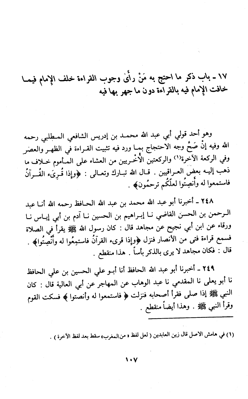 248 - أَخْبَرَنَا أَبُو عَبْدِ اللَّهِ مُحَمَّدُ بْن عَبْدِ اللَّهِ الْحَافِظُ رَحِمَهُ اللَّهُ أنا عَبْدُ الرَّحْمَنِ بْنُ الْحَسَنِ الْقَاضِي , نا إِبْرَاهِيمُ بْنُ الْحُسَيْنِ , نا آدَمُ بْنُ أَبِي إِيَاسٍ , نا وَرْقَاءُ , عَنِ ابْنِ أَبِي نَجِيحٍ , عَنْ مُجَاهِدٍ , قَالَ: كَانَ رَسُول اللَّهِ صَلَّى اللهُ عَلَيْهِ وَسَلَّمَ " §يَقْرَأُ فِي الصَّلَاةِ فَسَمِعَ قِرَاءَةَ فَتًى مِنَ الْأَنْصَارِ فَنَزَلَ {وَإِذَا قُرِئَ الْقُرْآنُ فَاسْتَمِعُوا لَهُ وَأَنْصِتُوا} [الأعراف: 204] قَالَ: فَكَانَ مُجَاهِدٌ لَا يَرَى بِالذِّكْرِ بَأْسًا " هَذَا مُنْقَطِع