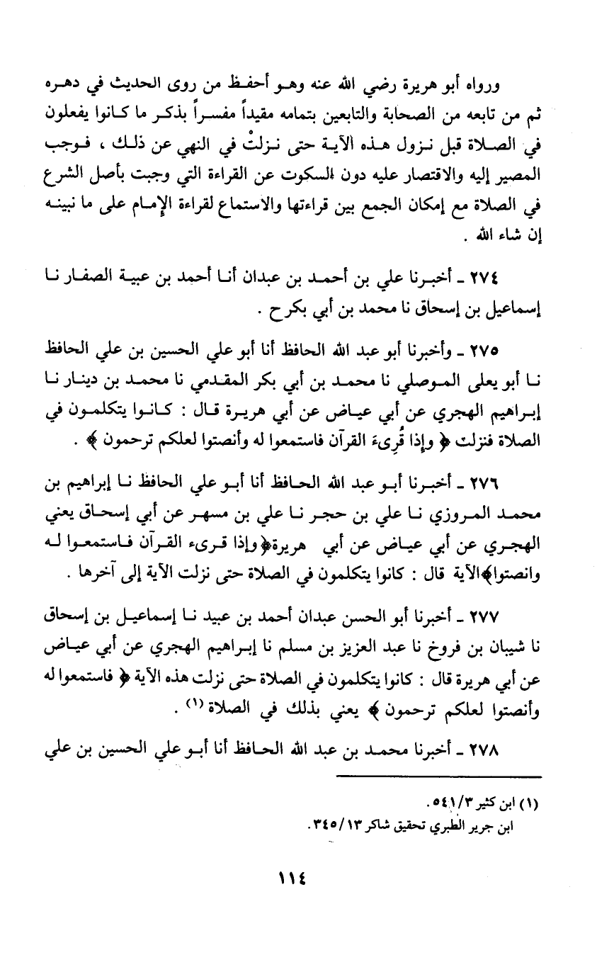 278 - أَخْبَرَنَا مُحَمَّدُ بْنُ عَبْدِ اللَّهِ الْحَافِظُ , أنا أَبُو عَلِيٍّ الْحُسَيْنُ بْنُ عَلِيٍّ -[115]- الْحَافِظُ , نا عَبْدُ اللَّهِ بْنُ مُحَمَّدِ بْنِ بِشْرِ بْنِ صَالِحٍ الْحَافِظُ , نا أَبُو عُمَيْرِ بْنُ النَّحَّاسِ الرَّمْلِيُّ , أنا مُؤَمَّلُ بْن إِسْمَاعِيلَ , نا عَبْدُ الْعَزِيزِ بْنُ مُسْلِمٍ الْقَسْمَلِيُّ , نا مُحَمَّدُ بْنُ زِيَادٍ , عَنْ أَبِي هُرَيْرَةَ , قَالَ: " كَانُوا يَتَكَلَّمُونَ فِي الصَّلَاةِ فَأَنْزَلَ اللَّهُ عَزَّ وَجَلَّ هَذِهِ الْآيَةَ {§وَإِذَا قُرِئَ الْقُرْآنُ فَاسْتَمِعُوا لَهُ وَأَنْصِتُوا} [الأعراف: 204] الْآيَةُ فَأُمِرُوا بِالْخُشُوعِ فِي الصَّلَاةِ وَنُهُوا عَنِ الْكَلَامِ "