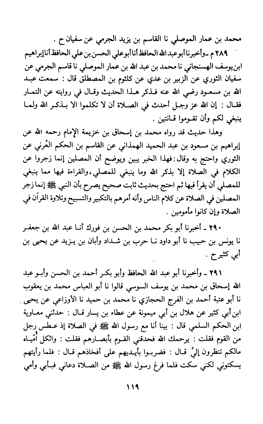 291 - وَأَخْبَرَنَا أَبُو عَبْدِ اللَّهِ الْحَافِظُ , وَأَبُو بَكْرٍ أَحْمَدُ بْنُ الْحَسَنِ وَأَبُو عَبْدِ اللَّهِ إِسْحَاقُ بْنِ مُحَمَّدِ بْنِ يُوسُفَ السُّوسِيُّ قَالُوا: نا أَبُو الْعَبَّاسِ مُحَمَّدُ بْن يَعْقُوبَ نا أَبُو عُتْبَةَ أَحْمَدُ بْنُ الْفَرَجِ الْحِجَازِيُّ نا مُحَمَّدُ بْنُ حِمْيَرٍ , نا الْأَوْزَاعِيُّ , عَنْ يَحْيَى بْنِ أَبِي كَثِيرٍ , عَنْ هِلَالِ بْنِ أَبِي مَيْمُونَةَ , عَنْ عَطَاءِ بْنِ يَسَارٍ , قَالَ: حدَّثَنِي مُعَاوِيَةُ بْنُ الْحَكَم السُّلَمِيُّ , قَالَ: " بَيْنَا أَنَا مَعَ رَسُول اللَّهِ صَلَّى اللهُ عَلَيْهِ وَسَلَّمَ فِي الصَّلَاةِ إِذْ عَطَسَ رَجُلٌ مِنَ الْقَوْمِ فَقُلْتُ: يَرْحمُكَ اللَّهُ , فَحدَّقَنِي الْقَوْمُ بِأَبْصَارِهِمْ , فَقُلْتُ: وَاثُكْلَ أُمِّيَاهُ , مَالُكُمْ تَنْظُرُونَ إِلَيَّ؟ قَالَ: فَضَرَبُوا بِأَيْدِيهِمْ عَلَى أَفْخَاذِهِمْ قَالَ: فَلَمَّا رَأَيْتُهُمْ يُسَكِّتُونِي لَكِنِّي سَكَتُّ , فَلَمَّا فَرَغَ رَسُول اللَّهِ صَلَّى اللهُ عَلَيْهِ وَسَلَّمَ مِنَ الصَّلَاةِ دَعَانِي فَبِأَبِي وَأُمِّي -[120]- رَسُول اللَّهِ صَلَّى اللهُ عَلَيْهِ وَسَلَّمَ مَا رَأَيْتُ مُعَلِّمًا قَبْلَهُ وَلَا بَعْدَهُ أَحْسَنَ تَعْلِيمًا مِنْهُ وَاللَّهِ مَا كَهَرَنِي وَلَا ضَرَبَنِي وَلَا سَبَّنِي قَالَ: «إِنَّ §صَلَاتَنَا لَا يَصْلُحُ فِيهَا شَيْءٌ مِنْ كَلَامِ النَّاسِ , إِنَّمَا هِيَ التَّكْبِيرُ وَالتَّسْبِيحُ وَتِلَاوَةُ الْقُرْآنِ» هَذَا لَفْظُ حَدِيثِ الْأَوْزَاعِيِّ وَرَوَاهُ فُلَيْحُ بْنُ سُلَيْمَانَ عَنْ هِلَالٍ وَقَالَ فِي الْحَدِيثِ: فَدَعَانِي رَسُول اللَّهِ صَلَّى اللهُ عَلَيْهِ وَسَلَّمَ فَقَالَ: «إِنَّمَا الصَّلَاةُ لِقِرَاءَةِ الْقُرْآنِ وَذِكْرِ اللَّهِ , فَإِذَا كُنْتَ فِيهَا فَلْيَكُنْ ذَلِكَ شَأْنُكَ»