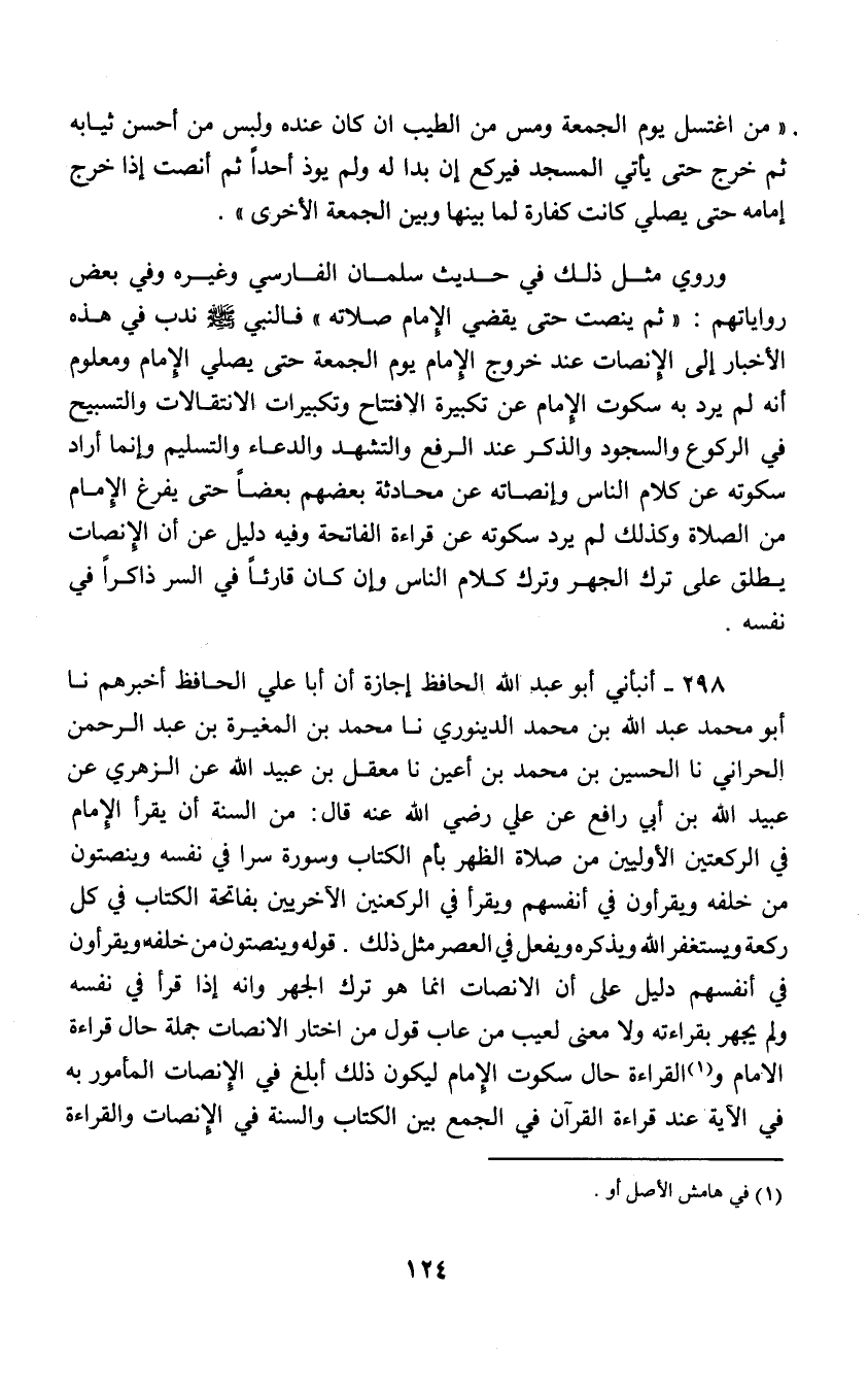 298 - أَنْبَأَنِي أَبُو عَبْدِ اللَّهِ الْحَافِظُ , إِجَازَةً أَنَّ أَبَا عَلِي الْحَافِظُ , أَخْبَرَهُمْ نا أَبُو مُحَمَّدٍ عَبْدُ اللَّهِ بْنُ مُحَمَّدٍ الدَّيْنَوَرِيُّ , نا مُحَمَّدُ بْنُ الْمُغِيرَةِ بْنِ عَبْدِ الرَّحْمَنِ الْحرَّانِيُّ , نا الْحَسَنُ بْنُ مُحَمَّدِ بْنِ أَعْيَنَ , نا مَعْقِلُ بْنُ عُبَيْد اللَّهِ , عَنِ الزُّهْرِيِّ , عَنْ عُبَيْد اللَّهِ بْنِ أَبِي رَافِعٍ , عَنْ عَلِي , رَضِيَ اللَّهُ عَنْهُ قَالَ: §«مِنَ السُّنَّةِ أَنْ يَقْرَأَ الْإِمَامُ فِي الرَّكْعَتَيْنِ الْأُولَيَيْنِ مِنْ صَلَاةِ الظُّهْرِ بِأُمِّ الْكِتَابِ وَسُورَةٍ سِرًّا فِي نَفْسِهِ وَيُنْصِتُونَ مِنْ خَلْفِهِ وَيَقْرَأُونَ فِي أَنْفُسِهِمْ , وَيَقْرَأُ فِي الرَّكْعَتَيْنِ الْأُخْرَيَيْنِ بِفَاتِحَةِ الْكِتَابِ فِي كُلِّ رَكْعَةٍ , وَيَسْتَغْفِرُ اللَّهَ وَيَذْكُرُهُ وَيَفْعَلُ فِي الْعَصْرِ مِثْلَ ذَلِكَ» قَوْلُهُ: وَيُنْصِتُونَ مِنْ خَلْفِهِ وَيَقْرَأُونَ فِي أَنْفُسِهِمْ دَلِيلٌ عَلَى أَنَّ الْإِنْصَاتَ إِنَّمَا هُوَ تَرْكُ الْجَهْرِ وَإِنَّهُ إِذَا قَرَأَ فِي نَفْسِهِ لَمْ يَجْهَرْ بِقِرَاءَتِهِ وَلَا مَعْنَى لِعَيْبِ مِنْ عَابَ قَوْلَ مِنَ اخْتَارَ الْإِنْصَاتَ جُمْلَةً حَالَ قِرَاءَةِ الْإِمَامِ وَالْقِرَاءَةَ حَالَ سُكُوتِ الْإِمَامِ لِيَكُونَ ذَلِكَ أَبْلَغَ فِي الْإِنْصَاتِ الْمَأمُورِ بِهِ فِي الْآيَةِ عِنْدَ قِرَاءَةِ الْقُرْآنِ فِي الْجَمْعِ بَيْنَ الْكِتَابِ وَالسُّنَّةِ فِي الْإِنْصَاتِ وَالْقِرَاءَةِ -[125]- بِضَرَرِ الْأَمْثَالِ فِي قَدْرِ السُّكُوتِ وَإِمْكَانِ الْقِرَاءَةِ فِيهِ وَعَدَمِ إِمْكَانِهَا وَإِنْكَارِ الْخَبَرِ الْوَارِدِ فِي سَكْتَتَيِ الْإِمَامِ وَمُعَارَضَتِهِ بِخَبَرِ تَرْكِ السُّكُوتِ عِنْدَ الْقِيَامِ مِنَ الرَّكْعَةِ الثَّانِيَةِ فَحَدِيثُ السُّكُوتِ بَيْنَ التَّكْبِيرَةِ الْأُولَى وَالْفَاتِحَة ثُمَّ حَدِيثُ السَّكْتَتَيْنِ أَثْبَتَ مِنْ كُلِّ حَدِيثٍ يَحْتَجُّ بِهِ مَنْ يقُولُ: بِتَرْكِ الْقِرَاءَةِ خَلْفَ الْإِمَامِ فِي جَمِيعِ الصَّلَوَاتِ عِنْدَ أَهْلِ الْمَعْرِفَةِ بِالْحَدِيثِ , وَذَهَبَ إِلَى هَذَا الْمَذْهَبِ فِي الْجَمْعِ بَيْنَ الْإِنْصَاتِ عِنْدَ قِرَاءَةِ الْإِمَامِ وَقِرَاءَةِ الْفَاتِحَة عِنْدَ سُكُوتِ الْإِمَامِ مِنْ سَمَّيْنَاهُمْ فِي الْجُزْءِ قَبْلَهُ مِنَ الصَّحَابَةِ وَالتَّابِعِينَ وَمَنْ بَعْدَهُمْ وَهُوَ وَإِنْ لَمْ يَسْكُتْ فِي الرَّكْعَةِ الثَّانِيَةِ عِنْدَ الِابْتِدَاءِ بِالْفَاتِحَة فَيَسْكُتُ عِنْدَ الْفَرَاغِ مِنْهَا , وَقِرَاءَةُ الْفَاتِحَة فِي ذَلِكَ السُّكُوتِ مُمْكِنَةٌ لِمَنْ أَرَادَ قِرَاءَتَهَا , ثُمَّ إِنْ لَمْ يُمْكِنْهُ قَرَأَهَا سِرًّا فِي نَفْسِهِ مَعَ الْإِمَامِ كَمَا أَمَرَ بِهِ صَاحِبُ الشَّرْعِ فِي خَبَرِ عُبَادَةَ بْنِ الصَّامِتِ وَغَيْرِهِ , وَأَمَرَ بِهِ مِنْ سَمَّيْنَاهُمْ مِنَ الصَّحَابَةِ رَضِيَ اللَّهُ عَنْهُمْ , وَلَا يَخْرُجُ بِقِرَاءَتِهِ إِيَّاهَا سِرًّا مِنْ أَنْ يَكُونَ لِقِرَاءَةِ إِمَامِهِ مُسْتَمِعًا وَلَهَا مُنْصِتًا لِمَا ذَكَرْنَا مِنَ الدَّلَالَةِ وَخَبَرُ السُّكُوتِ بَيْنَ التَّكْبِيرَةِ الْأُولَى وَالْقِرَاءَةِ قَدْ ذَكَرْنَاهُ فِي هَذَا الْجُزْءِ