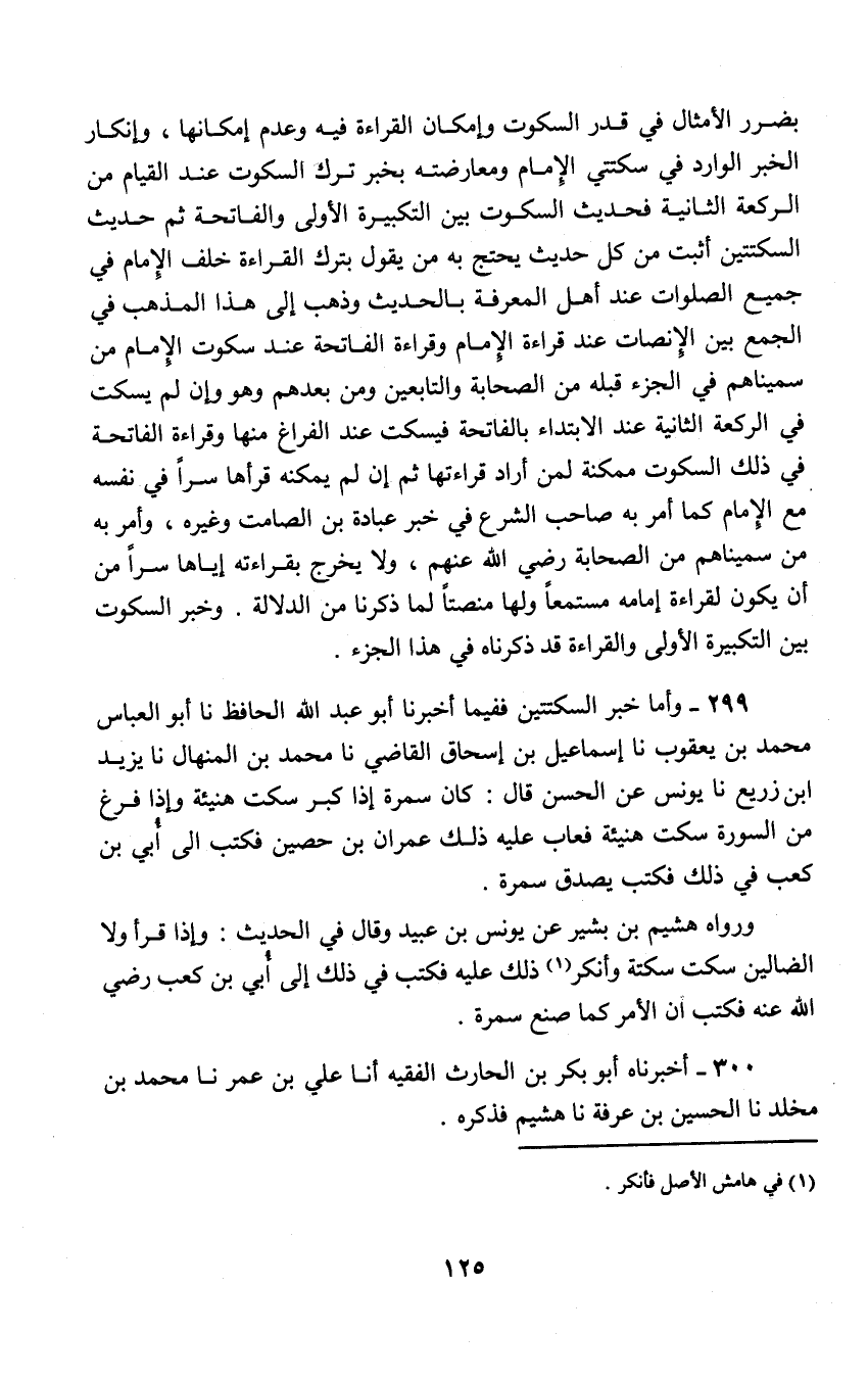 299 - وَأَمَّا خَبَرُ السَّكْتَتَيْنِ فَفِيمَا أَخْبَرَنَا أَبُو عَبْدِ اللَّهِ الْحَافِظُ , نا أَبُو الْعَبَّاسِ مُحَمَّدُ بْن يَعْقُوبَ نا إِسْمَاعِيلُ بْنُ إِسْحَاقَ الْقَاضِي , نا مُحَمَّدُ بْنُ الْمِنْهَالِ , نا يَزِيدُ بْنُ زُرَيْعٍ , نا يُونُسُ , عَنِ الْحَسَنِ , قَالَ: «كَانَ سَمُرَةُ §إِذَا كَبَّرَ سَكَتَ هُنَيْهَةً وَإِذَا فَرَغَ مِنَ السُّورَةِ سَكَتَ هُنَيْهَةً فَعَابَ عَلَيْهِ ذَلِكَ عِمْرَانُ بْنُ حُصَيْنٍ , فَكَتَبَ إِلَى أُبَيِّ بْنِ كَعْبٍ فِي ذَلِكَ , فَكَتَبَ يُصَدِّقُ سَمُرَةَ» وَرَوَاهُ هُشَيْمُ بْنُ بَشِيرٍ عَنْ يُونُسَ بْنِ عُبَيْدٍ وَقَالَ فِي الْحَدِيثِ: وَإِذَا قَرَأَ وَلَا الضَّالِّينَ سَكَتَ سَكْتَةً , وَأَنْكَرَ ذَلِكَ عَلَيْهِ فَكَتَبَ فِي ذَلِكَ إِلَى أُبَيِّ بْنِ كَعْبٍ رَضِيَ اللَّهُ عَنْهُ , فَكَتَبَ أَنَّ الْأَمْرَ كَمَا صَنَعَ سَمُرَةُ