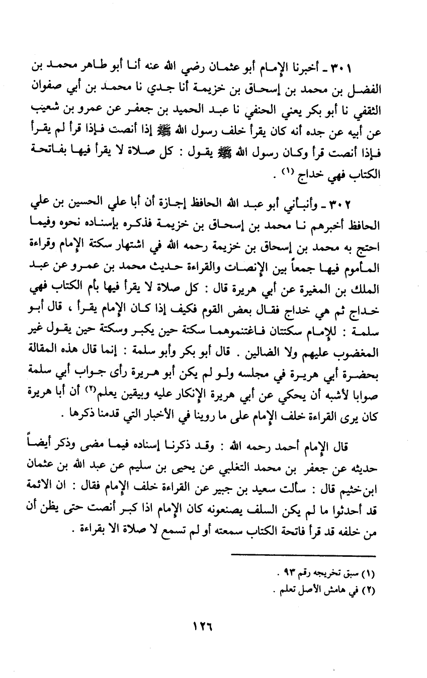 301 - أَخْبَرَنَا الْإِمَامُ أَبُو عُثْمَانَ , رَضِيَ اللَّهُ عَنْهُ أنا أَبُو طَاهِرٍ مُحَمَّدُ بْنُ الْفَضْلِ بْنِ مُحَمَّدِ بْنِ إِسْحَاقَ بْنِ خُزَيْمَةَ أنا جَدِّي , نا مُحَمَّدُ بْنُ أَبِي صَفْوَانَ الثَّقَفِيُّ , نا أَبُو بَكْرٍ يَعْنِي الْحنَفِيَّ , نا عَبْدُ الْحَمِيدِ بْنُ جَعْفَرٍ , عَنْ عَمْرِو بْنِ شُعَيْبٍ , عَنْ أَبِيهِ , عَنْ جَدِّهِ , أَنَّهُ كَانَ يَقْرَأُ خَلْفَ رَسُول اللَّهِ صَلَّى اللهُ عَلَيْهِ وَسَلَّمَ إِذَا أَنْصَتَ فَإِذَا قَرَأَ لَمْ يَقْرَأْ , فَإِذَا أَنْصَتَ قَرَأَ وَكَانَ رَسُول اللَّهِ صَلَّى اللهُ عَلَيْهِ وَسَلَّمَ يَقُولُ: §«كُلُّ صَلَاةٍ لَا يُقْرَأُ فِيهَا بِفَاتِحَةِ الْكِتَابِ فَهِيَ خِدَاجٌ»