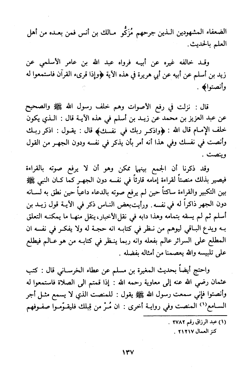 الضُّعَفَاءِ الْمَشْهُورِينَ الَّذِينَ جَرَحَهُمْ مُزَكُّو مَالِكِ بْنِ أَنَسٍ فَمَنْ بَعْدَهُ مِنْ أَهْلِ الْعِلْمِ بِالْحَدِيثِ وَقَدْ خَالَفَهُ غَيْرُهُ عَنْ أَبِيهِ فَرَوَاهُ عَبْدُ اللَّهِ بْنُ عَامِرٍ الْأَسْلَمِيُّ , عَنْ زَيْدِ بْنِ أَسْلَمَ , عَنْ أَبِيهِ , عَنْ أَبِي هُرَيْرَةَ فِي هَذِهِ الْآيَةِ {وَإِذَا قُرِئَ الْقُرْآنُ فَاسْتَمِعُوا لَهُ وَأَنْصِتُوا} [الأعراف: 204] قَالَ: نَزَلَتْ فِي رَفْعِ الْأَصْوَاتِ وَهُمْ خَلْفَ رَسُول اللَّهِ صَلَّى اللهُ عَلَيْهِ وَسَلَّمَ وَالصَّحِيحُ عَنْ عَبْدِ الْعَزِيزِ بْنِ مُحَمَّدٍ , عَنْ زَيْدِ بْنِ أَسْلَمَ فِي هَذِهِ الْآيَةِ قَالَ: الَّذِي يَكُونُ خَلْفَ الْإِمَامِ , قَالَ اللَّهُ: {وَاذْكُرْ رَبَّكَ فِي نَفْسِكَ} [الأعراف: 205] قَالَ: يَقُولُ: اذْكُرْ رَبَّكَ وَأَنْصِتْ فِي نَفْسِكَ , وَفِي هَذَا أَنَّهُ أَمَرَ بِأَنْ يَذْكُرَ فِي نَفْسِهِ وَدُونَ الْجَهْرِ مِنَ الْقَوْلِ وَيُنْصِتُ وَقَدْ ذَكَرْنَا أَنَّ الْجَمْعَ بَيْنَهُمَا مُمْكِنٌ وَهُوَ أَنْ لَا يَرْفَعَ صَوْتَهُ بِالْقِرَاءَةِ فَيَصِيرُ بِذَلِكَ مُنْصِتًا لِقِرَاءَةِ إِمَامِهِ قَارِئًا فِي نَفْسِهِ دُونَ الْجَهْرِ كَمَا كَانَ النَّبِيُّ صَلَّى اللهُ عَلَيْهِ وَسَلَّمَ بَيْنَ التَّكْبِيرِ وَالْقِرَاءَةِ سَاكِتًا حِينَ لَمْ يَرْفَعْ صَوْتَهُ بِالدُّعَاءِ دَاعِيًا حِينَ نَطَقَ بِهِ لِسَانُهُ دُونَ الْجَهْرِ ذَاكِرًا لَهُ فِي نَفْسِهِ وَرَأَيْتُ بَعْضَ النَّاسِ ذَكَرَ فِي الْآيَةِ قَوْلَ زَيْدِ بْنِ أَسْلَمَ ثُمَّ لَمْ يَسُقْهُ بِتَمَامِهِ وَهَذَا دَأْبُهُ فِي نَقْلِ الْأَخْبَارِ يَنْقُلُ مِنْهَا مَا يُمْكِنُهُ التَّعَلُّقُ بِهِ وَيَدَعُ الْبَاقِي لِيُوهِمَ مِنْ نَظَرَ فِي كِتَابِهِ أَنَّهُ حُجَّة لَهُ , وَلَا يُفَكِّرُ فِي نَفْسِهِ أَنَّ الْمُطَّلِعَ عَلَى السَّرَائِرِ عَالِمٌ بِفِعْلِهِ وَأَنَّهُ رُبَّمَا يَنْظُرُ فِي كِتَابِهِ مِنْ هُوَ عَالِمٌ فَيَطَّلِعُ عَلَى تَلْبِيسِهِ , وَاللَّهُ يَعْصِمُنَا مِنْ أَمْثَالِهِ بِفَضْلِهِ وَاحْتَجَّ أَيْضًا بِحَدِيثِ الْمُغِيرَةِ بْنِ مُسْلِمٍ عَنْ عَطَاءً الْخُرَاسَانِيِّ قَالَ: كَتَبَ عُثْمَانُ رَضِيَ اللَّهُ عَنْهُ إِلَى مُعَاوِيَةَ رَحِمَهُ اللَّهُ: إِذَا قُمْتُمْ إِلَى الصَّلَاةِ فَاسْتَمِعُوا لَهُ وَأَنْصِتُوا فَإِنِّي سَمِعْتُ رَسُولَ اللَّهِ صَلَّى اللهُ عَلَيْهِ وَسَلَّمَ يَقُولُ: «لِلْمُنْصِتِ الَّذِي لَا يَسْمَعُ مِثْلُ أَجْرِ السَّامِعِ الْمُنْصِتِ» وَفِي رِوَايَةٍ أُخْرَى: أَنْ مُرْ مِنْ قِبَلَكَ فَلْيَقَوِّمُوا صُفُوفَهُمْ