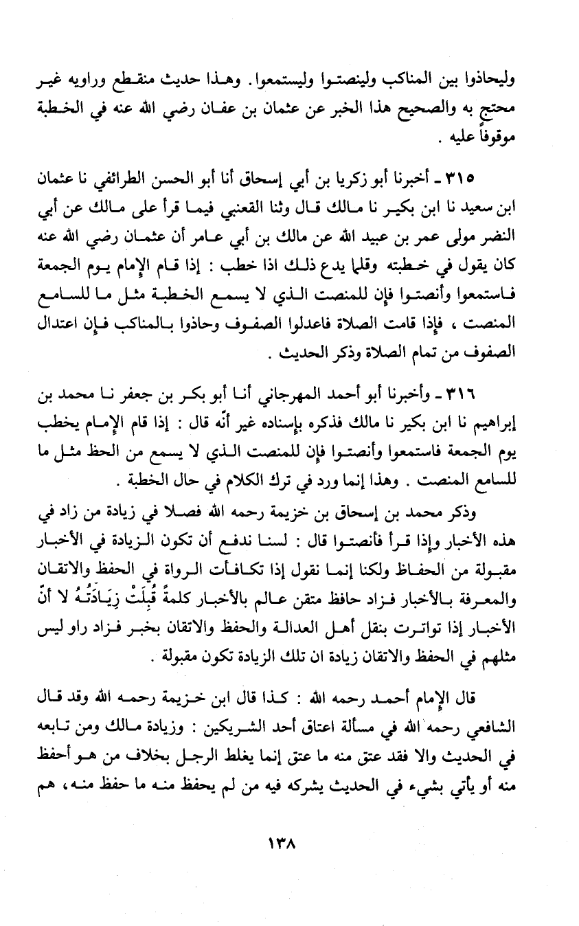 316 - وَأَخْبَرَنَا أَبُو أَحْمَدَ الْمَهْرَجَانِيُّ , أنا أَبُو بَكْرِ بْنِ جَعْفَرٍ , نا مُحَمَّدُ بْنُ إِبْرَاهِيمَ , نا ابْنُ بُكَيْرٍ , نا مَالِكٌ , فَذَكَرَهُ بِإِسْنَادِهِ غَيْرَ أَنَّهُ قَالَ: إِذَا قَامَ الْإِمَامُ يَخْطُبُ يَوْمَ الْجُمُعَةِ فَاسْتَمِعُوا وَأَنْصِتُوا فَإِنَّ لِلْمُنْصِتِ الَّذِي لَا يَسْمَعُ مِنَ الْحَظِّ مِثْلَ مَا لِلسَّامِعِ الْمُنْصِتِ وَهَذَا إِنَّمَا وَرَدَ فِي تَرْكِ الْكَلَامِ فِي حَالِ الْخُطْبَةِ وَذَكَرَ مُحَمَّدُ بْنُ إِسْحَاقَ بْنِ خُزَيْمَةَ رَحِمَهُ اللَّهُ فَصْلًا فِي زِيَادَةِ مِنْ زَادَ فِي هَذِهِ الْأَخْبَارِ: وَإِذَا قَرَأَ فَأَنْصِتُوا قَالَ: لَسْنَا نَدْفَعُ أَنْ تَكُونَ الزِّيَادَةُ فِي الْأَخْبَارِ مَقْبُولَةً مِنَ الْحُفَّاظِ وَلَكِنْ إِنَّمَا نَقُولُ: إِذَا تَكَافَأَتِ الرُّوَاةُ فِي الْحِفْظِ وَالْإِتْقَانِ وَالْمَعْرِفَةِ بِالْأَخْبَارِ فَزَادَ حَافَظٌ مُتْقِنٌ عَالِمٌ بِالْأَخْبَارِ كَلِمَةً قُبِلَتْ زِيَادَتُهُ لَا أَنَّ الْأَخْبَارَ إِذَا تَوَاتَرَتْ بِنَقْلِ أَهْلِ الْعَدَالَةِ وَالْحِفْظِ وَالْإِتْقَانِ بِخَبَرٍ فَزَادَ رَاوٍ لَيْسَ مَثَلَهُمْ فِي الْحِفْظِ وَالْإِتْقَانِ زِيَادَةً أَنَّ تِلْكَ الزِّيَادَةَ تَكُونُ مَقْبُولَةً قَالَ الْإِمَامُ أَحْمَدُ رَحِمَهُ اللَّهُ كَذَا قَالَ ابْنُ خُزَيْمَةَ رَحِمَهُ اللَّهُ وَقَدْ قَالَ الشَّافِعِيُّ رَحِمَهُ اللَّهُ فِي مَسْأَلَةِ إِعْتَاقِ أَحَد الشَّرِيكَيْنِ: وَزِيَادَةُ مَالِكٍ وَمَنْ تَابَعَهُ فِي الْحَدِيثِ: «وَإِلَّا فَقَدْ عَتَقَ مِنْهُ مَا عَتَقَ» إِنَّمَا يُغَلَّطُ الرَّجُلُ بِخِلَافِ مِنْ هُوَ أَحْفَظُ مِنْهُ , أَوْ يَأْتِي بِشَيْءٍ فِي الْحَدِيثِ يَشْرُكُهُ فِيهِ مَنْ لَمْ يَحْفَظْ مِنْهُ مَا حَفِظَ مِنْهُ هُمْ -[139]- عَدَدٌ وَهُوَ مُنْفَرِدٌ وَكَمَا رَجَّحَ الشَّافِعِيُّ إِحْدَى الرِّوَايَتَيْنِ عَلَى الْأُخْرَى بِزِيَادَةِ الْحِفْظِ رَجَحَ أَيْضًا بِزِيَادَةِ الْعَدَدِ وَكِلَاهُمَا مَوْجُودَانِ فِي هَذَا الْحَدِيثِ فَإِنَّ الَّذِي لَمْ يَأْتِ بِهَذِهِ الزِّيَادَةِ أَحْفَظُ عِنْدَ أَهْلِ الْعِلْمِ بِالْحَدِيثِ مِنَ الَّذِي أَتَى بِهَا , وَالَّذِينَ رَوَوْهُ دُونَهَا أَكْثَرُ عَدَدًا مِنَ الَّذِينَ أَتَوْا بِهَا مَعَ زِيَادَةِ الْحِفْظِ , فَوَجَبَ التَّوَقُفُ فِي تَثْبِيتَهَا مَعَ مَا فِيهَا مِنَ الِاحْتِمَالِ إِنْ ثَبَتَتْ أَنْ يَكُونَ الْمُرادُ بِهَا قِرَاءَةَ السُّورَةِ أَوْ تَرْكَ الْجَهْرِ دُونَ الْإِخْفَاءِ بِالْفَاتِحَة وَاللَّهُ أَعْلَمُ
