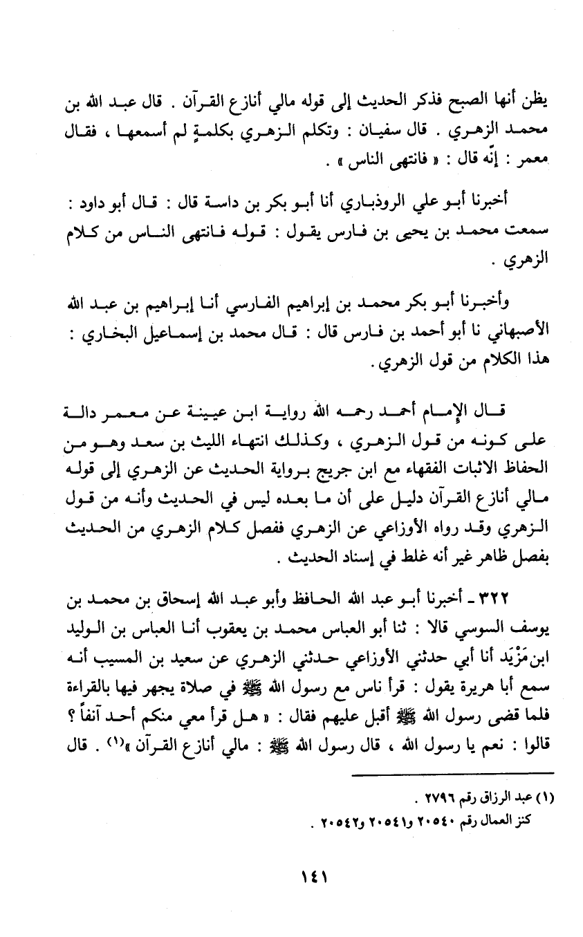 322 - أَخْبَرَنَا أَبُو عَبْدِ اللَّهِ الْحَافِظُ , وَأَبُو عَبْدِ اللَّهِ إِسْحَاقُ بْنِ مُحَمَّدِ بْنِ يُوسُفَ السُّوسِيُّ قَالَا: ثنا أَبُو الْعَبَّاسِ مُحَمَّدُ بْنُ يَعْقُوبَ أنا الْعَبَّاسُ بْنُ الْوَلِيدِ بْنِ مَزِيدٍ , أنا أَبِي , حدَّثَنِي الْأَوْزَاعِيُّ , حدَّثَنِي الزُّهْرِيُّ , عَنْ سَعِيدِ بْنِ الْمُسَيِّبِ , أَنَّهُ سَمِعَ أَبَا هُرَيْرَةَ , يَقُولُ: قَرَأَ نَاسٌ مَعَ رَسُول اللَّهِ صَلَّى اللهُ عَلَيْهِ وَسَلَّمَ فِي صَلَاةٍ يَجْهَرُ فِيهَا بِالْقِرَاءَةِ , فَلَمَّا قَضَى رَسُول اللَّهِ صَلَّى اللهُ عَلَيْهِ وَسَلَّمَ أَقْبَل عَلَيْهِمْ فَقَالَ: «هَلْ قَرَأَ مَعِي مِنْكُمْ أَحَدٌ آنِفًا؟» قَالُوا نَعَمْ يَا رَسُول اللَّهِ قَالَ رَسُولُ اللَّهِ صَلَّى اللهُ عَلَيْهِ وَسَلَّمَ: «§مَالِي أُنَازَعُ الْقُرْآنَ؟» قَالَ -[142]- الزُّهْرِيُّ: فَاتَّعَظَ الْمُسْلِمُونَ فَلَمْ يَكُونُوا يَقْرَأُونَ مَعَهُ فِيمَا جَهَرَ بِهِ وَكَذَلِكَ رَوَاهُ كَافَّةُ أَصْحَابِ الْأَوْزَاعِيِّ عَنِ الْأَوْزَاعِيِّ وَإِنَّمَا جَاءَ الْوَهْمُ لِلْأَوْزَاعِيِّ فِي إِسْنَادِهِ أَنَّ الزُّهْرِيَّ قَالَ: سَمِعْتُ ابْنَ أُكَيْمَةَ يُحدِّثُ سَعِيدَ بْنَ الْمُسَيِّبِ , فَنَسِيَ الْأَوْزَاعِيُّ رَحِمَهُ اللَّهُ قَوْلَ الزُّهْرِيِّ: سَمِعْتُ ابْنَ أُكَيْمَةَ , وَحَسِبَ أَنَّهُ عَنْ سَعِيدِ بْنِ الْمُسَيِّبِ لِأَنَّ الزُّهْرِيَّ ذَكَرَ ابْنَ الْمُسَيِّبِ فِي حَدِيثِ ابْنِ أُكَيْمَةَ وَرَوَاهُ زَكَرِيَّا بْنُ يَحْيَى الْوَقَارُ عَنْ بِشْرِ بْنِ بَكْرٍ , عَنِ الْأَوْزَاعِيِّ , عَنْ يَحْيَى بْن أَبِي كَثِيرٍ , عَنْ أَبِي هُرَيْرَةَ قَالَ: صَلَّى رَسُول اللَّهِ صَلَّى اللهُ عَلَيْهِ وَسَلَّمَ فَذَكَرَهُ وَزَادَ فِي مَتْنِهِ: «إِذَا أَسْرَرْتُ بِقِرَاءَتِي فاقْرَأُوا مَعِي وَإِذَا جَهَرْتُ بِقِرَاءَتِي فَلَا يَقْرَأَنَّ مَعِي أَحَدٌ»