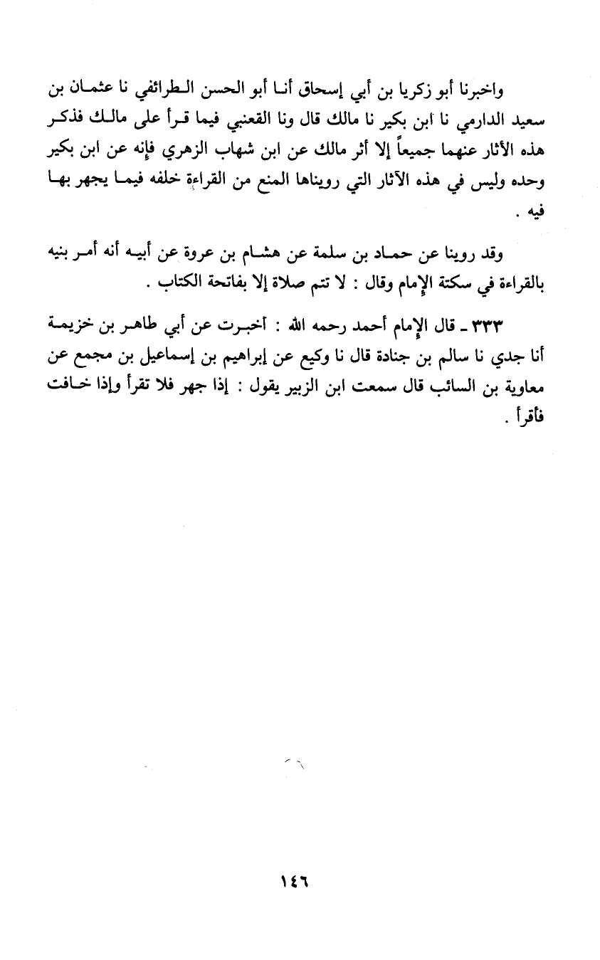 333 - قَاَلَ الْإِمَامُ أَحْمَدُ رَحِمَهُ اللَّهُ: أُخْبِرْتُ عَنْ أَبِي طَاهِرِ بْنِ خُزَيْمَةَ , أنا جَدِّي , نا سَالِمُ بْنُ جُنَادَةَ , قَالَ: نا وَكِيعٌ , عَنْ إِبْرَاهِيمَ بْنِ إِسْمَاعِيلَ بْنِ مُجَمِّعٍ , عَنْ مُعَاوِيَةَ بْنِ السَّائِبِ , قَالَ: سَمِعْتُ ابْنَ الزُّبَيْرِ , يَقُولُ: §«إِذَا جَهَرَ فَلَا تَقْرَأْ وَإِذَا خَافَتَ فَأَقْرَأْ»