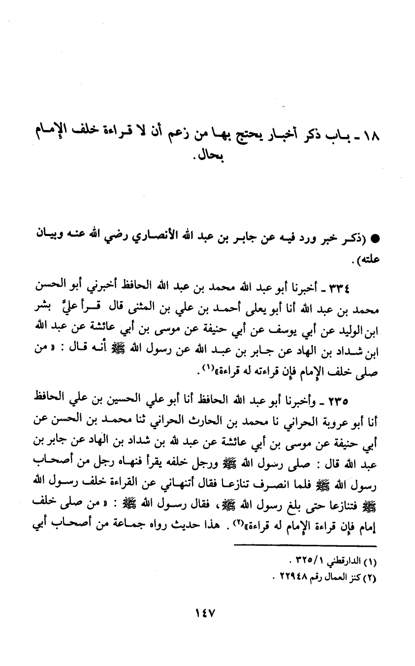 334 - أَخْبَرَنَا أَبُو عَبْدِ اللَّهِ مُحَمَّدُ بْن عَبْدِ اللَّهِ الْحَافِظُ أَخْبَرَنِي أَبُو الْحَسَنِ مُحَمَّدُ بْنُ عَبْدِ اللَّهِ أنا أَبُو يَعْلَى أَحْمَدُ بْنُ عَلِيِّ بْنِ الْمُثَنَّى قَالَ: قَرَأَ عَلِي بِشْرُ بْنُ الْوَلِيدِ عَنْ أَبِي يُوسُفَ , عَنْ أَبِي حَنِيفَةَ , عَنْ مُوسَى بْنِ أَبِي عَائِشَةَ , عَنْ عَبْدِ اللَّهِ بْنِ شَدَّادِ بْنِ الْهَادِ , عَنْ جَابِرِ بْنِ عَبْدِ اللَّهِ , عَنْ رَسُول اللَّهِ صَلَّى اللهُ عَلَيْهِ وَسَلَّمَ أَنَّهُ قَالَ: §«مَنْ صَلَّى خَلْفَ الْإِمَامِ فَإِنَّ قِرَاءَتَهُ لَهُ قِرَاءَةٌ»