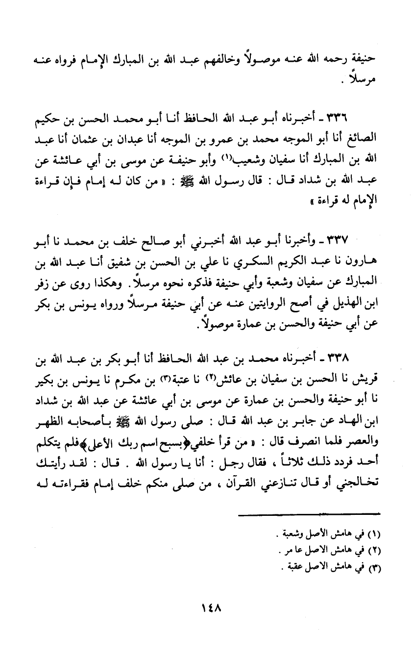 336 - أَخْبَرَنَاهُ أَبُو عَبْدِ اللَّهِ الْحَافِظُ , أنا أَبُو مُحَمَّدٍ الْحَسَنُ بْنُ حَلِيمٍ الصَّائِغُ , أنا أَبُو الْمُوَجَّهِ مُحَمَّدُ بْنُ عَمْرو بْنِ الْمُوَجَّهِ أنا عَبْدَانُ بْنُ عُثْمَانَ , أنا عَبْدُ اللَّهِ بْنُ الْمُبَارَكِ , أنا سُفْيَانُ , وَشُعْبَةُ , وَأَبُو حَنِيفَةَ , عَنْ مُوسَى بْنِ أَبِي عَائِشَةَ , عَنْ عَبْدِ اللَّهِ بْنِ شَدَّادٍ , قَالَ: قَالَ رَسُولُ اللَّهِ صَلَّى اللهُ عَلَيْهِ وَسَلَّمَ: §«مَنْ كَانَ لَهُ إِمَامٌ فَإِنَّ قِرَاءَةَ الْإِمَامِ لَهُ قِرَاءَةٌ»