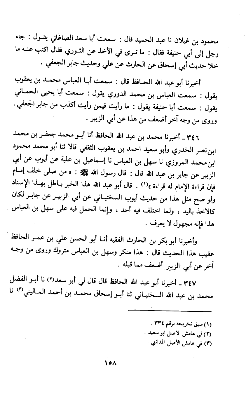 346 - أَخْبَرَنَا مُحَمَّدُ بْنُ عَبْدِ اللَّهِ الْحَافِظُ , أنا أَبُو مُحَمَّدٍ جَعْفَرُ بْنِ مُحَمَّدِ بْنِ نَصْرٍ الْخُلْدِيُّ وَأَبُو سَعِيدٍ أَحْمَدُ بْنُ يَعْقُوبَ الثَّقَفِيُّ قَالَا: ثنا أَبُو مُحَمَّدٍ مَحْمُودُ بْنُ مُحَمَّدٍ المَرْوَزِيُّ نا سَهْلُ بْنُ الْعَبَّاسِ , نا إِسْمَاعِيلُ بْنُ عُلَيَّةَ , عَنْ أَيُّوبَ , عَنْ أَبِي الزُّبَيْرِ , عَنْ جَابِرِ بْنِ عَبْدِ اللَّهِ , قَالَ: قَالَ رَسُولُ اللَّهِ صَلَّى اللهُ عَلَيْهِ وَسَلَّمَ: §«مَنْ صَلَّى خَلْفَ إِمَامٍ فَإِنَّ قِرَاءَةَ الْإِمَامِ لَهُ قِرَاءَةٌ» قَالَ أَبُو عَبْدِ اللَّهِ: هَذَا الْخَبَرُ بَاطِلٌ بِهَذَا الْإِسْنَادِ , وَلَوْ صَحَّ مِثْلُ هَذَا مِنْ حَدِيثِ أَيُّوبَ السَّخْتِيَانِيِّ عَنْ أَبِي الزُّبَيْرِ عَنْ جَابِرٍ لَكَانَ كَالْأَخْذِ بِالْيَدِ وَلَمَا اخْتَلَفَ فِيهِ أَحَدٌ , وَإِنَّمَا الْحَمْلُ فِيهِ عَلَى سَهْلِ بْنِ الْعَبَّاسِ هَذَا فَإِنَّهُ مَجْهُولٌ لَا يُعْرَفُ وَأَخْبَرَنَا أَبُو بَكْرِ بْنِ الْحَارِثِ الْفَقِيهُ أَنَا أَبُو الْحَسَنِ عَلِيُّ بْنُ عُمَرَ الْحَافِظُ عُقَيْبَ هَذَا الْحَدِيثِ قَالَ: هَذَا مُنْكَرٌ , وَسَهْلُ بْنُ الْعَبَّاسِ مَتْرُوكٌ وَرَوَى مِنْ وَجْهٍ آخَرَ عَنْ أَبِي الزُّبَيْرِ أَضْعَفُ مِمَّا قَبْلَهُ