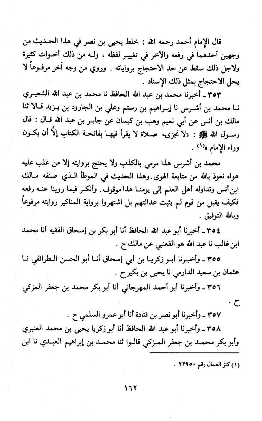 353 - أَخْبَرَنَا مُحَمَّدُ بْنُ عَبْدِ اللَّهِ الْحَافِظُ , نا مُحَمَّدُ بْنُ عَبْدِ اللَّهِ الشَّعِيرِيُّ , نا مُحَمَّدُ بْنُ أَشْرَسَ , نا إِبْرَاهِيمُ بْنُ رُسْتُمَ , وَعَلِيُّ بْنُ الْجَارُودِ بْنِ يَزِيدَ , قَالَا: ثنا مَالِكُ بْنُ أَنَسٍ , عَنْ أَبِي نُعَيْمٍ , وَهْبِ بْنِ كَيْسَانَ عَنْ جَابِرِ بْنِ عَبْدِ اللَّهِ , قَالَ: قَالَ رَسُولُ اللَّهِ صَلَّى اللهُ عَلَيْهِ وَسَلَّمَ: §«لَا تُجْزِئُ صَلَاةٌ لَا يُقْرَأُ فِيهَا بِفَاتِحَةِ الْكِتَابِ إِلَّا أَنْ يَكُونَ وَرَاءَ الْإِمَامِ» مُحَمَّدُ بْنُ أَشْرَسَ هَذَا مَرْمِيٌّ بِالْكَذِبِ , وَلَا يَحْتَجُّ بِرِوَايَتِهِ إِلَّا مَنْ غَلَبَ عَلَيْهِ هَوَاهُ , نَعُوذُ بِاللَّهِ مِنْ مُتَابَعَةِ الْهَوَى وَهَذَا الْحَدِيثُ فِي الْمُوَطَّأِ الَّذِي صَنَّفَهُ مَالِكُ بْنُ أَنَسٍ وَتَدَاوَلَهُ أَهْلُ الْعِلْمِ إِلَى يَوْمَنَا هَذَا مَوْقُوفٌ وَأَنْكَرَ فِيمَا رَوَيْنَا عَنْهُ رَفَعَهُ , فَكَيْفَ يُقْبَلُ مِنْ قَوْمٍ لَمْ تَثْبُتْ عَدَالَتُهُمْ بَلِ اشْتَهَرُوا بِرِوَايَةِ الْمَنَاكِيرِ؟ رِوَايَتَهُ مَرْفُوعًا وَبِاللَّهِ التَّوْفِيقُ