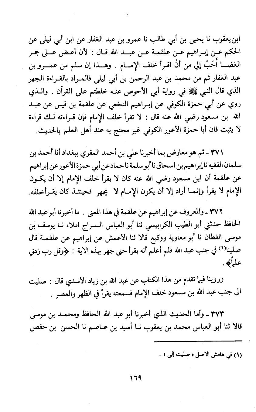 371 - ثُمَّ هُوَ مُعَارَضٌ بِمَا أَخْبَرَنَا عَلِيُّ بْنُ أَحْمَدَ الْمُقْرِئُ , بِبَغْدَادَ أنا أَحْمَدُ بْنُ سَلْمَانَ الْفَقِيهَ , نا إِبْرَاهِيمُ بْنُ إِسْحَاقَ , نا أَبُو سَلَمَةُ , نا حَمَّادٍ , عَنْ أَبِي حَمْزَةَ الْأَعْوَرِ , عَنْ إِبْرَاهِيمَ , عَنْ عَلْقَمَةَ , «أَنَّ ابْنَ مَسْعُودٍ , رَضِيَ اللَّهُ عَنْهُ كَانَ §لَا يَقْرَأُ خَلْفَ الْإِمَامِ إِلَّا أَنْ يَكُونَ الْإِمَامُ لَا يَقْرَأُ» وَإِنَّمَا أَرَادَ إِلَّا أَنْ يَكُونَ الْإِمَامُ لَا يَجْهَرُ , فَحِينَئِذٍ كَانَ يَقْرَأُ خَلْفَهُ