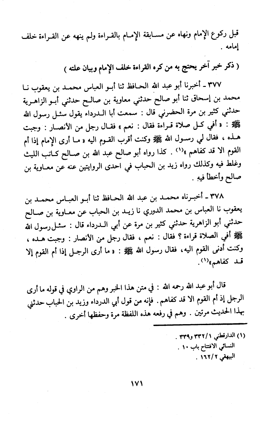 378 - أَخْبَرَنَاهُ مُحَمَّدُ بْنُ عَبْدِ اللَّهِ الْحَافِظُ , ثنا أَبُو الْعَبَّاسِ مُحَمَّدُ بْن يَعْقُوبَ نا الْعَبَّاسُ بْنُ مُحَمَّدٍ الدُّورِيُّ , نا زَيْدُ بْنُ الْحُبَابِ , عَنْ مُعَاوِيَةَ بْنِ صَالِحٍ , حدَّثَنِي أَبُو الزَّاهِرِيَّةِ , حدَّثَنِي كَثِيرُ بْنُ مُرَّةَ , عَنْ أَبِي الدَّرْدَاءِ , قَالَ: سُئِلَ رَسُولُ اللَّهِ صَلَّى اللهُ عَلَيْهِ وَسَلَّمَ: أَفِي الصَّلَاةِ قِرَاءَةٌ؟ فَقَالَ: «نَعَمْ» فَقَالَ رَجُلٌ مِنَ الْأَنْصَارِ: وَجَبَتْ هَذِهِ , وَكُنْتُ أَدْنَى الْقَوْمِ إِلَيْهِ فَقَالَ رَسُولُ اللَّهِ صَلَّى اللهُ عَلَيْهِ وَسَلَّمَ: §«مَا أَرَى الرَّجُلَ إِذَا أَمَّ الْقَوْمَ إِلَّا قَدْ كَفَاهُمْ» قَالَ أَبُو عَبْدِ اللَّهِ رَحِمَهُ اللَّهُ: فِي مَتْنِ هَذَا الْخَبَرِ وَهْمٌ مِنَ الرَّاوِي فِي قَوْلِهِ: مَا أَرَى الرَّجُلَ إِذَا أَمَّ الْقَوْمَ إِلَّا قَدْ كَفَاهُمْ فَإِنَّهُ مِنْ قَوْلِ أَبِي الدَّرْدَاءِ , وَزَيْدُ بْنُ الْحُبَابِ حدَّثَنِي بِهَذَا الْحَدِيثِ مَرَّتَيْنِ وَهِمِ فِي رَفْعِهِ هَذِهِ اللَّفْظَةَ مَرَّةً , وَحفِظَهَا أُخْرَى -[172]-