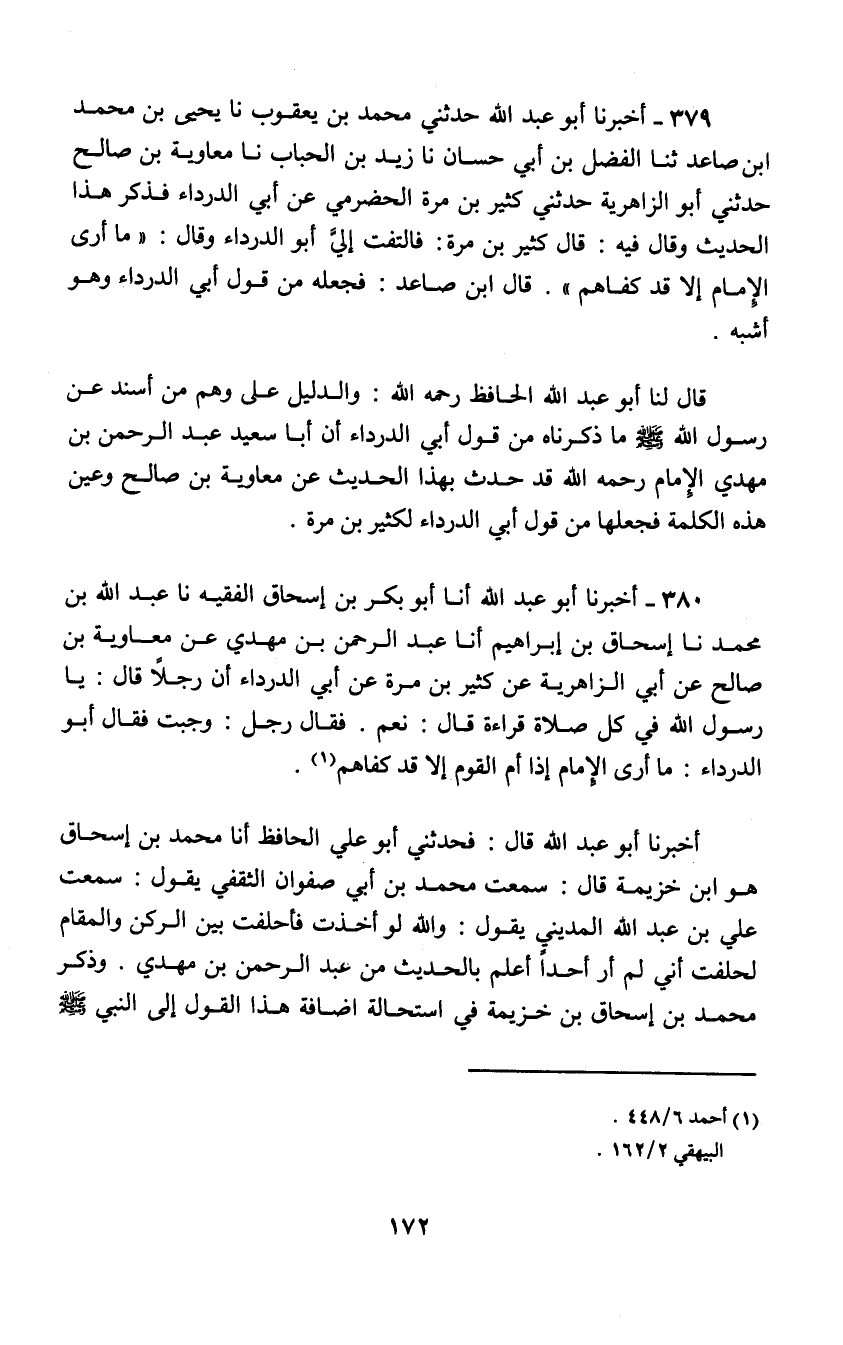 380 - أَخْبَرَنَا أَبُو عَبْدِ اللَّهِ , أنا أَبُو بَكْرِ بْنُ إِسْحَاقَ الْفَقِيهُ , نا عَبْدُ اللَّهِ بْنُ مُحَمَّدٍ , نا إِسْحَاقُ بْنُ إِبْرَاهِيمَ , أنا عَبْدُ الرَّحْمَنِ بْنُ مَهْدِيٍّ , عَنْ مُعَاوِيَةَ بْنِ صَالِحٍ , عَنْ أَبِي الزَّاهِرِيَّةِ , عَنْ كَثِيرِ بْنِ مُرَّةَ , عَنْ أَبِي الدَّرْدَاءِ , " أَنَّ رَجُلًا قَالَ: يَا رَسُولَ اللَّهِ , §فِي كُلِّ صَلَاةٍ قِرَاءَةٌ؟ قَالَ: «نَعَمْ» فَقَالَ رَجُلٌ: وَجَبَتْ , فَقَالَ أَبُو الدَّرْدَاءِ: مَا أَرَى الْإِمَامَ إِذَا أَمَّ الْقَوْمَ إِلَّا قَدْ كَفَاهُمْ " أَخْبَرَنَا أَبُو عَبْدِ اللَّهِ قَالَ: فَحدَّثَنِي أَبُو عَلِيٍّ الْحَافِظُ أَنَا مُحَمَّدُ بْنُ إِسْحَاقَ هُوَ ابْنُ خُزَيْمَةَ قَالَ: سَمِعْتُ مُحَمَّدَ بْنَ أَبِي صَفْوَانَ الثَّقَفِيَّ يَقُولُ: سَمِعْتُ عَلِيَّ بْنَ عَبْدِ اللَّهِ الْمَدِينِيَّ يَقُولُ: وَاللَّهِ لَوْ أُخِذْتُ فَأُحْلِفْتُ بَيْنَ الرُّكْنِ وَالْمَقَامِ لَحلَفْتُ أَنِّي لَمْ أَرَ أَحَدًا أَعْلَمَ بِالْحَدِيثِ مِنْ عَبْدِ الرَّحْمَنِ بْنِ مَهْدِيٍّ وَذَكَرَ مُحَمَّدُ بْنُ إِسْحَاقَ بْنِ خُزَيْمَةَ فِي اسْتِحَالَةِ إِضَافَةِ هَذَا الْقَوْلِ إِلَى النَّبِيِّ صَلَّى اللهُ عَلَيْهِ وَسَلَّمَ -[173]- فَصْلًا طَوِيلًا فَمِنَ الْمُحَالِ: أَنْ يَقُولَ النَّبِيُّ صَلَّى اللهُ عَلَيْهِ وَسَلَّمَ: «مَا أَرَى الرَّجُلَ إِذَا أَمَّ الْقَوْمَ إِلَّا قَدْ كَفَاهُمْ» فَيَقُولُ فِي دِينِ اللَّهِ عَلَى الْحُسْبَانِ وَالظَّنِّ وَالِارْتِيَاءِ , وَإِذَا كَانَ النَّبِيُّ الْمُصْطَفَى صَلَّى اللهُ عَلَيْهِ وَسَلَّمَ يَشُكُّ وَيَرْتَأِي فِي اجْتِزَاءِ قِرَاءَةِ الْإِمَامِ عَنِ الْمَأْمُومِينَ , فَمَنْ هَذَا الَّذِي يَتَيَقَّنُ ذَلِكَ وَيَعْرِفُهُ وَاللَّهُ تَعَالَى إِنَّمَا اخْتَارَهُ مِنْ بَيْنِ الْأَنَامِ لِيُعَلِّمَهُمْ مَا افْتَرَضَ عَلَيْهِمْ يَتَنَفَّلُونَ بِهِ , وَهَذَا الْقَوْلُ إِنَّمَا يَلِيقُ بِأَبِي الدَّرْدَاءِ دُونَ النَّبِيِّ صَلَّى اللهُ عَلَيْهِ وَسَلَّمَ , وَقَوْلُ أَبِي الدَّرْدَاءِ الَّذِي قَالَهُ عَلَى الِارْتِيَاءِ وَالظَّنِّ لَا يُوجِبُ حُكَمًا بَعْدَ إِعْلَامِ النَّبِيِّ صَلَّى اللهُ عَلَيْهِ وَسَلَّمَ بِالْيَقِينِ أَنَّ فِي كُلِّ صَلَاةٍ قِرَاءَةً بِقَوْلِهِ بَعْدَ سُؤَالِ السَّائِلِ: نَعَمْ وَقَوْلِ مِنْ قَالَ: وَجَبَتْ وَلَمْ يُنْكِرْ عَلَيْهِ , فَهَذَا مِنْ رَسُولِ اللَّهِ صَلَّى اللهُ عَلَيْهِ وَسَلَّمَ يَقِينٌ , وَقَوْلُ أَبِي الدَّرْدَاءِ رَضِيَ اللَّهُ عَنْهُ ظَنٌّ وَارْتِيَاءٌ وَالظَّنُّ لَا يُغْنِي مِنَ الْحقِّ شَيْئًا فَإِنَّهُ رُبَّمَا يُخْطِئ. قَاَلَ الْإِمَامُ أَحْمَدُ رَحِمَهُ اللَّهُ: وَقَدْ وَافَقَ عَبْدَ الرَّحْمَنِ بْنَ مَهْدِيٍّ عَبْدُ اللَّهِ بْنُ وَهْبٍ الْمِصْرِيُّ عَنْ مُعَاوِيَةَ بْنِ صَالِحٍ فِي إِضَافَةِ هَذَا الْقَوْلِ إِلَى أَبِي الدَّرْدَاءِ