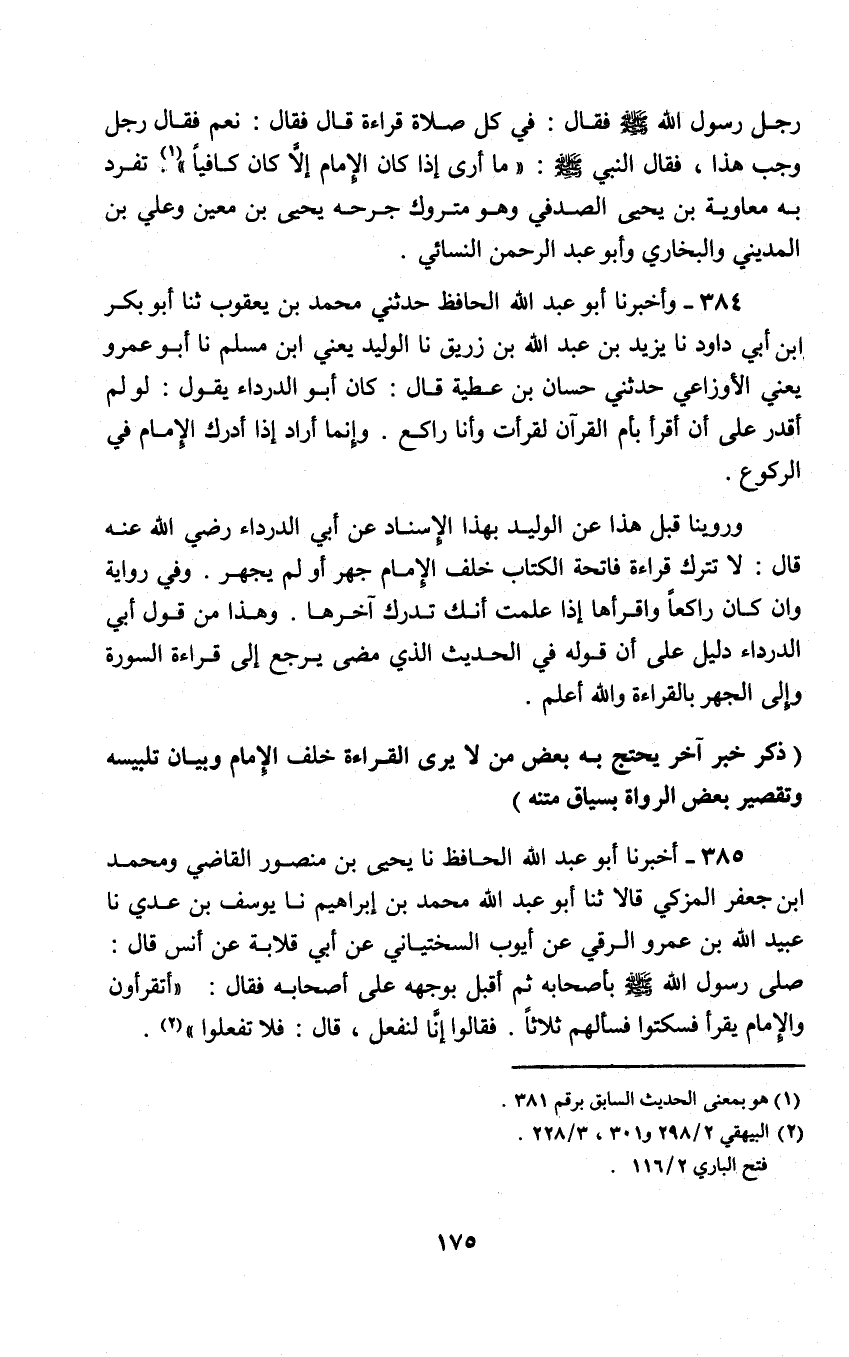 385 - أَخْبَرَنَا أَبُو عَبْدِ اللَّهِ الْحَافِظُ نا يَحْيَى بْنُ مَنْصُورٍ الْقَاضِي وَمُحَمَّدُ بْنُ جَعْفَرٍ الْمُزَكِيُّ قَالَا: ثنا أَبُو عَبْدِ اللَّهِ مُحَمَّدُ بْنُ إِبْرَاهِيمَ نا يُوسُفُ بْنُ عَدِيٍّ , نا عُبَيْدُ اللَّهِ بْنُ عُمَرٍو الرَّقِّيُّ , عَنْ أَيُّوبَ السَّخْتِيَانِيِّ , عَنْ أَبِي قِلَابَةَ , عَنْ أَنَسٍ , قَالَ: صَلَّى رَسُولُ اللَّهِ صَلَّى اللهُ عَلَيْهِ وَسَلَّمَ بِأَصْحَابِهِ ثُمَّ أَقْبَلَ بِوَجْهِهِ عَلَى أَصْحَابِهِ فَقَالَ: §«أتَقْرَأُونَ وَالْإِمَامُ يَقْرَأُ؟» فَسَكَتُوا , فَسَأَلَهُمْ ثَلَاثًا , فَقَالُوا: إِنَّا لَنَفْعَلُ قَالَ: «فَلَا تَفْعَلُوا» -[176]- قَالَ: لَنَا أَبُو عَبْدِ اللَّهِ رَحِمَهُ اللَّهُ فِيمَا قُرِئَ عَلَيْهِ: قَصَّرَ بِهِ يُوسُفُ بْنُ عَدِيٍّ , وَقَدْ رَوَى الْخَبَرَ بِالتَّمَامِ عَبْدُ اللَّهِ بْنُ جَعْفَرٍ الرَّقِّيُّ وَيَحْيَى بْنُ يُوسُفَ الزِّمِّيُّ وَمَخْلَدُ بْنُ الْحُسَيْنِ عَنْ عُبَيْدِ اللَّهِ بْنِ عَمَرٍو الرَّقِّيِّ قَاَلَ الْإِمَامُ أَحْمَدُ رَحِمَهُ اللَّهُ: وَقَدْ ذَكَرْنَا الرِّوَايَةَ عَنْهُمْ فِي هَذَا الْكِتَابِ وَعَنْ عَبْدِ السَّلَامِ بْنِ عَبْدِ الْحَمِيدِ , عَنْ عُبَيْدِ اللَّهِ بْنِ عَمْرٍو بِإِسْنَادِهِ هَذَا عَنِ النَّبِيِّ صَلَّى اللهُ عَلَيْهِ وَسَلَّمَ وَقَالُوا فِي الْحَدِيثِ: «فَلَا تَفْعَلُوا وَلْيَقْرَأْ أَحَدُكُمْ بِفَاتِحَةِ الْكِتَابِ فِي نَفْسِهِ» وَرَأَيْتُ فِي كِتَابِ مِنَ احْتَجَّ فِي تَرْكِ الْقِرَاءَةِ خَلْفَ الْإِمَامِ بِأَخْبَارٍ وَاهِيَةٍ احْتَجَّ بِرِوَايَةِ يُوسُفَ بْنِ عَدِيٍّ الَّذِي قَصَّرَ بِرِوَايَتِهِ عَنْ عُبَيْدِ اللَّهِ بْنِ عَمْرٍو ثُمَّ أَرْدَفَهُ بِرِوَايَةِ مَخْلَدِ بْنِ الْحُسَيْنِ عَنْ عُبَيْدِ اللَّهِ بْنِ عَمْرٍو وَزَادَ فِي مَتْنِهِ أَلِفًا لَمْ نَجَدْ لَهُ فِيمَا زَادَ مُتَابِعًا فَقَالَ: «فَلَا تَفْعَلُوا أَوْ لَيَقْرَأْ أَحَدُكُمْ بِفَاتِحَةِ الْكِتَابِ فِي نَفْسِهِ»
