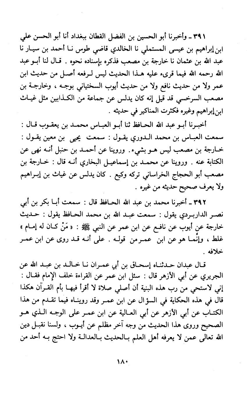 وَرُوِيَ هَذَا الْحَدِيثُ مِنْ وَجْهٍ آخَرَ مظْلِمٍ عَنْ أَيُّوبَ , وَلَسْنَا نَقْبَلُ دَيْنَ اللَّهِ تَعَالَى عَمَّنْ لَا يَعْرِفُهُ أَهْلُ الْعِلْمِ بِالْحَدِيثِ بِالْعَدَالَةِ وَلَا احْتَجَّ بِهِ أَحَدٌ مِنَ -[181]- الْمُتَقَدِّمِينَ مِنْ عُلَمَاءِ أَهْلِ الْكُوفَةِ أَخْبَرَنَا أَبُو بَكْرِ بْنِ الْحَارِثِ الْفَقِيهُ أنا عَلِيُّ بْنُ عُمَرَ الْحَافِظُ عُقَيْبَ حَدِيثِ خَارِجَةَ عَنْ أَيُّوبَ رَفَعَهُ: وَهِمَ , وَالصَّوَابُ عَنْ أَيُّوبَ مَا حَدَّثَنَا بِهِ مُحَمَّدُ بْنُ مَخْلَدٍ نا عَبْدُ اللَّهِ بْنُ أَحْمَدَ بْنِ حَنْبَلٍ حدَّثَنِي أَبِي ثنا إِسْمَاعِيلُ بْنُ عَلِيٍّةَ نا أَيُّوبُ عَنْ نَافِعً وَأَنَسِ بْنِ سِيرِينَ أَنَّهُمَا حدَّثَاهُ عَنِ ابْنِ عُمَرَ " أَنَّهُ §قَالَ فِي الْقِرَاءَةِ خَلْفَ الْإِمَامِ: يَكْفِيكَ قِرَاءَةُ الْإِمَامِ " وَرُوِي عَنْ عُبَيْدِ اللَّهِ بْنِ عُمَرَ عَنْ نَافِعٍ مَرْفُوعًا