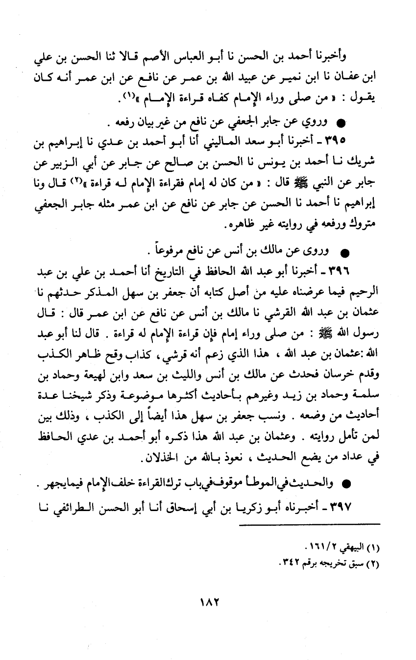 396 - أَخْبَرَنَا أَبُو عَبْدِ اللَّهِ الْحَافِظُ , فِي التَّارِيخِ أنا أَحْمَدُ بْنُ عَلِيِّ بْنِ عَبْدِ الرَّحِيمِ , فِيمَا عَرَضْنَاهُ عَلَيْهِ مِنْ أَصْلِ كِتَابِهِ أَنَّ جَعْفَرَ بْنَ سَهْلٍ الْمُذَكِّرَ حدَّثَهُمْ نا عُثْمَانُ بْنُ عَبْدِ اللَّهِ الْقُرَشِيُّ نا مَالِكُ بْنُ أَنَسً عَنْ نَافِعٍ عَنِ ابْنِ عُمَرَ قَالَ: قَالَ رَسُولُ اللَّهِ صَلَّى اللهُ عَلَيْهِ وَسَلَّمَ: §«مَنْ صَلَّى وَرَاءَ إِمَامٍ فَإِنَّ قِرَاءَةَ الْإِمَامِ لَهُ قِرَاءَةٌ» قَالَ: لَنَا أَبُو عَبْدِ اللَّهِ: عُثْمَانُ بْنُ عَبْدِ اللَّهِ هَذَا الَّذِي زَعَمَ أَنَّهُ قُرَشِيٌّ كَذَّابٌ وَقِحٌ ظَاهَرُ الْكَذِبِ وَقَدِمَ خُرَاسَانَ فَحدَّثَ عَنْ مَالِكِ بْنِ أَنَسٍ وَاللَّيْثِ بْنِ سَعْدٍ وَابْنِ لُهَيْعَةَ وَحَمَّادِ بْنِ سَلَمَةَ , وَحَمَّادِ بْنِ زَيْدٍ وَغَيْرِهِمْ بِأَحَادِيثَ أَكْثَرِهَا مَوْضُوعَةٌ وَذَكَرَ شَيْخُنَا عِدَّةُ أَحَادِيثَ مِنْ وَضْعِهِ وَنَسَبَ جَعْفَرَ بْنَ سَهْلٍ هَذَا أَيْضًا إِلَى الْكَذِبِ , وَذَلِكَ بَيِّنٌ لِمَنْ تَأْمُلَ رِوَايَتَهُ وَعُثْمَانُ بْنُ عَبْدِ اللَّهِ هَذَا ذَكَرَهُ أَبُو أَحْمَدَ بْنُ عَدِيٍّ الْحَافِظُ فِي عِدَادِ مَنْ يضَعُ الْحَدِيثَ نَعُوذُ بِاللَّهِ مِنَ الْخِذْلَانِ وَالْحَدِيثُ فِي الْمُوَطَّأِ مَوْقُوفٌ فِي بَابِ تَرْكِ الْقِرَاءَةِ خَلْفَ الْإِمَامِ فِيمَا يَجْهَرُ