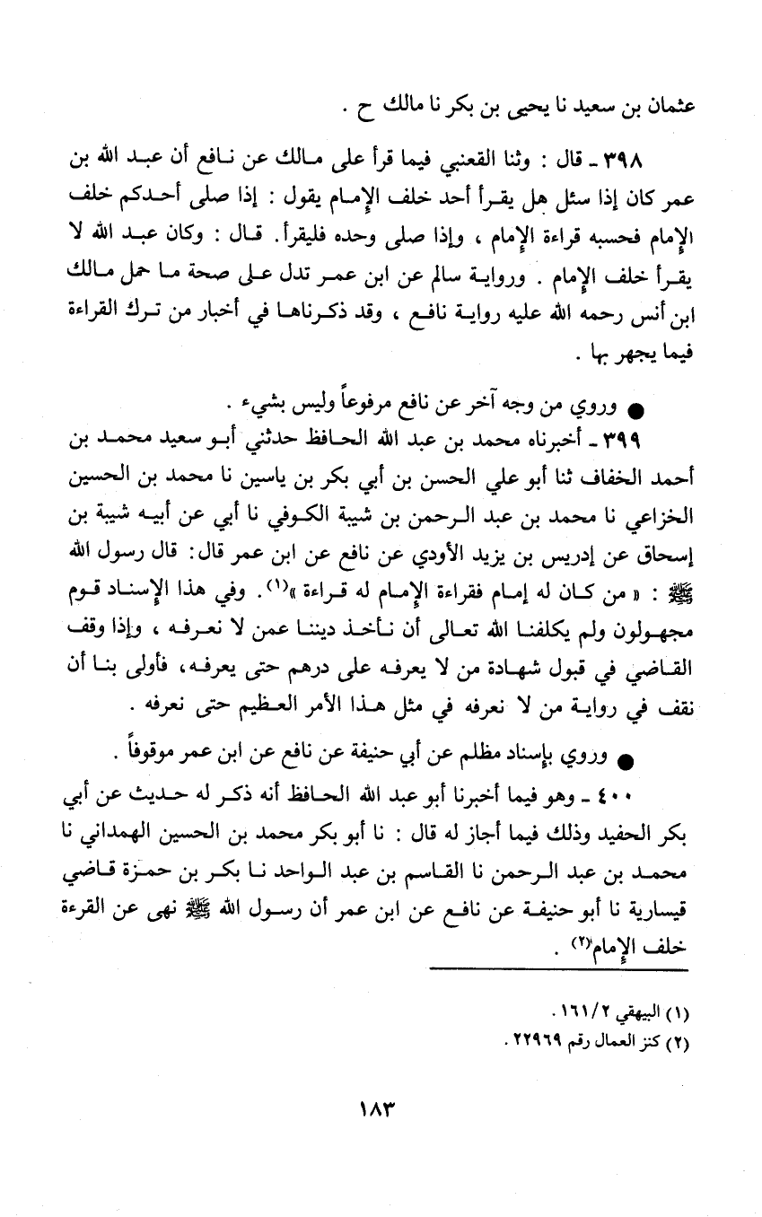 399 - أَخْبَرَنَاهُ مُحَمَّدُ بْنُ عَبْدِ اللَّهِ الْحَافِظُ , حدَّثَنِي أَبُو سَعِيدٍ مُحَمَّدُ بْنُ أَحْمَدَ الْخَفَّافُ ثنا أَبُو عَلِيٍّ الْحَسَنُ بْنُ أَبِي بَكْرِ بْنِ يَاسِينَ , نا مُحَمَّدُ بْنُ الْحُسَيْنِ الْخُزَاعِيُّ , نا مُحَمَّدُ بْنُ عَبْدِ الرَّحْمَنِ بْنِ شَيْبَةَ الْكُوفِيُّ , نا أَبِي , عَنْ أَبِيهِ , شَيْبَةَ بْنِ إِسْحَاقَ عَنْ إِدْرِيسَ بْنِ يَزِيدَ الْأَوْدِيِّ , عَنْ نَافِعٍ , عَنِ ابْنِ عُمَرَ , قَالَ: قَالَ رَسُولُ اللَّهِ صَلَّى اللهُ عَلَيْهِ وَسَلَّمَ: §«مَنْ كَانَ لَهُ إِمَامٌ فَقِرَاءَةُ الْإِمَامِ لَهُ قِرَاءَةٌ» وَفِي هَذَا الْإِسْنَادِ قَوْمٌ مَجْهُولُونَ وَلَمْ يُكَلَّفْنَا اللَّهُ تَعَالَى أَنْ نَأْخُذَ دِينَنَا عَمَّنْ لَا نَعْرِفُهُ , وَإِذَا وَقَفَ الْقَاضِي فِي قَبُولِ شَهَادَةِ مِنْ لَا يَعْرِفُهُ عَلَى دِرْهَمٍ حتَّى يَعْرِفَهُ فَأَوْلَى بِنَا أَنْ نَقِفَ فِي رِوَايَةِ مِنْ لَا نَعْرِفُهُ فِي مِثْلِ هَذَا الْأَمْرِ الْعَظِيمِ حتَّى نَعْرِفَهُ وَرُوِيَ بِإِسْنَادٍ مُظْلِمٍ عَنْ أَبِي حَنِيفَةَ عَنْ نَافِعٍ عَنِ ابْنِ عُمَرَ مَوْقُوفًا