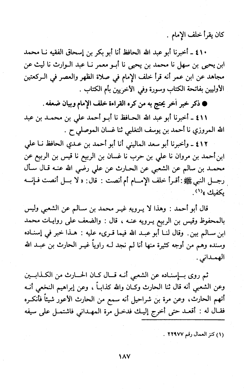 412 - وَأَخْبَرَنَا أَبُو سَعْدٍ الْمَالِينِيُّ , أنا أَبُو أَحْمَدَ بْنُ عَدِيٍّ الْحَافِظُ , نا عَلِيُّ بْنُ أَحْمَدَ بْنِ مَرْوَانَ , نا عَلِيُّ بْنُ حَرْبٍ , نا غَسَّانُ بْنُ الرَّبِيعِ , نا قَيْسُ بْنُ الرَّبِيعِ , عَنْ مُحَمَّدِ بْنِ سَالِمٍ , عَنِ الشَّعْبِي , عَنِ الْحَارِثِ , عَنْ عَلِي , رَضِيَ اللَّهُ عَنْهُ قَالَ: " سَأَلَ رَجُلٌ النَّبِيَّ صَلَّى اللهُ عَلَيْهِ وَسَلَّمَ: §أَقْرَأُ خَلْفَ الْإِمَامِ أَمْ أُنْصِتُ؟ قَالَ: «لَا بَلْ أَنْصِتْ فَإِنَّهُ يَكْفِيكَ» قَالَ أَبُو أَحْمَدَ: وَهَذَا لَا يَرْوِيهِ غَيْرُ مُحَمَّدِ بْنِ سَالِمٍ عَنِ الشَّعْبِيِّ , وَلَيْسَ بِالْمَحْفُوظِ , وَقَيْسُ بْنُ الرَّبِيعِ يَرْوِيهِ عَنْهُ قَالَ: وَالضَّعْفُ عَلَى رِوَايَاتِ مُحَمَّدِ بْنِ سَالِمٍ بَيِّنٌ وَقَالَ لَنَا أَبُو عَبْدِ اللَّهِ فِيمَا قُرِئَ عَلَيْهِ: هَذَا خَبَرٌ فِي إِسْنَادِهِ وَسَنَدِهِ وَهْمٌ مِنْ أَوْجُهٍ كَثِيرَةٍ مِنْهَا: أَنَّا لَمْ نَجِدْ لَهُ رَاوِيًا غَيْرَ الْحَارِثِ بْنِ عَبْدِ اللَّهِ الْهَمْدَانِيِّ , ثُمَّ رَوَى بِإِسْنَادِهِ عَنِ الشَّعْبِيِّ أَنَّهُ قَالَ: كَانَ الْحَارِثُ مِنَ الْكَذَّابَيْنِ وَعَنِ الشَّعْبِيِّ أَنَّهُ قَالَ: ثَنَا الْحَارِثُ وَكَانَ وَاللَّهِ كَذَّابًا وَعَنْ إِبْرَاهِيمَ النَّخَعِيِّ أَنَّهُ اتَّهَمَ الْحَارِثَ وَعَنْ مُرَّةَ بْنِ شَرَاحِيلَ أَنَّهُ سَمِعَ مِنَ الْحَارِثِ الْأَعْوَرِ شَيْئًا فَأَنْكَرَهُ فَقَالَ لَهُ: اقْعُدْ حتَّى أَخْرَجَ إِلَيْكَ , فَدَخَلَ مُرَّةُ الْهَمَدَانِيُّ فَاشْتَمَلَ عَلَى سَيْفِهِ , -[188]- وَحسَّ الْحَارِثُ بِالشَّرِّ فَذَهَبَ وَعَنْ أَبِي بَكْرِ بْنِ أَبِي خَيْثَمَةَ قَالَ: سُئِلَ يَحْيَى بْنُ مَعِينٍ عَنِ الْحَارِثِ صَاحِبِ عَلِي رَضِيَ اللَّهُ عَنْهُ فَقَالَ: ضَعِيفٌ فَمَا ظَنُّكُمْ بِمَنْ يسْتَحِلُّ مُرَّةُ بْنُ شَرَاحِيلَ قَتَلَهُ , وَعَامِرٌ الشَّعْبِيُّ وَإِبْرَاهِيمُ النَّخَعِيُّ جَرْحَهُ وَعَنْ يَحْيَى وَعَبْدِ الرَّحْمَنِ أَنَّهُمَا كَانَا لَا يُحَدِّثَانِ عَنْ أَبِي إِسْحَاقَ عَنِ الْحَارِثِ عَنْ عَلِي رَضِيَ اللَّهُ عَنْهُ قَالَ أَبُو عَبْدِ اللَّهِ رَحِمَهُ اللَّهُ: ثُمَّ نَظَرْنَا فَإِذَا رَاوِي هَذَا الْخَبَرِ عَنِ الشَّعْبِيِّ أَبُو سَهْلٍ مُحَمَّدُ بْنُ سَالِمٍ وَشَأْنُهُ عِنْدَ أَئِمَّةِ أَهْلِ الْعِلْمِ قَرِيبٌ مِنْ شَأْنِ الْحَارِثِ بْنِ عَبْدِ اللَّهِ الْهَمْدَانِيِّ ثُمَّ رَوَى بِإِسْنَادِهِ عَنْ يَحْيَى الْقَطَّانِ وَعَبْدِ الرَّحْمَنِ أَنَّهُمَا كَانَا لَا يُحدِّثَانِ عَنْ مُحَمَّدِ بْنِ سَالِمٍ , ثُمَّ رَوَى جَرْحَهُ عَنْ عَبْدِ اللَّهِ بْنِ الْمُبَارَكِ وَيَحْيَى بْنِ مَعِينٍ وَالْبُخَارِيِّ قَالَ أَبُو عَبْدِ اللَّهِ: ثُمَّ نَظَرْنَا فَإِذَا رَاوِي هَذَا الْخَبَرِ عَنْ مُحَمَّدِ بْنِ سَالِمٍ قَيْسُ بْنُ الرَّبِيعِ وَشَأْنُهُ يَقْرُبُ مِنْ شَأْنِ صَاحِبَيْهِ مُحَمَّدِ بْنِ سَالِمٍ وَالْحَارِثِ , ثُمَّ رَوَى بِإِسْنَادِهِ عَنْ يَحْيَى وَعَبْدِ الرَّحْمَنِ بْنِ مَهْدِيٍّ أَنَّهُمَا كَانَا لَا يُحدِّثَانِ عَنْهُ وَرُوِي عَنْ يَحْيَى بْنِ مَعِينٍ وَالْبُخَارِيِّ وَغَيْرِهِمَا مِنَ الْأَئِمَّةِ تَضْعِيفُهُ , ثُمَّ رَوَى عَنْ عَلِي رَضِيَ اللَّهُ عَنْهُ أَمَرَهُ بِالْقِرَاءَةِ خَلْفَ الْإِمَامِ وَقَدْ ذَكَرْنَاهُ فِيمَا مَضَى قَاَلَ الْإِمَامُ أَحْمَدُ رَحِمَهُ اللَّهُ: وَقَدْ قِيلَ: فِي هَذَا الْحَدِيثِ عَنْ مُحَمَّدِ بْنِ سَالِمٍ عَنِ الشَّعْبِيِّ عَنِ النَّبِيِّ صَلَّى اللهُ عَلَيْهِ وَسَلَّمَ مُرْسَلًا