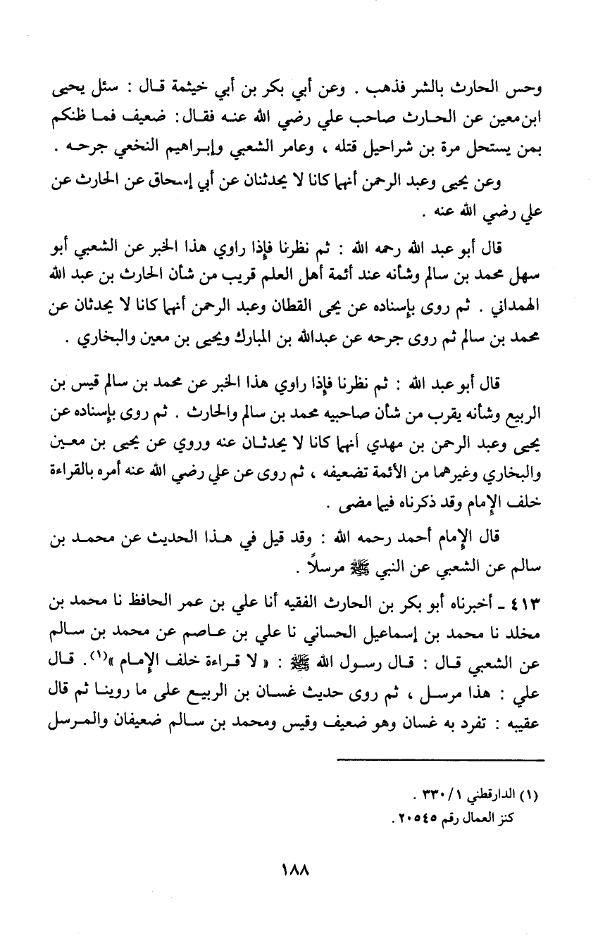 413 - أَخْبَرَنَاهُ أَبُو بَكْرِ بْنِ الْحَارِثِ الْفَقِيهُ , أنا عَلِيُّ بْنُ عُمَرَ الْحَافِظُ , نا مُحَمَّدُ بْنُ مَخْلَدٍ , نا مُحَمَّدُ بْنُ إِسْمَاعِيلَ الْحَسَّانيُّ , نا عَلِيُّ بْنُ عَاصِمٍ , عَنْ مُحَمَّدِ بْنِ سَالِمٍ , عَنِ الشَّعْبِيِّ , قَالَ: قَالَ رَسُولُ اللَّهِ صَلَّى اللهُ عَلَيْهِ وَسَلَّمَ: «§لَا قِرَاءَةَ خَلْفَ الْإِمَامِ» قَالَ عَلِيٌّ: هَذَا مُرْسَلٌ ثُمَّ رَوَى حَدِيثَ غَسَّانِ بْنِ الرَّبِيعِ عَلَى مَا رَوَيْنَا , ثُمَّ قَالَ: عُقَيْبَهُ: تَفَرَّدَ بِهِ غَسَّانٌ وَهُوَ ضَعِيفٌ , وَقَيْسٌ , وَمُحَمَّدُ بْنُ سَالِمٍ ضَعِيفَانِ , وَالْمُرْسَلُ -[189]- الَّذِي قَبْلَهُ أَصَحُّ مِنْهُ , وَاللَّهُ أَعْلَمُ هَذَا قَوْلُ الدَّارَقُطْنِيِّ فِي كِتَابِهِ فَنَقَلَ مَنْ جَمَعَ فِي هَذِهِ الْمَسْأَلَةِ مَا وَجَدَ مِنَ الْأَخْبَارِ قَوْلَ أَبِي الْحَسَنِ الدَّارَقُطْنِيِّ رَحِمَهُ اللَّهُ: الْمُرْسَلُ الَّذِي قَبْلَهُ أَصَحُّ مِنْهُ , وَلَمْ يَنْقُلْ قَوْلَهُ فِي غَسَّانِ بْنِ الرَّبِيعِ , وَقَيْسِ بْنِ الرَّبِيعِ , وَمُحَمَّدِ بْنِ سَالِمٍ ثُمَّ قَالَ: لَمْ يُقْدَحْ فِيهِ إِلَّا مِنْ حيْثُ الْإِرْسَالِ , فَثَبَتَ أَنَّ رُوَاتَهُ ثِقَاتٌ , ثُمَّ أَطْلَقَ عَلَيْهِ لَفْظَ الصِحَّةِ حيْثُ قَالَ: هُوَ أَصَحُّ مِنْهُ وَهَذَا مِنْهُ تَلْبِيسٌ بَارِدٌ أَلَيْسَ قَدْ جُرِحَ مُحَمَّدُ بْنُ سَالِمٍ مَعَ صَاحِبَيْهِ؟ وَإِنَّمَا قَالَ: الْمُرْسَلُ الَّذِي قَبْلَهُ أَصَحُّ مِنْهُ لِأَنَّهُ لَمْ يَجْتَمِعْ مَعَهُ ضَعِيفَانِ آخَرَانِ , وَحِينَ أُرْسَلَ لَمْ يَزِدْ فِي التَّخْلِيطِ بِوَصْلِ الْحَدِيثِ وَكَيْفَ يَجُوزُ أَنْ يُقَالَ لَمْ يُقْدَحْ فِيهِ إِلَّا مِنْ حيْثُ الْإِرْسَالِ وَقَدْ قَالَ: مُحَمَّدُ بْنُ سَالِمٍ ضَعِيفٌ فِي هَذَا الْمَوْضِعِ وَفِي مَوَاضِعَ مِنْ كِتَابِهِ , فَهُوَ ضَعِيفٌ مِنْ حيْثُ أَنَّهُ مُرْسَلٌ وَضَعِيفٌ مِنْ حيْثُ رِوَايَةِ مُحَمَّدِ بْنِ سَالِمٍ؟ غَيْرَ أَنَّهُ لَمْ يَصَلِ الْحَدِيثَ فَهُوَ أَصَحُّ مِنْ رِوَايَةِ مِنْ زَادَ فِي التَّخْلِيطِ فَوَصَلَ الْحَدِيثَ وَيَحْتَمِلُ أَنْ يَكُونَ وَصْلُهُ جَاءَ مِنْ ضَعِيفَيْنِ بَعْدَهُ: قَيْسُ بْنُ الرَّبِيعِ وَغَسَّانُ بْنُ الرَّبِيعِ , فَكَانَتْ رِوَايَةُ مِنْ رَوَاهُ عَنْ مُحَمَّدِ بْنِ سَالِمٍ مُرْسَلًا أَصَحَّ مِنْ رِوَايَةِ مِنْ رَوَاهُ عَنْهُ مَوْصُولًا هَذَا مَعْنَى قَوْلِهِ , لَا أَنَّهُ حَكَمَ لِأَحَدِهِمَا بِالصِحَّةِ , وَبِاللَّهِ التوفيقُ وَفِيمَا أَنْبَأَنِي أَبُو عَبْدِ اللَّهِ الْحَافِظُ أَنَّ أَبَا عَلِيٍّ الْحُسَيْنَ بْنُ عَلِيٍّ الْحَافِظُ أَخْبَرَهُمْ قَالَ: حَدِيثُ مُحَمَّدِ بْنِ سَالِمٍ عَنِ الشَّعْبِيِّ عَنِ الْحَارِثِ عَنْ عَلِي رَضِيَ اللَّهُ عَنْهُ لَا تَتَفَكَرْ فِيهِ؛ فَإِنَّهُ حَدِيثٌ بَاطِلٌ , وَمُحَمَّدُ بْنُ سَالِمٍ مَتْرُوكُ الرِّوَايَةِ عَنْهُ , وَبِاللَّهِ التَّوْفِيقُ
