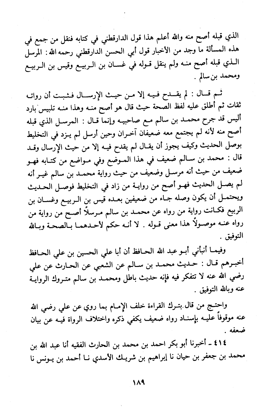 415 - وَأَنْبَأَنِي أَبُو عَبْدِ اللَّهِ الْحَافِظُ , إِجَازَةً أَنَّ أَبَا عَلِي الْحَافِظُ , أَخْبَرَهُمْ نا إِبْرَاهِيمُ بْنُ شَرِيكِ بْنِ الْفَضْلِ الْأَسَدِيُّ , نا أَحْمَدُ بْنُ يُونُسَ , نا الْحَسَنُ بْنُ صَالِحٍ , عَنِ ابْنِ أَبِي لَيْلَى , عَنِ ابْنِ الْأَصْبَهَانِيِّ , عَنِ الْمُخْتَارِ بْنِ عَبْدِ اللَّهِ , عَنْ عَلِي , رَضِيَ اللَّهُ عَنْهُ فِي §الَّذِي يَقْرَأُ خَلْفَ الْإِمَامِ: «لَيْسَ عَلَى الْفِطْرَةِ» رِوَايَةُ أَبِي عَلِيٍ أَصَحُّ مِنْ رِوَايَةِ ابْنِ حَيَّانَ فَقَدْ رَوَاهُ أَيْضًا مُحَمَّدُ بْنُ الْفَضْلِ بْنِ سَلَمَةَ عَنْ أَحْمَدَ بْنِ يُونُسَ عَنْ عَمْرِو بْنِ عَبْدِ الْغَفَّارِ , وَأَبِي شِهَابٍ وَالْحَسَنِ بْنِ صَالِحٍ عَنِ ابْنِ أَبِي لَيْلَى عَنِ ابْنِ الْأَصْبَهَانِيِّ