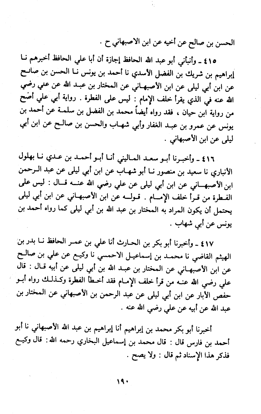 417 - وَأَخْبَرَنَا أَبُو بَكْرِ بْنِ الْحَارِثِ , أنا عَلِيُّ بْنُ عُمَرَ الْحَافِظُ , نا بَدْرُ بْنُ الْهَيْثَمِ الْقَاضِي , نا مُحَمَّدُ بْنُ إِسْمَاعِيلَ الْأَحْمَسِيُّ , نا وَكِيعٌ , عَنْ عَلِيِّ بْنِ صَالِحٍ , عَنِ ابْنِ الْأَصْبَهَانِيِّ , عَنِ الْمُخْتَارِ بْنِ عَبْدِ اللَّهِ بْنِ أَبِي لَيْلَى , عَنْ أَبِيهِ , قَالَ: قَالَ عَلِي رَضِيَ اللَّهُ عَنْهُ: §«مَنْ قَرَأَ خَلْفَ الْإِمَامِ فَقَدْ أَخْطَأَ الْفِطْرَةَ» وَكَذَلِكَ رَوَاهُ أَبُو حَفْصٍ الْأَبَّارُ عَنِ ابْنِ أَبِي لَيْلَى عَنْ عَبْدِ الرَّحْمَنِ بْنِ الْأَصْبَهَانِيِّ عَنِ الْمُخْتَارِ بْنِ عَبْدِ اللَّهِ عَنْ أَبِيهِ عَنْ عَلِيٍّ رَضِيَ اللَّهُ عَنْهُ أَخْبَرَنَا أَبُو بَكْرٍ مُحَمَّدُ بْنُ إِبْرَاهِيمَ أَنَا إِبْرَاهِيمُ بْنُ عَبْدِ اللَّهِ الْأَصْبَهَانِيِّ نَا أَبُو أَحْمَدَ بْنُ فَارِسٍ قَالَ: قَالَ مُحَمَّدُ بْنُ إِسْمَاعِيلَ الْبُخَارِيُّ رَحِمَهُ اللَّهُ: قَالَ وَكِيعٌ فَذَكَرَ هَذَا الْإِسْنَادَ ثُمَّ قَالَ: وَلَا يَصِحُّ -[191]- وَأَخْبَرَنَا أَبُو بَكْرِ بْنِ الْحَارِثِ الْفَقِيهُ أَنَا عَلِيُّ بْنُ عُمَرَ الْحَافِظُ قَالَ: خَالَفَهُ قَيْسُ بْنُ الرَّبِيعِ وَابْنُ أَبِي لَيْلَى عَنِ ابْنِ الْأَصْبَهَانِيِّ , وَلَا يَصِحُّ إِسْنَادُهُ قَاَلَ الْإِمَامُ أَحْمَدُ رَحِمَهُ اللَّهُ: أَمَّا رِوَايَةُ مُحَمَّدِ بْنِ عَبْدِ الرَّحْمَنِ بْنِ أَبِي لَيْلَى عَنِ ابْنِ الْأَصْبَهَانِيِّ فَقَدْ مَضَتْ , وَأَمَّا رِوَايَةُ قَيْسِ بْنِ الرَّبِيعِ
