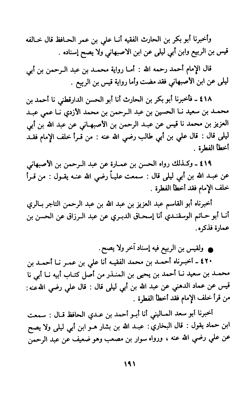418 - فَأَخْبَرَنَا أَبُو بَكْرِ بْنِ الْحَارِثِ , أنا أَبُو الْحَسَنِ الدَّارَقُطْنِيُّ , نا أَحْمَدُ بْنُ مُحَمَّدِ بْنِ سَعِيدٍ , نا الْحُسَيْنُ بْنُ عَبْدِ الرَّحْمَنِ بْنِ مُحَمَّدٍ الْأَزْدِيُّ , نا عَمِّي عَبْدُ الْعَزِيزِ بْنُ مُحَمَّدٍ , نا قَيْسٌ , عَنْ عَبْدِ الرَّحْمَنِ بْنِ الْأَصْبَهَانِيِّ , عَنْ عَبْدِ اللَّهِ بْنِ أَبِي لَيْلَى , قَالَ: قَالَ عَلِيُّ بْنُ أَبِي طَالِبٍ رَضِيَ اللَّهُ عَنْهُ: §«مَنْ قَرَأَ خَلْفَ الْإِمَامِ فَقَدْ أَخْطَأَ الْفِطْرَةَ»