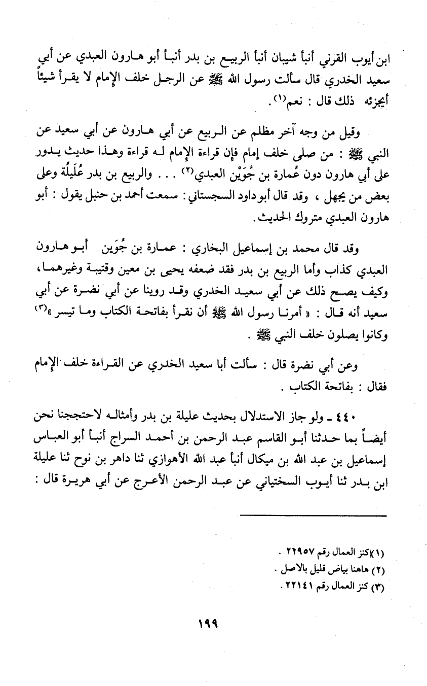 وَقِيلَ مِنْ وَجْهٍ آخَرَ مُظْلِمٍ عَنِ الرَّبِيعِ , عَنْ أَبِي هَارُونَ , عَنْ أَبِي سَعِيدٍ عَنِ النَّبِيِّ صَلَّى اللهُ عَلَيْهِ وَسَلَّمَ: §«مَنْ صَلَّى خَلْفَ إِمَامٍ فَإِنَّ قِرَاءَةَ الْإِمَامِ لَهُ قِرَاءَةٌ» وَهَذَا حَدِيثٌ يَدُورُ عَلَى أَبِي هَارُونَ دُونَ عُمَارَةَ بْنِ جُوَيْنٍ الْعَبْدِيِّ. . وَالرَّبِيعُ بْنُ بَدْرٍ عُلَيْلَةَ وَعَلَى بَعْضِ مَنْ يجْهَلُ وَقَدْ قَالَ أَبُو دَاوُدَ السِّجِسْتَانِيُّ: سَمِعْتُ أَحْمَدَ بْنَ حَنْبَلٍ يَقُولُ: أَبُو هَارُونَ الْعَبْدِيُّ مَتْرُوكُ الْحَدِيثِ. وَقَدْ قَالَ مُحَمَّدُ بْنُ إِسْمَاعِيلَ الْبُخَارِيُّ: عُمَارَةُ بْنُ جُوَيْنٍ أَبُو هَارُونَ الْعَبْديُّ كَذَّابٌ. وَأَمَّا الرَّبِيعُ بْنُ بَدْرٍ فَقَدْ ضَعَّفَهُ يَحْيَى بْنُ مَعِينٍ وَقُتَيْبَةُ وَغَيْرُهُمَا وَكَيْفَ يَصِحُّ ذَلِكَ عَنْ أَبِي سَعِيدٍ الْخُدْرِيِّ وَقَدْ رَوَيْنَا عَنْ أَبِي نَضْرَةَ عَنْ أَبِي سَعِيدٍ أَنَّهُ قَالَ: «أَمَرَنَا رَسُولُ اللَّهِ صَلَّى اللهُ عَلَيْهِ وَسَلَّمَ أَنْ نَقْرَأَ بِفَاتِحَةِ الْكِتَابِ وَمَا تَيَسَّرَ؟» وَكَانُوا يُصَلُّونَ خَلْفَ النَّبِيِّ صَلَّى اللهُ عَلَيْهِ وَسَلَّمَ وَعَنْ أَبِي نَضْرَةَ قَالَ: سَأَلْتُ أَبَا سَعِيدٍ الْخُدْرِيَّ عَنِ الْقِرَاءَةِ خَلْفَ الْإِمَامِ فَقَالَ: بِفَاتِحَةِ الْكِتَابِ