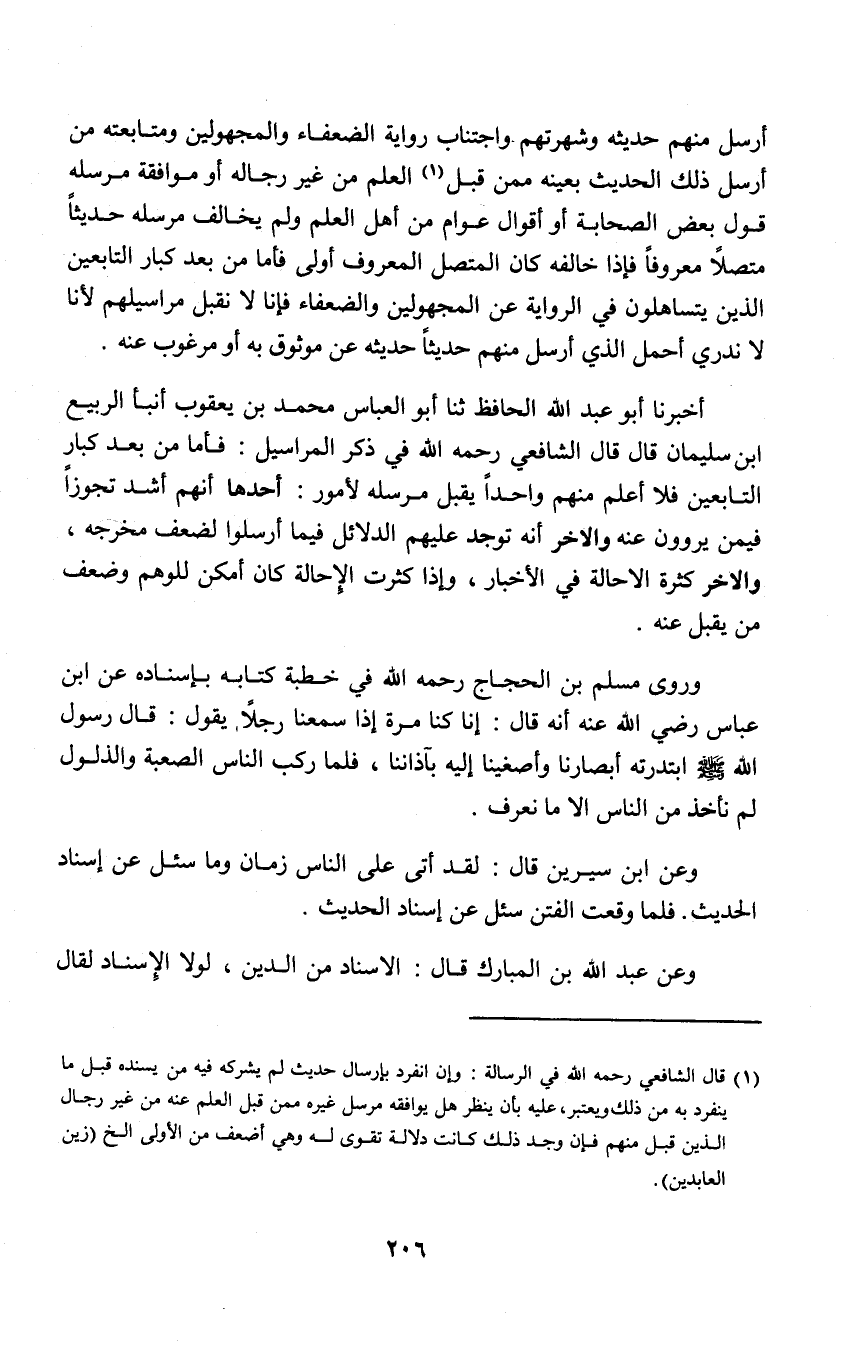وَرَوَى مُسْلِمُ بْنُ الْحَجَّاجِ رَحِمَهُ اللَّهُ فِي خِطْبَةِ كِتَابِهِ بِإِسْنَادِهِ عَنِ ابْنِ عَبَّاسٍ رَضِيَ اللَّهُ عَنْهُ أَنَّهُ قَالَ: " إِنَا كُنَّا مَرَّةً §إِذَا سَمِعْنَا رَجُلًا يَقُولُ: قَالَ رَسُولُ اللَّهِ صَلَّى اللهُ عَلَيْهِ وَسَلَّمَ ابْتَدَرَتْهُ أَبْصَارُنَا وَأَصْغَيْنَا إِلَيْهِ بِآذَانِنَا فَلَمَّا رَكِبَ النَّاسُ الصَّعْبَةَ وَالذَّلُولَ لَمْ نَأْخُذْ مِنَ النَّاسِ إِلَّا مَا نَعْرِفُ " وَعَنِ ابْنِ سِيرِينَ قَالَ: لَقَدْ أَتَى عَلَى النَّاسِ زَمَانٌ وَمَا سُئِلَ عَنْ إِسْنَادِ الْحَدِيثِ فَلَمَّا وَقَعَتِ الْفِتَنُ سُئِلَ عَنْ إِسْنَادِ الْحَدِيثِ وَعَنْ عَبْدِ اللَّهِ بْنِ الْمُبَارَكِ قَالَ: الْإِسْنَادُ مِنَ الدِّينِ , لَوْلَا الْإِسْنَادُ لَقَالَ -[207]- مَنْ شَاءَ مَا شَاءَ وَلَكِنْ إِذَا قِيلَ مَنْ حدَّثَكَ؟ اتَّقَى وَرَوَيْنَا عَنِ الشَّافِعِيِّ أَنَّهُ قَالَ: يَقُولُونَ نُحَابِي وَلَوْ حَابَيْنَا لَحَابَيْنَا الزُّهْرِيَّ , وَإِرْسَالُ الزُّهْرِيِّ لَيْسَ بِشَيْءٍ , وَذَاكَ أَنَّا نَجِدُهُ يَرْوِي عَنْ سُلَيْمَانَ بْنِ أَرْقَمَ قَالَ الْإِمَامُ أَحْمَدُ رَحِمَهُ اللَّهُ: وَكَذَلِكَ إِبْرَاهِيمُ النَّخَعِيُّ وَإِنْ كَانَ ثِقَةٌ فَإِنَّا نَجِدُهُ يَرْوِي عَنْ قَوْمٍ مَجْهُولِينَ لَا يَرْوِي عَنْهُمْ غَيْرُهُ مِثْلِ هُنَيِّ بْنِ نُوَيْرَةَ وَحَزَافَةَ الطَّائِيِّ وَقَرْثَعِ الضَّبِّيِّ وَيَزِيدَ بْنِ أُوَيْسٍ وَغَيْرِهِمْ , وَالْحِكَايَاتُ فِي عَوَارِ الْمَرَاسِيلِ كَثِيرَةٌ , وَأَنَا أَذْكُرُ مِنْهَا هُنَا وَاحِدَةً