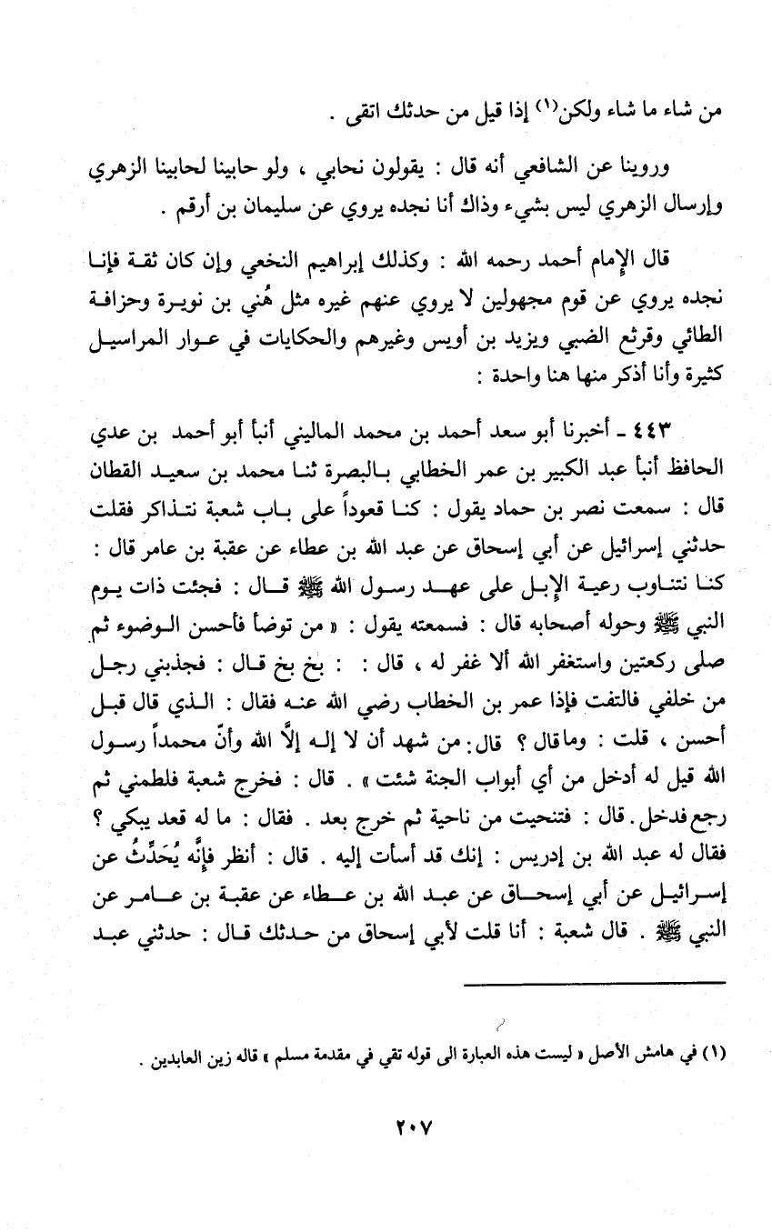 443 - أَخْبَرَنَا أَبُو سَعْدٍ أَحْمَدُ بْنُ مُحَمَّدٍ الْمَالِينِيُّ أَنْبَأَ أَبُو أَحْمَدَ بْنُ عَدِيٍّ الْحَافِظُ , أَنْبَأَ عَبْدُ الْكَبِيرِ بْنُ عُمَرَ الْخَطَّابِيُّ , بِالْبَصْرَةِ ثنا مُحَمَّدُ بْنُ سَعِيدٍ الْقَطَّانُ , قَالَ: سَمِعْتُ نَصْرَ بْنَ حَمَّادٍ , يَقُولُ: كُنَّا قُعُودًا عَلَى بَابِ شُعْبَةَ نَتَذَاكَرُ فَقُلْتُ: حَدَّثَنِي إِسْرَائِيلُ عَنْ أَبِي إِسْحَاقَ عَنْ عَبْدِ اللَّهِ بْنِ عَطَاءٍ، عَنْ عُقْبَةَ بْنِ عَامِرٍ قَالَ: " كُنَّا نَتَنَاوَبُ رَعِيَّةَ الْإِبِلِ عَلَى عَهْدِ رَسُولِ اللَّهِ صَلَّى اللهُ عَلَيْهِ وَسَلَّمَ قَالَ: فَجِئْتُ ذَاتَ يَوْمٍ النَّبِيَّ صَلَّى اللهُ عَلَيْهِ وَسَلَّمَ وَحوْلَهُ أَصْحَابُهُ قَالَ: فَسَمِعْتُهُ يَقُولُ: §«مَنْ تَوَضَّأَ فَأَحْسَنَ الْوُضُوءَ ثُمَّ صَلَّى رَكْعَتَيْنِ وَاسْتَغْفَرَ اللَّهَ إِلَّا غُفِرَ لَهُ» قَالَ: بَخٍ بَخٍ قَالَ: فَجَذَبَنِي رَجُلٌ مِنْ خَلْفِي , فَالْتَفَتُّ فَإِذَا عُمَرُ بْنُ الْخَطَّابِ رَضِيَ اللَّهُ عَنْهُ , فَقَالَ: الَّذِي قَالَ قَبْلُ أَحْسَنُ قُلْتُ: وَمَا قَالَ؟ قَالَ: " مَنْ شَهِدَ أَنْ لَا إِلَهَ إِلَّا اللَّهُ وَأَنَّ مُحَمَّدًا رَسُولُ اللَّهِ قِيلَ لَهُ: ادْخُلْ مِنْ أَيِّ أَبْوَابِ الْجَنَّةِ شِئْتَ " قَالَ: فَخَرَجَ شُعْبَةُ فَلَطَمَنِي ثُمَّ رَجَعَ فَدَخَلَ , قَالَ: فَتَنَحَّيْتُ مِنْ نَاحِيَةٍ ثُمَّ خَرَجَ بَعْدُ فَقَالَ: مَا لَهُ قَعَدَ يَبْكِي؟ فَقَالَ لَهُ عَبْدُ اللَّهِ بْنُ إِدْرِيسَ: إِنَّكَ قَدْ أَسَأْتَ إِلَيْهِ قَالَ: انْظُرْ فَإِنَّهُ يُحَدِّثُ عَنْ إِسْرَائِيلَ عَنْ أَبِي إِسْحَاقَ عَنْ عَبْدِ اللَّهِ بْنِ عَطَاءٍ عَنْ عُقْبَةَ بْنِ عَامِرٍ عَنِ النَّبِيِّ صَلَّى اللهُ عَلَيْهِ وَسَلَّمَ قَالَ شُعْبَةُ: أَنَا قُلْتُ لِأَبِي إِسْحَاقَ: مَنْ حدَّثَكَ؟ قَالَ: حدَّثَنِي عَبْدُ -[208]- اللَّهِ بْنُ عَطَاءٍ عَنْ عُقْبَةَ بْنِ عَامِرٍ قُلْتُ: سَمِعَ عَبْدُ اللَّهِ بْنُ عَطَاءٍ مِنْ عُقْبَةَ بْنِ عَامِرٍ قَالَ: فَغَضِبَ , وَمِسْعَرُ بْنُ كِدَامٍ حَاضِرٌ فَقَالَ: قَدْ أَغْضَبْتَ الشَّيْخَ , فَقُلْتُ: لَتُصَحِّحَنَّ هَذَا الْحَدِيثَ فَقَالَ مِسْعَرٌ: عَبْدُ اللَّهِ بْنُ عَطَاءٍ بِمَكَّةَ قَالَ شُعْبَةُ: فَرَحَلْتُ إِلَى مَكَّةَ فَلَقِيتُ عَبْدَ اللَّهِ بْنَ عَطَاءٍ فَسَأَلْتُهُ فَقَالَ: سَعْدُ بْنُ إِبْرَاهِيمَ حدَّثَنِي قَالَ شُعْبَةُ: ثُمَّ لَقِيتُ مَالِكَ بْنَ أَنَسٍ فَقَالَ: سَعْدُ بِالْمَدِينَةِ لَمْ يَحُجَّ الْعَامَ قَالَ شُعْبَةُ: فَرَحَلْتُ إِلَى الْمَدِينَةِ فَلَقِيتُ سَعْدًا فَسَأَلْتُهُ فَقَالَ: الْحَدِيثُ مِنْ عِنْدِكُمْ , زِيَادُ بْنُ مِخْرَاقَ حدَّثَنِي قَالَ شُعْبَةُ: فَلَمَّا ذَكَرَ زِيَادًا قُلْتُ: أَيُّ شَيْءٍ هُوَ لِهَذَا الْحَدِيثِ بَيْنَمَا هُوَ كُوفِيٌّ إِذْ صَارَ مَكِّيًّا إِذْ صَارَ مَدَنِيًّا إِذْ صَارَ بَصْرِيًّا؟ قَالَ شُعْبَةُ: فَرَحَلْتُ إِلَى الْبَصْرَةِ فَلَقِيتُ زِيَادَ بْنَ مِخْرَاقَ , فَسَأَلْتُهُ , فَقَالَ: لَيْسَ الْحَدِيثُ مِنْ شَأْنِكَ قُلْتُ: حَدِّثْنِي قَالَ: لَا نُرِيدُهُ قُلْتُ: حدِّثْنِي بِهِ , فَقَالَ: حدَّثَنِي شَهْرُ بْنُ حَوْشَبٍ , عَنْ أَبِي رَيْحانَةَ , عَنْ عُقْبَةَ بْنِ عَامِرٍ عَنِ النَّبِيِّ صَلَّى اللهُ عَلَيْهِ وَسَلَّمَ قَالَ شُعْبَةُ: فَلَمَّا ذَكَرَ شَهْرًا قُلْتُ: دَمِي عَلَى هَذَا الْحَدِيثِ لَوْ صَحَّ هَذَا عَنْ رَسُولِ اللَّهِ صَلَّى اللهُ عَلَيْهِ وَسَلَّمَ كَانَ أَحَبَّ إِلَيَّ مِنْ أَهْلِي وَمَالِي وَالنَّاسِ أَجْمَعِينَ " وَقَدْ رَوَى هَذِهِ الْحِكَايَةَ عَبْدُ الرَّحْمَنِ بْنُ مَهْدِيٍّ وَبِشْرُ بْنُ الْمُفَضَّلِ وَغَيْرُهُمَا عَنْ شُعْبَةَ مُخْتَصَرًا