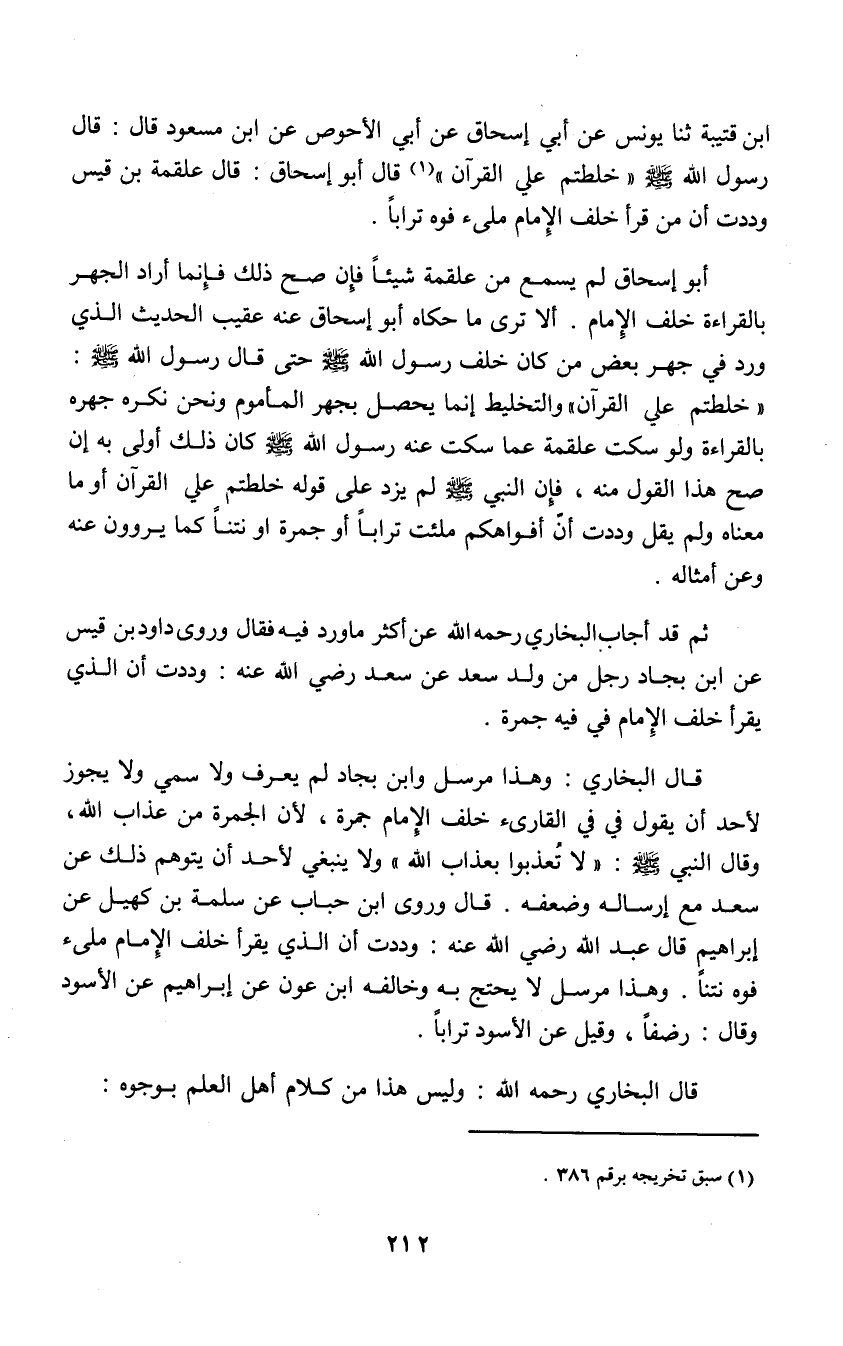 أَبُو إِسْحَاقَ لَمْ يَسْمَعْ مِنْ عَلْقَمَةَ شَيْئًا , فَإِنْ صَحَّ ذَلِكَ فَإِنَّمَا أَرَادَ الْجَهْرَ بِالْقِرَاءَةِ خَلْفَ الْإِمَامِ أَلَا تَرَى مَا حكَاهُ أَبُو إِسْحَاقَ عَنْهُ عُقَيْبَ الْحَدِيثِ الَّذِي وَرَدَ فِي جَهْرِ بَعْضِ مَنْ كَانَ خَلْفَ رَسُولِ اللَّهِ صَلَّى اللهُ عَلَيْهِ وَسَلَّمَ حتَّى قَالَ رَسُولُ اللَّهِ صَلَّى اللهُ عَلَيْهِ وَسَلَّمَ: «خَلَطْتُمْ عَلِيَّ الْقُرْآنَ» وَالتَّخْلِيطُ إِنَّمَا يَحْصُلُ بِجَهْرِ الْمَأْمُومِ , وَنَحْنُ نَكْرَهُ جَهْرَهُ بِالْقِرَاءَةِ وَلَوْ سَكَتَ عَلْقَمَةُ عَمَّا سَكَتَ عَنْهُ رَسُولُ اللَّهِ صَلَّى اللهُ عَلَيْهِ وَسَلَّمَ كَانَ ذَلِكَ أَوْلَى بِهِ إِنْ صَحَّ هَذَا الْقَوْلُ مِنْهُ , فَإِنَّ النَّبِيَّ صَلَّى اللهُ عَلَيْهِ وَسَلَّمَ لَمْ يَزِدْ عَلَى قَوْلِهِ: «خَلَطْتُمْ عَلِيَّ الْقُرْآنَ» أَوْ مَا مَعْنَاهُ , وَلَمْ يَقُلْ: وَدِدْتُ أَنَّ أَفْوَاهَكُمْ مُلِئَتْ تُرَابًا أَوْ جَمْرَةً أَوْ نَتْنًا , كَمَا يَرْوُونَ عَنْهُ وَعَنْ أَمْثَالِهِ ثُمَّ قَدْ أَجَابَ الْبُخَارِيُّ رَحِمَهُ اللَّهُ عَنْ أَكْثَرِ مَا وَرَدَ فِيهِ فَقَالَ: وَرَوَى دَاوُدُ بْنُ قَيْسٍ عَنِ ابْنِ بِجَادٍ رَجُلٍ مِنْ وَلَدِ سَعْدٍ عَنْ سَعْدٍ رَضِيَ اللَّهُ عَنْهُ: وَدِدْتُ أَنَّ الَّذِي يَقْرَأُ خَلْفَ الْإِمَامِ فِي فِيهِ جَمْرَةٌ قَالَ الْبُخَارِيُّ: وَهَذَا مُرْسَلٌ , وَابْنُ بِجَادٍ لَمْ يُعْرَفْ وَلَا سُمِّيَ , وَلَا يَجُوزُ لِأَحَدٍ أَنْ يَقُولَ فِي فِيِّ الْقَارِئِ خَلْفَ الْإِمَامِ جَمْرَةٌ؛ لِأَنَّ الْجَمْرَةَ مِنْ عَذَابِ اللَّهِ , وَقَالَ النَّبِيُّ صَلَّى اللهُ عَلَيْهِ وَسَلَّمَ: «لَا تُعَذِّبُوا بِعَذَابِ اللَّهِ» , وَلَا يَنْبَغِي لِأَحَدٍ أَنْ يَتَوَهَّمَ ذَلِكَ عَنْ سَعْدٍ مَعَ إِرْسَالِهِ وَضَعْفِهِ قَالَ: وَرَوَى ابْنُ حُبَابٍ , عَنْ سَلَمَةَ بْنِ كُهَيْلٍ , عَنْ إِبْرَاهِيمَ قَالَ عَبْدُ اللَّهِ رَضِيَ اللَّهُ عَنْهُ: وَدِدْتُ أَنَّ الَّذِي يَقْرَأُ خَلْفَ الْإِمَامِ مُلِئَ فُوهُ نَتْنًا وَهَذَا مُرْسَلٌ لَا يُحْتَجُّ بِهِ , وَخَالَفَهُ ابْنُ عَوْنٍ , عَنْ إِبْرَاهِيمَ , عَنِ الْأَسْوَدِ وَقَالَ: رَضْفًا , وَقِيلَ عَنِ الْأَسْوَدِ: تُرَابًا قَالَ الْبُخَارِيُّ رَحِمَهُ اللَّهُ: وَلَيْسَ هَذَا مِنْ كَلَامِ أَهْلِ الْعِلْمِ بِوُجُوهٍ: