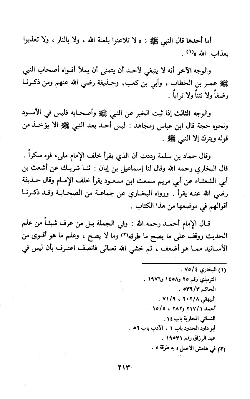 أَمَا أَحَدُهَا: قَالَ النَّبِيُّ صَلَّى اللهُ عَلَيْهِ وَسَلَّمَ: «لَا تَلَاعَنُوا بِلَعْنَةِ اللَّهِ وَلَا بِالنَّارِ وَلَا تُعَذِّبُوا بِعَذَابِ اللَّهِ» وَالْوَجْهُ الْآخَرُ: أَنَّهُ لَا يَنْبَغِي لِأَحَدٍ أَنْ يَتَمَنَّى أَنْ يَمْلَأَ أَفْوَاهُ أَصْحَابِ النَّبِيِّ صَلَّى اللهُ عَلَيْهِ وَسَلَّمَ مِثْلُ عُمَرَ بْنِ الْخَطَّابِ , وَأُبَيِّ بْنِ كَعْبٍ , وَحُذَيْفَةَ رَضِيَ اللَّهُ عَنْهُمْ وَمَنْ ذَكَرْنَا رَضْفًا وَلَا نَتْنًا وَلَا تُرَابًا وَالْوَجْهُ الثَّالِثُ: إِذَا ثَبَتَ الْخَبَرُ عَنِ النَّبِيِّ صَلَّى اللهُ عَلَيْهِ وَسَلَّمَ وَأَصْحَابِهِ فَلَيْسَ فِي الْأَسْوَدِ وَنَحْوِهِ حُجَّةٌ قَالَ ابْنُ عَبَّاسٍ وَمُجَاهِدٌ: «لَيْسَ أَحَدٌ بَعْدَ النَّبِيِّ صَلَّى اللهُ عَلَيْهِ وَسَلَّمَ إِلَّا يُؤْخَذُ مِنْ قَوْلِهِ وَيَتْرَكُ إِلَّا النَّبِيِّ صَلَّى اللهُ عَلَيْهِ وَسَلَّمَ» وَقَالَ حَمَّادُ بْنُ سَلَمَةَ: «وَدِدْتُ أَنَّ الَّذِي يَقْرَأُ خَلْفَ الْإِمَامِ مُلِئَ فُوهُ سَكَرًا» قَالَ الْبُخَارِيُّ رَحِمَهُ اللَّهُ: وَقَالَ لَنَا إِسْمَاعِيلُ بْنُ أَبَانٍ: ثَنَا شَرِيكٌ عَنْ أَشْعَثَ بْنِ أَبِي الشَّعْثَاءِ عَنْ أَبِي مَرْيَمَ: سَمِعْتُ ابْنَ مَسْعُودٍ يَقْرَأُ خَلْفَ الْإِمَامِ وَقَالَ حُذَيْفَةُ رَضِيَ اللَّهُ عَنْهُ يَقْرَأُ وَرَوَاهُ الْبُخَارِيُّ عَنْ جَمَاعَةٍ مِنَ الصَّحَابَةِ , وَقَدْ ذَكَرْنَا أَقْوَالَهُمْ فِي مَوْضِعِهَا مِنْ هَذَا الْكِتَابِ، قَالَ الْإِمَامُ أَحْمَدُ رَحِمَهُ اللَّهُ: وَفِي الْجُمْلَةِ بَلْ مَنْ عَرَفَ شَيْئًا مِنْ عَلْمِ الْحَدِيثِ وَوَقَفَ عَلَى مَا يَصِحُّ بِهِ طُرُقُهُ وَمَا لَا يَصِحُّ وَعَلِمَ مَا هُوَ أَقْوَى مِنَ الْأَسَانِيدِ مِمَّا هُوَ أَضْعَفُ ثُمَّ خَشِيَ اللَّهَ تَعَالَى فَأَنْصَفَ اعْتَرَفَ بِأَنْ لَيْسَ فِي