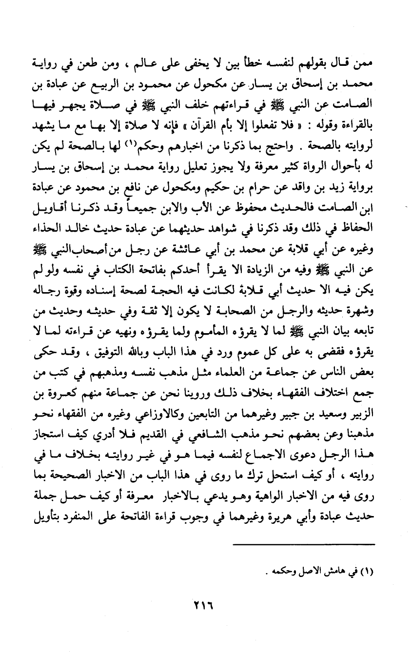 مِمَّنْ قَالَ بِقَوْلِهِمْ لِنَفْسِهِ خَطَأٌ بَيِّنٌ لَا يَخْفَى عَلَى عَالِمٍ , وَمَنْ طَعَنَ فِي رِوَايَةِ مُحَمَّدِ بْنِ إِسْحَاقَ بْنِ يَسَارٍ عَنْ مَكْحُولٍ عَنْ مَحْمُودِ بْنِ الرَّبِيعِ عَنْ عُبَادَةَ بْنِ الصَّامِتِ عَنِ النَّبِيِّ صَلَّى اللهُ عَلَيْهِ وَسَلَّمَ فِي قِرَاءَتِهِمْ خَلْفَ النَّبِيِّ صَلَّى اللهُ عَلَيْهِ وَسَلَّمَ فِي صَلَاةٍ يَجْهَرُ فِيهَا بِالْقِرَاءَةِ وَقَوْلِهِ: «فَلَا تَفْعَلُوا إِلَّا بِأُمِّ الْقُرْآنِ فَإِنَّهُ لَا صَلَاةَ إِلَّا بِهَا» مَعَ مَا يَشْهَدُ لِرِوَايَتِهِ بِالصِّحَّةِ وَاحْتَجَّ بِمَا ذَكَرْنَا مِنْ أَخْبَارِهِمْ وَحَكَمَ لَهَا بِالصِّحَّةِ لَمْ يَكُنْ لَهُ بِأَحْوَالِ الرُّوَاةِ كَثِيرَ مَعْرِفَةٍ وَلَا يَجُوزُ تَعْلِيلِ رِوَايَةِ مُحَمَّدِ بْنِ إِسْحَاقَ بْنِ يَسَارٍ بِرِوَايَةِ زَيْدِ بْنِ وَاقِدٍ عَنْ حرَامِ بْنِ حَكِيمٍ وَمَكْحُولٍ عَنْ نَافِعِ بْنِ مَحْمُودٍ عَنْ عُبَادَةَ بْنِ الصَّامِتِ فَالْحَدِيثُ مَحْفُوظٌ عَنِ الْأَبِ وَالِابْنِ جَمِيعًا , وَقَدْ ذَكَرْنَا أَقَاوِيلَ الْحُفَّاظِ فِي ذَلِكَ وَقَدْ ذَكَرْنَا فِي شَوَاهِدِ حَدِيثِهِمَا عَنْ عُبَادَةَ حَدِيثَ خَالِدٍ الْحَذَّاءِ وَغَيْرِهِ عَنْ أَبِي قِلَابَةَ عَنْ مُحَمَّدِ بْنِ أَبِي عَائِشَةَ عَنْ رَجُلٍ مِنْ أَصْحَابِ النَّبِيِّ صَلَّى اللهُ عَلَيْهِ وَسَلَّمَ عَنِ النَّبِيِّ صَلَّى اللهُ عَلَيْهِ وَسَلَّمَ وَفِيهِ مِنَ الزِّيَادَةِ: أَلَا يَقْرَأُ أَحَدُكُمْ بِفَاتِحَةِ الْكِتَابِ فِي نَفْسِهِ وَلَوْ لَمْ يَكُنْ فِيهِ إِلَّا حَدِيثُ أَبِي قِلَابَةَ لَكَانَتْ فِيهِ الْحُجَّةُ لِصِحَّةِ إِسْنَادِهِ وَقُوَّةِ رِجَالِهِ وَشُهْرَةِ حَدِيثِهِ , وَالرَّجُلُ مِنَ الصَّحَابَةِ لَا يَكُونُ إِلَّا ثِقَةٌ , وَفِي حَدِيثِهِ وَحَدِيثِ مَنْ تَابَعَهُ بَيَانُ النَّبِيِّ صَلَّى اللهُ عَلَيْهِ وَسَلَّمَ لِمَا لَا يَقْرَؤُهُ الْمَأْمُومُ وَلِمَا يَقْرَؤُهُ وَنَهْيُهُ عَنْ قِرَاءَتِهِ لِمَا لَا يَقْرَؤُهُ فَقَضَى بِهِ عَلَى كُلِّ عُمُومٍ وَرَدَ فِي هَذَا الْبَابِ وَبِاللَّهِ التَّوْفِيقُ وَقَدْ حَكَى بَعْضُ النَّاسِ عَنْ جَمَاعَةٍ مِنَ الْعُلَمَاءِ مِثْلَ مَذْهَبِ نَفْسِهِ , وَمَذْهَبُهُمْ فِي كُتُبِ مَنْ جَمَعَ اخْتِلَافَ الْفُقَهَاءِ بِخِلَافِ ذَلِكَ وَرَوْيَنَا نَحْنُ عَنْ جَمَاعَةٍ مِنْهُمْ كَعُرْوَةَ بْنِ الزُّبَيْرِ وَسَعِيدِ بْنِ جُبَيْرٍ وَغَيْرِهِمَا مِنَ التَّابِعِينَ , وَكَالْأَوْزَاعِيِّ وَغَيْرِهِ مِنَ الْفُقَهَاءِ نَحْوَ مَذْهَبِنَا وَعَنْ بَعْضِهِمْ نَحْوَ مَذْهَبِ الشَّافِعِيِّ فِي الْقَدِيمِ فَلَا أَدْرِي كَيْفَ اسْتَجَازَ هَذَا الرَّجُلُ دَعْوَى الْإِجْمَاعِ لِنَفْسِهِ فِيمَا هُوَ فِي غَيْرِ رِوَايَتِهِ بِخِلَافِ مَا فِي رِوَايَتِهِ؟ أَوْ كَيْفَ اسْتَحلَّ تَرْكَ مَا رُوِيَ فِي هَذَا الْبَابِ مِنَ الْأَخْبَارِ الصَّحِيحَةِ بِمَا رُوِيَ فِيهِ مِنَ الْأَخْبَارِ الْوَاهِيَةِ وَهُوَ يَدَّعِي بِالْأَخْبَارِ مَعْرِفَةً؟ أَوْ كَيْفَ حَمَلَ جُمْلَةَ حَدِيثِ عُبَادَةَ وَأَبِي هُرَيْرَةَ وَغَيْرِهِمَا فِي وُجُوبِ قِرَاءَةِ الْفَاتِحَةِ عَلَى الْمُنْفَرِدِ بِتَأْوِيلِ