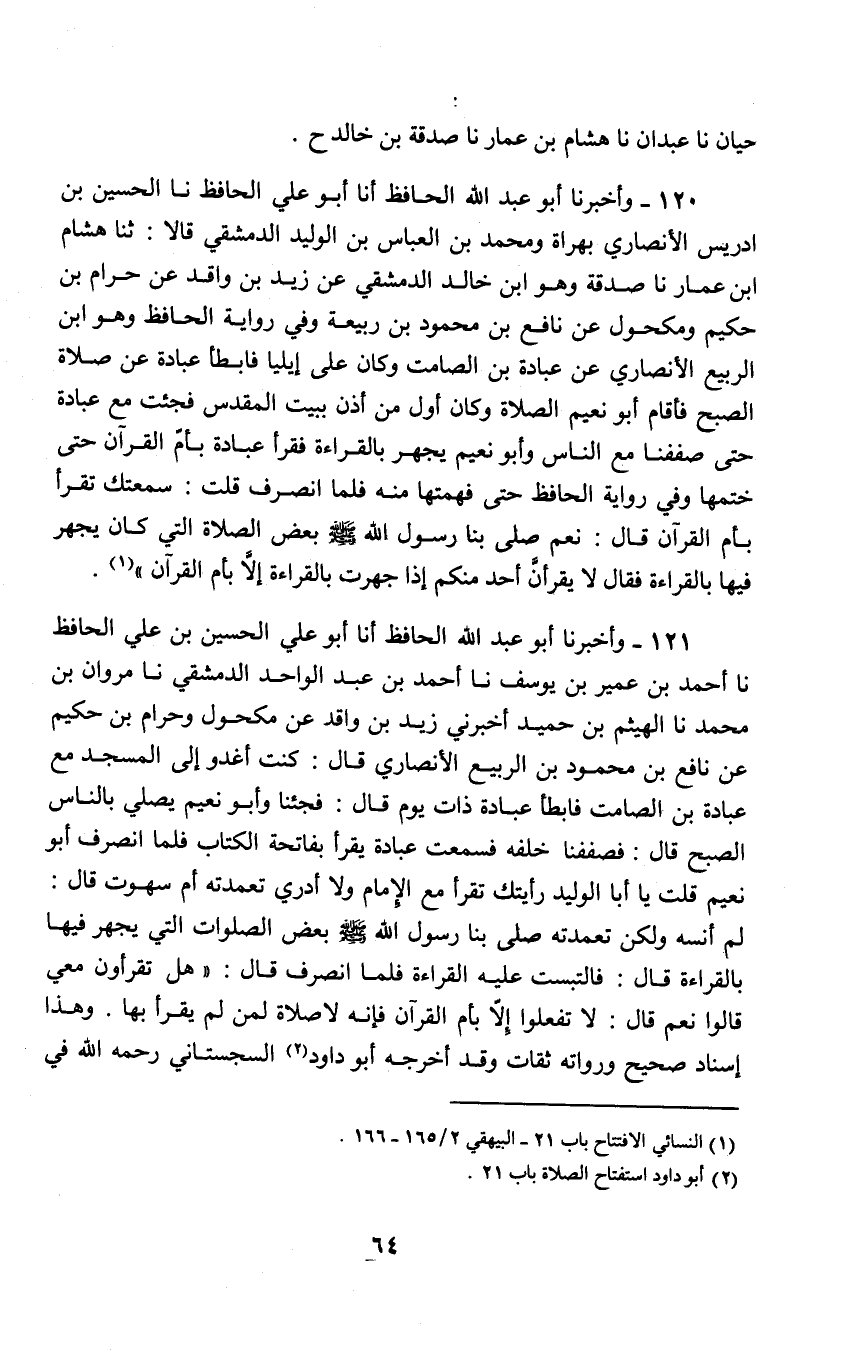121 - وَأَخْبَرَنَا أَبُو عَبْدِ اللَّهِ الْحَافِظُ , أنا أَبُو عَلِيٍّ الْحُسَيْنُ بْنُ عَلِيٍّ الْحَافِظُ , نا أَحْمَدُ بْنُ عُمَيْرِ بْن يُوسُفَ , نا أَحْمَدُ بْنُ عَبْدِ الْوَاحِدِ الدِّمَشْقِيُّ , نا مَرْوَانُ بْنُ مُحَمَّدٍ , نا الْهَيْثَمُ بْنُ حُمَيْدٍ , أَخْبَرَنِي زَيْدُ بْنُ وَاقِدٍ , عَنْ مَكْحُولٍ , وَحرَامُ بْنُ حَكِيمٍ , عَنْ نَافِعِ بْنِ مَحْمُودِ بْنِ الرَّبِيعِ الْأَنْصَارِيِّ , قَالَ: كُنْتُ أَغْدُو إِلَى الْمَسْجِدِ مَعَ عُبَادَةَ بْنِ الصَّامِتِ فَأَبْطَأَ عُبَادَةُ ذَاتَ يَوْمٍ , قَالَ: فَجِئْنَا وَأَبُو نُعَيْمٍ يُصَلِّي بِالنَّاسِ الصُّبْحَ , قَالَ: فَصَفَفْنَا خَلْفَهُ , فَسَمِعْتُ عُبَادَةَ يَقْرَأُ بِفَاتِحَةِ الْكِتَابِ , فَلَمَّا انْصَرَفَ أَبُو نُعَيْمٍ قُلْتُ: يَا أَبَا الْوَلِيدِ , رَأَيْتُكَ تَقْرَأُ مَعَ الْإِمَامِ وَلَا أَدْرِيَ تَعَمَّدْتَهُ أَمْ سَهَوْتَ , قَالَ: لَمْ أَنْسَهُ وَلَكِنْ تَعَمَّدْتُهُ , صَلَّى بِنَا رَسُول اللَّهِ صَلَّى اللهُ عَلَيْهِ وَسَلَّمَ بَعْضَ الصَّلَوَاتِ الَّتِي يَجْهَرُ فِيهَا بِالْقِرَاءَةِ، قَالَ: فَالْتَبَسَتْ عَلَيْهِ الْقِرَاءَةُ , فَلَمَّا انْصَرَفَ قَالَ: " هَلْ تَقْرَأُونَ مَعِي؟ قَالُوا: نَعَمْ، قَالَ: لَا تَفْعَلُوا إِلَّا بِأُمِّ الْقُرْآنِ؛ فَإِنَّهُ §لَا صَلَاةَ لِمَنْ لَمْ يَقْرَأْ بِهَا " وَهَذَا إِسْنَادٌ صَحِيحٌ وَرُوَاتُهُ ثِقَاتٌ، وَقَدْ أَخْرَجَهُ أَبُو دَاوُدَ السِّجِسْتَانِيُّ رَحِمَهُ اللَّهُ فِي -[65]- كِتَابِ السُّنَنِ بَعْدَ حَدِيثِ مُحَمَّد بْنِ إِسْحَاقَ بْنِ يَسَارٍ عَنِ الرَّبِيعِ بْنِ سُلَيْمَانَ الْأَزْدِيِّ , عَنْ عَبْدِ اللَّهِ بْنِ يُوسُفَ , عَنِ الْهَيْثَمِ بْنِ حُمَيْدٍ , عَنْ زَيْدِ بْنِ وَاقِدٍ عَنْ مَكْحُولٍ عَنْ نَافِعِ بْنِ مَحْمُودِ بْنِ الرَّبِيعِ الْأَنْصَارِيِّ