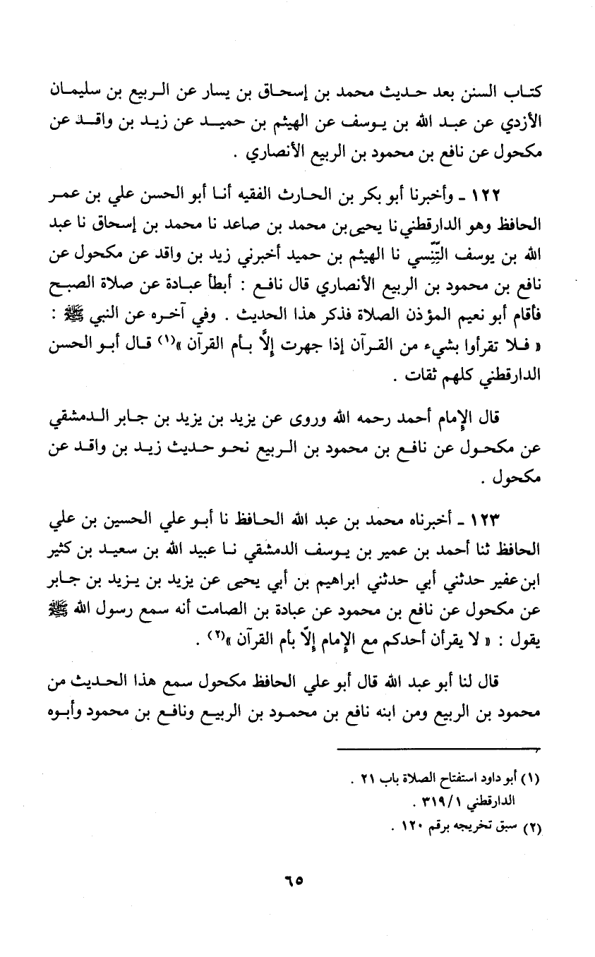 122 - وَأَخْبَرَنَا أَبُو بَكْرِ بْنُ الْحَارِثِ الْفَقِيهُ , أنا أَبُو الْحَسَنِ عَلِيُّ بْنُ عُمَرَ الْحَافِظُ وَهُوَ الدَّارَقُطْنِيُّ نا يَحْيَى بْنُ مُحَمَّدِ بْنِ صَاعِدٍ , نا مُحَمَّدُ بْنُ إِسْحَاقَ , نا عَبْدُ اللَّهِ بْنُ يُوسُفَ التَّنَسِيُّ , نا الْهَيْثَمُ بْنُ حُمَيْدٍ , أَخْبَرَنِي زَيْدُ بْنُ وَاقِدٍ , عَنْ مَكْحُولٍ , عَنْ نَافِعِ بْنِ مَحْمُودِ بْنِ الرَّبِيعِ الْأَنْصَارِيِّ , قَالَ نَافِعٌ: أَبْطَأَ عُبَادَةُ عَنْ صَلَاةِ الصُّبْحِ , فَأَقَامَ أَبُو نُعَيْمٍ الْمُؤَذِّنُ الصَّلَاةَ , فَذَكَرَ هَذَا الْحَدِيثَ وَفِي آخِرِهِ عَنِ النَّبِيِّ صَلَّى اللهُ عَلَيْهِ وَسَلَّمَ: §«فَلَا تَقْرَءُوا بِشَيْءٍ مِنَ الْقُرْآنِ إِذَا جَهَرْتُ إِلَّا بِأُمِّ الْقُرْآنِ» قَالَ أَبُو الْحَسَنِ الدَّارَقُطْنِيُّ: كُلُّهُمْ ثِقَاتٌ قَالَ الْإِمَامُ أَحْمَدُ رَحِمَهُ اللَّهُ وَرَوَى عَنْ يَزِيدَ بْن يَزِيدَ بْنِ جَابِرٍ الدِّمَشْقِيِّ عَنْ مَكْحُولٍ عَنْ نَافِعِ بْنِ مَحْمُودِ بْنِ الرَّبِيعِ نَحْوَ حَدِيثِ زَيْدِ بْنِ وَاقِدٍ عَنْ مَكْحُولٍ
