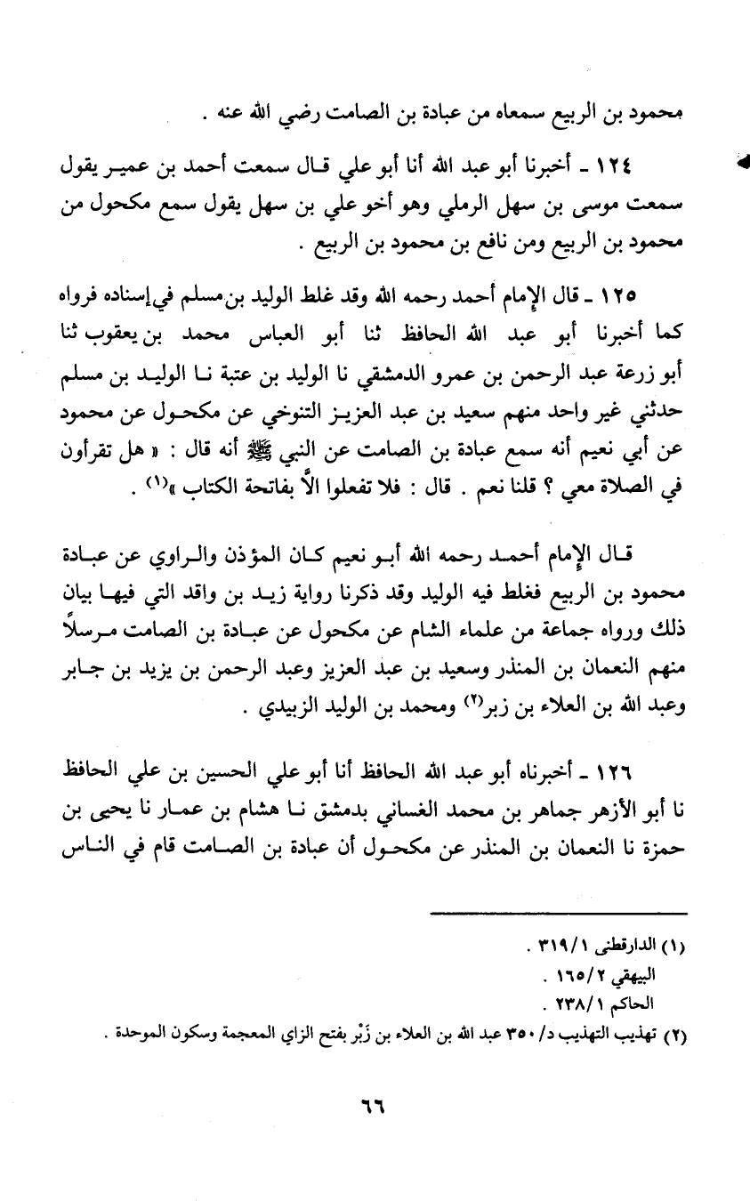 126 - أَخْبَرَنَاهُ أَبُو عَبْدِ اللَّهِ الْحَافِظُ , أنا أَبُو عَلِيٍّ الْحُسَيْنُ بْنُ عَلِيٍّ الْحَافِظُ , نا أَبُو الْأَزْهَرِ جَمَاهِرُ بْن مُحَمَّدٍ الغَسَّانِيُّ بِدِمَشْقَ نا هِشَامُ بْنُ عَمَّارٍ , نا يَحْيَى بْنُ حَمْزَةَ , نا النُّعْمَانُ بْنُ الْمُنْذِرِ , عَنْ مَكْحُولٍ , أَنَّ عُبَادَةَ بْنَ الصَّامِتِ , قَامَ فِي النَّاسِ -[67]- فَقَالَ: إِنَّ رَسُول اللَّهِ صَلَّى اللهُ عَلَيْهِ وَسَلَّمَ صَلَّى بِنَا فَجَهَرَ بِالْقِرَانِ فَلُبِسَتْ عَلَيْهِ الْقِرَاءَةُ فَلَمَّا انْصَرَفَ قَالَ: «هَلْ تَقْرَأُونَ خَلْفَ الْإِمَامِ إِذَا جَهَرَ؟» قَالُوا: نَعَمْ نَهُذُّ الْقُرْآنَ هَذًّا قَالَ: «عَجِبْتُ أُنَازَعُ الْقُرْآنَ» وَقَالَ: §«لَا تَقْرَأُوا إِذَا جَهَرَ الْإِمَامُ إِلَّا بِأُمِّ الْقُرْآنِ؛ فَإِنَّهُ لَا صَلَاةَ لِمَنْ لَمْ يَقْرَأْ بِأُمِّ الْقُرْآنِ»