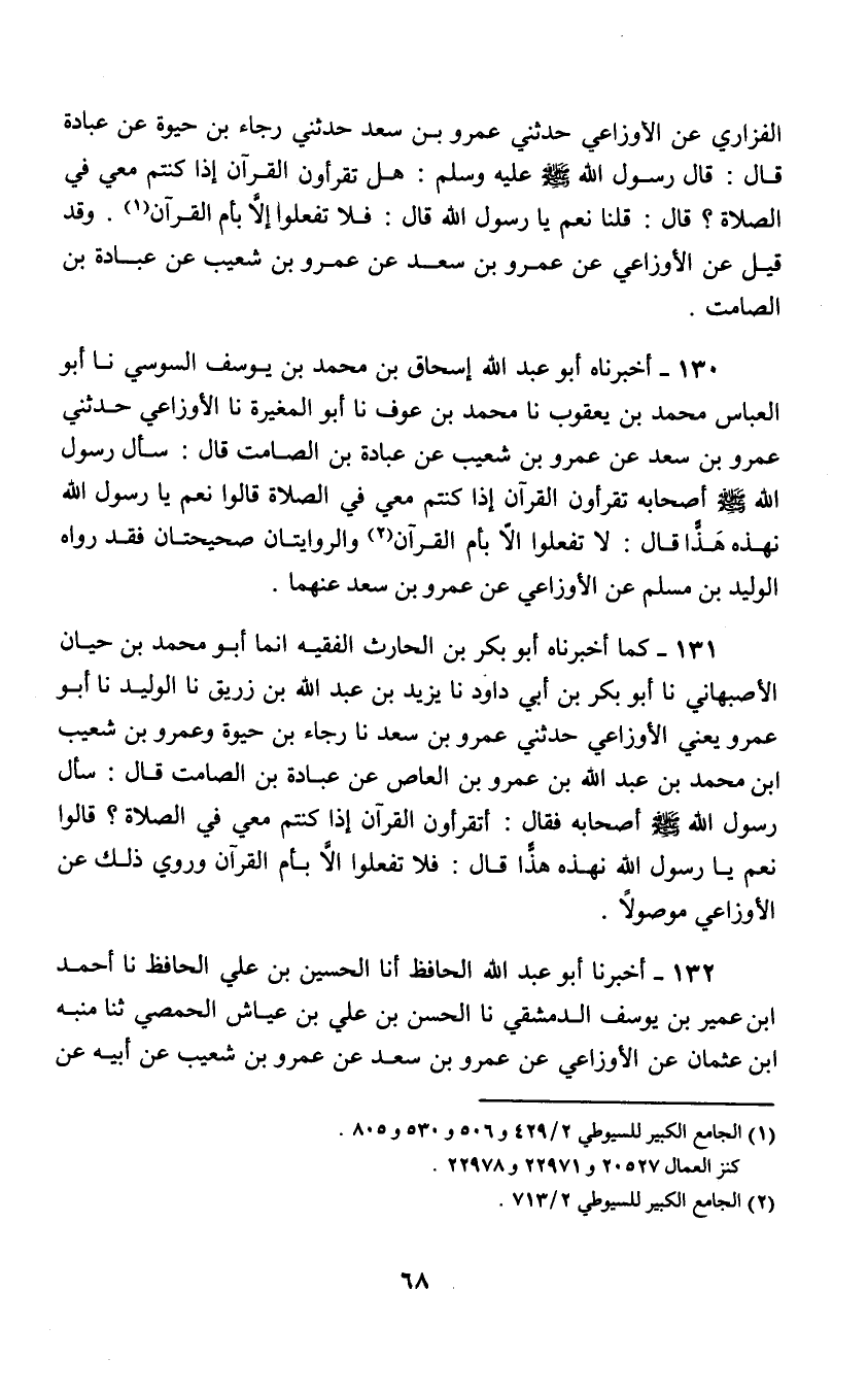 130 - أَخْبَرَنَاهُ أَبُو عَبْدِ اللَّهِ إِسْحَاق بْنِ مُحَمَّدِ بْنِ يُوسُفَ السُّوسِيُّ نا أَبُو الْعَبَّاسِ مُحَمَّدُ بْن يَعْقُوبَ نا مُحَمَّدُ بْنُ عَوْفٍ , نا أَبُو الْمُغِيرَةِ , نا الْأَوْزَاعِيُّ , حدَّثَنِي عَمْرُو بْنُ سَعْدٍ , عَنْ عَمْرِو بْنِ شُعَيْبٍ , عَنْ عُبَادَةَ بْنِ الصَّامِتِ , قَالَ: سَأَلَ رَسُول اللَّهِ صَلَّى اللهُ عَلَيْهِ وَسَلَّمَ أَصْحَابهُ: §«تَقْرَأُونَ الْقُرْآنَ إِذَا كُنْتُمْ مَعِي فِي الصَّلَاةِ؟» قَالُوا: نَعَمْ يَا رَسُول اللَّهِ نَهُذُّهُ هَذًّا قَالَ: «لَا تَفْعَلُوا إِلَّا بِأُمِّ الْقُرْآنِ» وَالرِّوَايَتَانِ صَحِيحَتَانِ؛ فَقَدْ رَوَاهُ الْوَلِيدُ بْنُ مُسْلِمٍ عَنِ الْأَوْزَاعِيِّ , عَنْ عَمْرِو بْنِ سَعْدٍ عَنْهُمَا