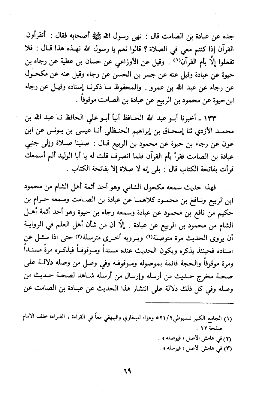 133 - أَخْبَرَنَا أَبُو عَبْدِ اللَّهِ الْحَافِظُ , أَنْبَأَ أَبُو عَلِيٍّ الْحَافِظُ , نا عَبْدُ اللَّهِ بْنُ مُحَمَّدٍ الأَزْدِيُّ , ثنا إِسْحَاقُ بْنُ إِبْرَاهِيمَ الْحنْظَلِيُّ , أنا عِيسَى بْنُ يُونُسَ , عَنِ ابْنِ عَوْنٍ , عَنْ رَجَاءِ بْنِ حيْوَةَ , عَنْ مَحْمُودِ بْنِ الرَّبِيعِ , قَالَ: صَلَّيْنَا صَلَاةً وَإِلَى جَنْبِي عُبَادَةُ بْنُ الصَّامِتِ فَقَرَأَ بِأُمِّ الْقُرْآنِ فَلَمَّا انْصَرَفَ قُلْتُ: لَهُ: يَا أَبَا الْوَلِيد , أَلَمْ أَسْمَعْكَ قَرَأْتَ بِفَاتِحَةِ الْكِتَابِ؟ قَالَ: بَلَى؛ " إِنَّهُ §لَا صَلَاةَ إِلَّا بِفَاتِحَةِ الْكِتَابِ فَهَذَا حَدِيثٌ سَمِعَهُ مَكْحُولٌ الشَّامِيُّ وَهُوَ أَحَد أَئِمَّةِ أَهْلِ الشَّامِ مِنْ مَحْمُودِ بْنِ الرَّبِيعِ وَنَافِعِ بْنِ مَحْمُودٍ كِلَاهُمَا عَنْ عُبَادَةَ بْنِ الصَّامِتِ , وَسَمِعَهُ حرَامُ بْنُ حَكِيمٍ مِنْ نَافِعِ بْنِ مَحْمُودٍ عَنْ عُبَادَةَ , وَسَمِعَهُ رَجَاءُ بْنُ حيْوَةَ وَهُوَ أَحَد أَئِمَّةِ أَهْلِ الشَّامِ مِنْ مَحْمُودِ بْنِ الرَّبِيعِ عَنْ عُبَادَةَ إِلَّا أَنَّ مِنْ شَأْنِ أَهْلِ الْعِلْمِ فِي الرِّوَايَةِ أَنْ يُرْوَى الْحَدِيثُ مَرَّةً فَيُوصِلَهُ وَيَرْوِيهِ أُخْرَى فَيُرْسِلَهُ حتَّى إِذَا سُئِلَ عَنْ إِسْنَادِهِ فَحِينَئِذٍ يَذْكُرُهُ وَيَكُونُ الْحَدِيثُ عِنْدَهُ مُسْنَدًا وَمَوْقُوفًا فَيَذْكُرُهُ مَرَّةً مُسْنَدًا وَمَرَّةً مَوْقُوفًا وَالْحُجَّة قَائِمَةٌ بِمَوْصُولِهِ وَمَوْقُوفِهِ وَفِي وَصْلِ مِنْ وَصَلَهُ دَلَالَةٌ عَلَى صِحَّة مَخْرَجِ حَدِيثِ مِنْ أَرْسَلَهُ , وَإِرْسَالِ مِنْ أَرْسَلَهُ شَاهِدٌ لِصِحَّة حَدِيثِ مِنْ وَصَلَهُ وَفِي كُلِّ ذَلِكَ دَلَالَةٌ عَلَى انْتِشَارِ هَذَا الْحَدِيثِ عَنْ عُبَادَةَ بْنِ الصَّامِتِ عَنِ -[70]- النَّبِيِّ صَلَّى اللهُ عَلَيْهِ وَسَلَّمَ مُسْنَدًا , ثُمَّ مِنْ فَتْوَاهِ بِهِ مَوْقُوفًا وَإِنَّمَا تَعَجَّبَ مِنْ تَعَجَّبَ مِنْ قِرَاءَتِهِ خَلْفَ الْإِمَامِ فِيمَا يَجْهَرُ الْإِمَامُ فِيهِ بِالْقِرَاءَةِ لِذِهَابِ مِنْ ذَهَبَ إِلَى تَرَكِ الْقِرَاءَةِ خَلْفَ الْإِمَامِ فِيمَا يَجْهَرُ الْإِمَامُ فِيهِ بِالْقِرَاءَةِ حِينَ قَالَ النَّبِيُّ صَلَّى اللهُ عَلَيْهِ وَسَلَّمَ: مَا لِي أُنَازَعُ الْقُرْآنَ وَلَمْ يَسْمَعِ اسْتِثْنَاءَ النَّبِيِّ صَلَّى اللهُ عَلَيْهِ وَسَلَّمَ قِرَاءَةَ فَاتِحَة الْكِتَابِ سِرًّا وَقَوْلَهُ صَلَّى اللهُ عَلَيْهِ وَسَلَّمَ: فَإِنَّهُ لَا صَلَاةَ لِمَنْ لَمْ يَقْرَأْ بِهَا وَسَمِعَهُ عُبَادَةُ بْنُ الصَّامِتِ وَأَتْقَنَهُ وَأَدَّاهُ وَأَظْهَرَهُ فَوَجَبَ الرُّجُوعُ إِلَيْهِ فِي ذَلِكَ قَالَ أَبُو عَبْدِ اللَّهِ مُحَمَّد بْن إِسْمَاعِيلَ الْبُخَارِيُّ رَحِمَهُ اللَّهُ فِيمَا قَرَأْتُهُ مِنْ كِتَابِهِ: وَالَّذِي زَادَ مَكْحُولٌ وَحرَامُ بْنُ حَكِيمٍ وَرَجَاءُ بْنُ حيْوَةَ عَنِ ابْنِ الرَّبِيعِ عَنْ عُبَادَةَ فَهُوَ تَبَعٌ لِمَا رَوَى الزُّهْرِيُّ قَالَ: حدَّثَنِي مَحْمُودُ بْنُ الرَّبِيعِ أَنَّ عُبَادَةَ أَخْبَرَهُ عَنِ النَّبِيِّ صَلَّى اللهُ عَلَيْهِ وَسَلَّمَ يَعْنِي قَوْلَهُ: لَا صَلَاةَ لِمَنْ لَمْ يَقْرَأْ بِفَاتِحَةِ الْكِتَابِ وَقَدْ مَضَى ذِكْرُهُ