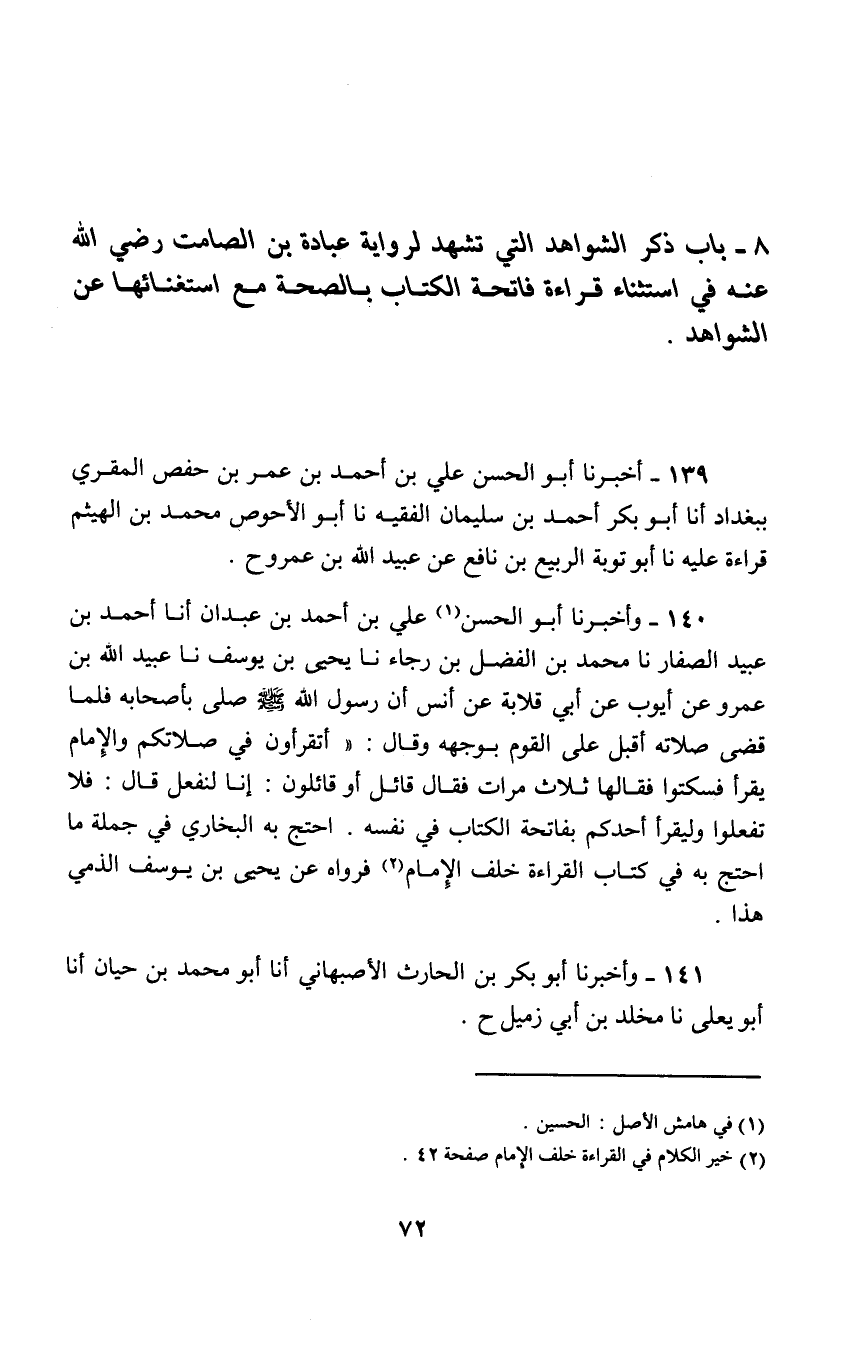 146 - وَهُوَ فِيمَا أَخْبَرَنَاهُ أَبُو عَبْدِ اللَّهِ الْحَافِظُ , أَنَا أَبُو عَلِيٍّ الْحَافِظُ الْحَسَن بْنُ الْفَرَجِ الْغَزِّيُّ , نَا يُوسُفُ بْنُ عَدِيٍّ , نَا عُبَيْدُ اللَّهِ بْنُ عَمْرو فَذَكَرَ بِنُقْصَانِ هَذَا الِاسْتِثْنَاءِ وَهُوَ تَقْصِيرٌ مِنْهُ وَسَهْوٌ سَهَا فِيهِ وَلَيْسَ هَذَا مِنَ النُّقْصَانِ الَّذِي يَتَجَوَّزُهُ فِي الْخَبَرِ بَعْضُ الرُّوَاةِ فَإِنَّهُ يُغَيِّرُ الْحَكَم الَّذِي هُوَ مَقْصُودُ صَاحِبِ الشَّرِيعَةِ صَلَّى اللهُ عَلَيْهِ وَسَلَّمَ بِالنَّهْيِ عَنِ الْقِرَاءَةِ -[74]- خَلْفَ الْإِمَامِ وَاسْتِثْنَاءِ قِرَاءَةِ الْفَاتِحَة سِرًّا فِي نَفْسِهِ وَمَثَلُ هَذَا النُّقْصَانِ لَا يَجُوزُ بِحَالٍ وَبِاللَّهِ التَّوْفِيقُ