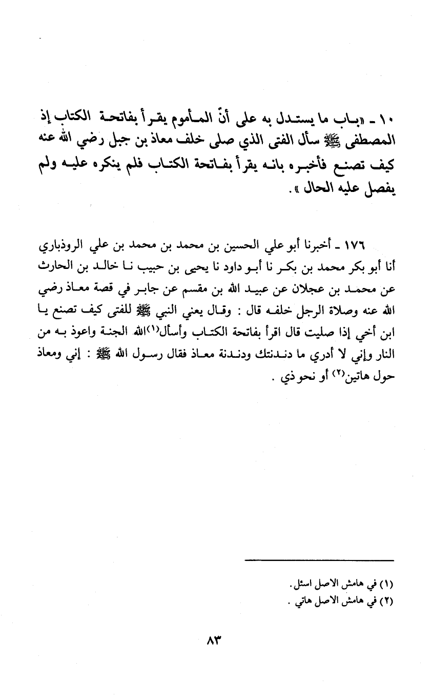 176 - أَخْبَرَنَا أَبُو عَلِيٍّ الْحُسَيْن بْنِ مُحَمَّدِ بْنِ مُحَمَّدِ بْن عَلِيٍّ الرَّوْذَبَارِيُّ , أنا أَبُو بَكْرٍ مُحَمَّدُ بْنُ بَكْرٍ نا أَبُو دَاوُدَ , نا يَحْيَى بْن حَبِيبٍ , نا خَالِدُ بْنُ الْحَارِثِ , عَنْ مُحَمَّدِ بْنِ عَجْلَانَ , عَنْ عُبَيْد اللَّهِ بْنِ مِقْسَمٍ , عَنْ جَابِرٍ , فِي قِصَّةِ مُعَاذٍ رَضِيَ اللَّهُ عَنْهُ وَصَلَاةِ الرَّجُلِ خَلْفَهُ قَالَ: وَقَالَ: يَعْنِي النَّبِيَّ صَلَّى اللهُ عَلَيْهِ وَسَلَّمَ لِلْفَتَى: «كَيْفَ تَصْنَعُ يَا ابْنَ أَخِي إِذَا صَلَّيْتَ» ؟ قَالَ: أَقْرَأُ بِفَاتِحَةِ الْكِتَابِ وَأَسْأَلُ اللَّهَ الْجَنَّةَ وَأَعُوذُ بِهِ مِنَ النَّارِ , وَإِنِّي لَا أَدْرِي مَا دَنْدَنَتُكَ وَدَنْدَنَةُ مُعَاذٍ فَقَالَ رَسُول اللَّهِ صَلَّى اللهُ عَلَيْهِ وَسَلَّمَ: §«إِنِّي وَمُعَاذُُ حوْلَ هَاتَيْنِ» أَوْ نَحْوَ ذِي