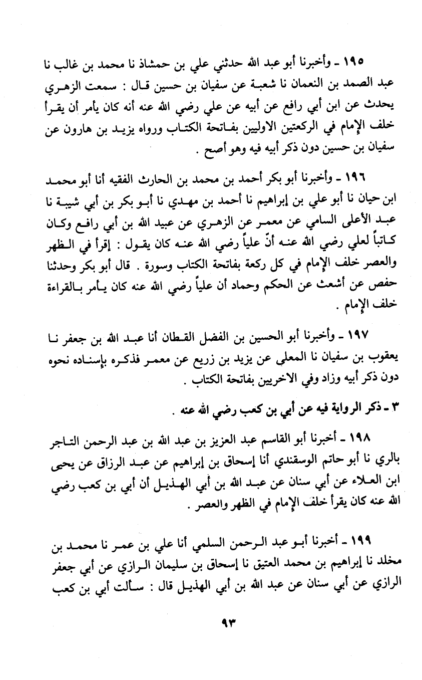 199 - أَخْبَرَنَا أَبُو عَبْدِ الرَّحْمَنِ السُّلَمِيُّ , أنا عَلِيُّ بْنُ عُمَرَ , نا مُحَمَّدُ بْنُ مَخْلَدٍ , نا إِبْرَاهِيمُ بْن مُحَمَّدٍ العَتِيقُ , نا إِسْحَاقُ بْنُ سُلَيْمَانَ الرَّازِيُّ , عَنْ أَبِي جَعْفَرٍ الرَّازِيِّ , عَنْ أَبِي سِنَانٍ , عَنْ عَبْدِ اللَّهِ بْنِ أَبِي الْهُذَيْلِ , قَالَ: سَأَلْتُ أُبَيَّ بْنَ كَعْبٍ -[94]- رَضِيَ اللَّهُ عَنْهُ: " §أَقْرَأُ خَلْفَ الْإِمَامِ؟ قَالَ: نَعَمْ "