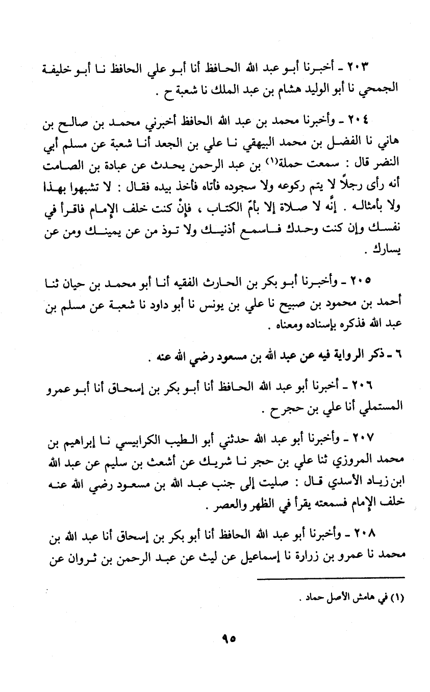 204 - وَأَخْبَرَنَا مُحَمَّدُ بْنُ عَبْدِ اللَّهِ الْحَافِظُ , أَخْبَرَنِي مُحَمَّدُ بْنُ صَالِحِ بْنِ هَانِي , نا الْفَضْلُ بْن مُحَمَّدٍ البَيْهَقِيُّ , نا عَلِيُّ بْنُ الْجَعْدِ , أنا شُعْبَةُ , عَنْ مُسْلِمٍ أَبِي النَّضْرِ , قَالَ: سَمِعْتُ حَمَلَةَ بْنَ عَبْدِ الرَّحْمَنْ , يحدِّثُ عَنْ عُبَادَةَ بْنِ الصَّامِتِ , أَنَّهُ رَأَى رَجُلًا لَا يُتِمُّ رُكُوعَهُ وَلَا سُجُودَهُ , فَأَتَاهُ فَأَخَذَ بِيَدِهِ فَقَالَ: «لَا تَشَبَّهُوا بِهَذَا وَلَا بِأَمْثَالِهِ؛ إِنَّهُ §لَا صَلَاةَ إِلَّا بِأُمِّ الْكِتَابِ؛ فَإِنْ كُنْتَ خَلْفَ الْإِمَامِ فَاقْرَأْ فِي نَفْسِكَ وَإِنْ كُنْتَ وَحْدَكَ فَأَسْمِعْ أُذُنَيْكَ وَلَا تُؤْذِ مِنْ عَنْ يَمِينِك وَمَنْ عَنْ يَسَارِكَ»