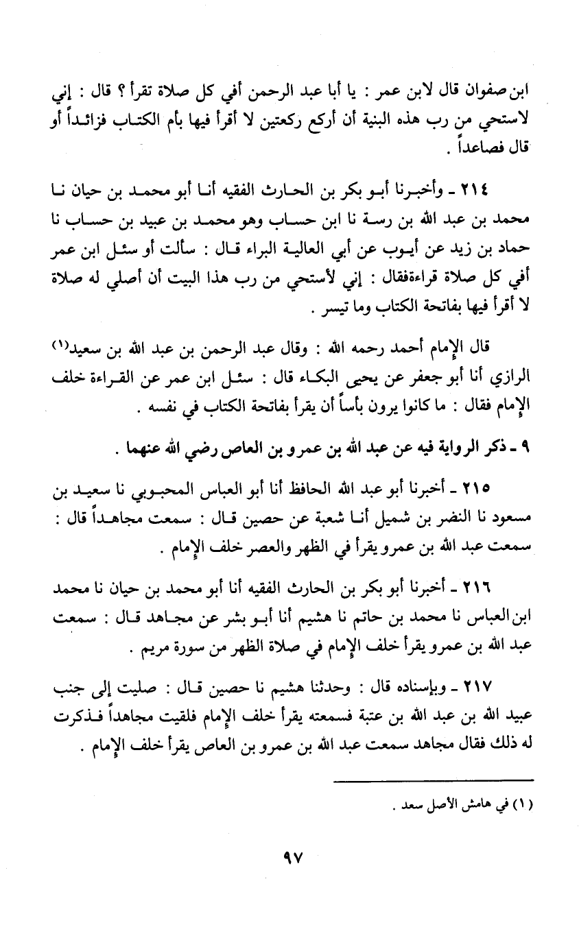 214 - وَأَخْبَرَنَا أَبُو بَكْرِ بْنِ الْحَارِثِ الْفَقِيهُ , أنا أَبُو مُحَمَّدِ بْنُ حَيَّانَ , نا مُحَمَّدُ بْنُ عَبْدِ اللَّهِ بْنِ رَسَّةَ , نا ابْنُ حِسَابٍ وَهُوَ مُحَمَّدُ بْنُ عُبَيْدِ بْنِ حِسَابٍ نا حَمَّادُ بْنُ زَيْدٍ , عَنْ أَيُّوبَ , عَنْ أَبِي الْعَالِيَةِ الْبَرَاءِ , قَالَ: سَأَلْتُ أَوْ سُئِلَ ابْن عُمَرَ: " أَفِي كُلِّ صَلَاةٍ قِرَاءَةٌ؟ فَقَال: إِنِّي §لَأَسْتَحِي مِنْ رَبِّ هَذَا الْبَيْت أَنْ أُصَلِّيَ لَهُ صَلَاةً لَا أَقْرَأُ فِيهَا بِفَاتِحَةِ الْكِتَابِ وَمَا تَيَسَّرَ "