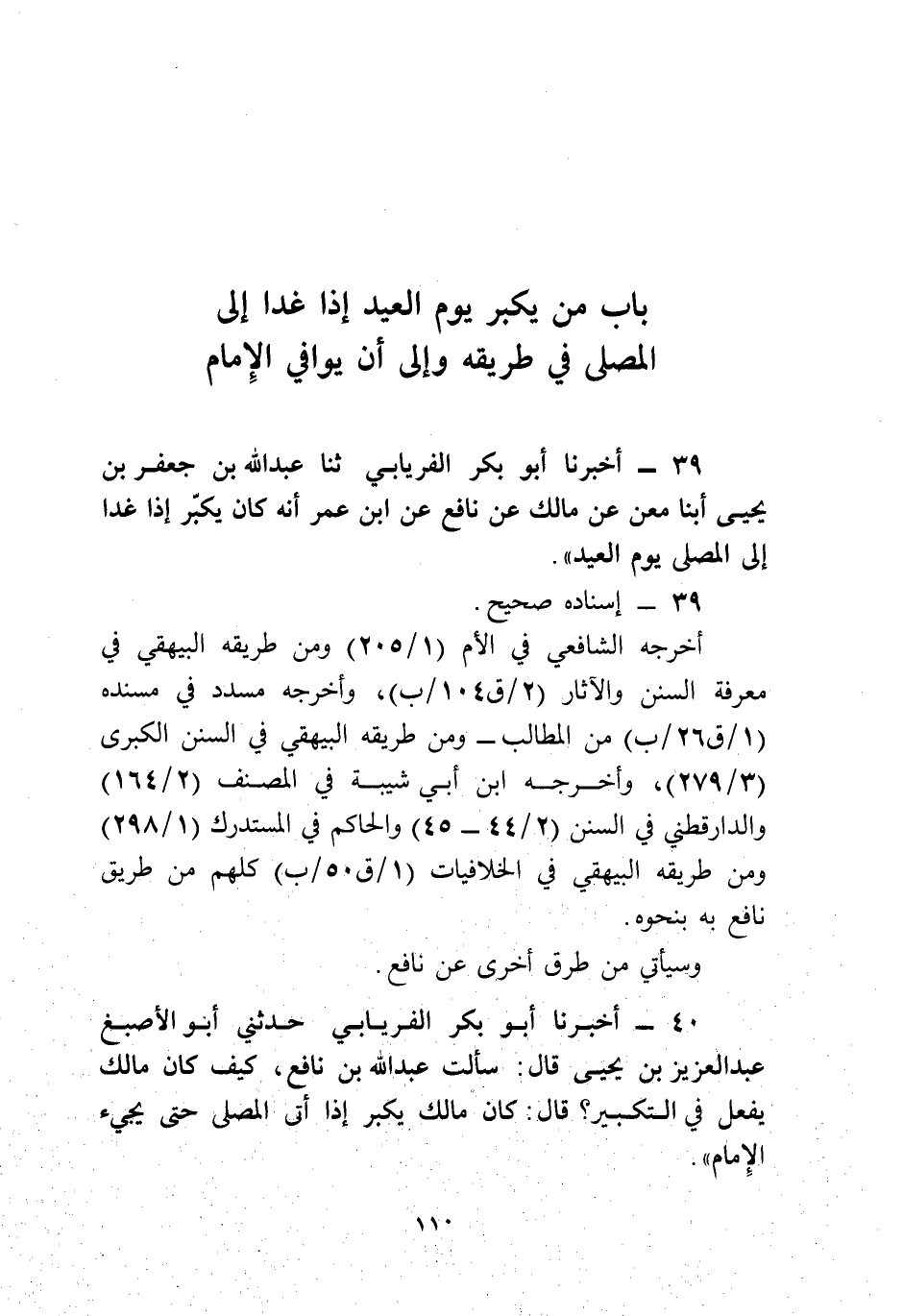 39 - أَخْبَرَنَا أَبُو بَكْرٍ الْفِرْيَابِيُّ، ثنا عَبْدُ اللَّهِ بْنُ جَعْفَرِ بْنِ يَحْيَى، أبنا مَعْنٌ، عَنْ مَالِكٍ، عَنْ نَافِعٍ، عَنِ ابْنِ عُمَرَ «أَنَّهُ كَانَ §يُكَبِّرُ إِذَا غَدَا إِلَى الْمُصَلَّى يَوْمَ الْعِيدِ»