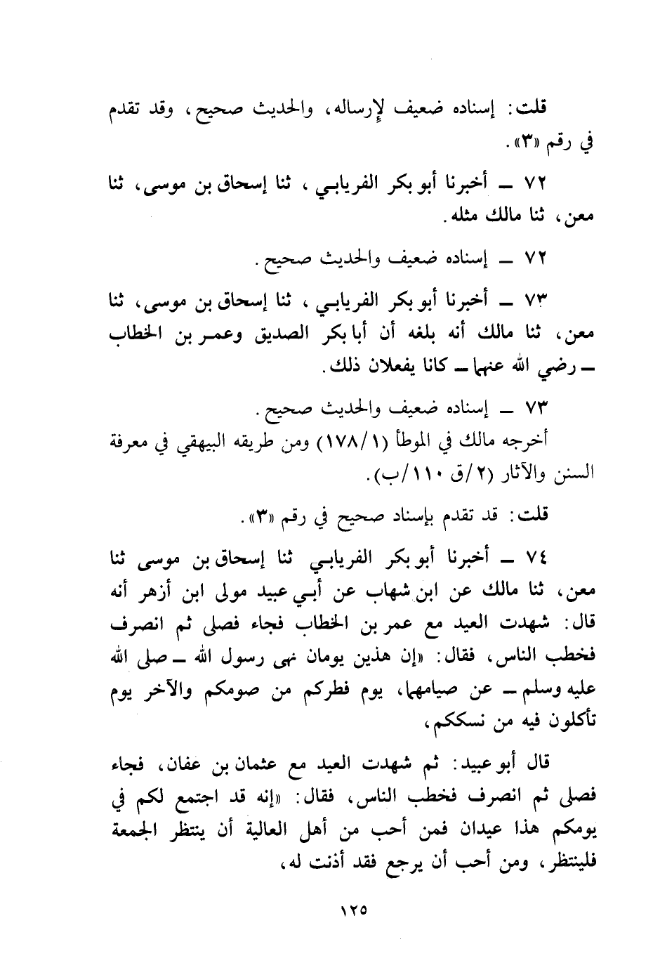 أَخْبَرَنَا أَبُو بَكْرٍ الْفِرْيَابِيُّ، ثنا إِسْحَاقُ بْنُ مُوسَى، ثنا مَعْنٌ، ثنا مَالِكٌ، عَنِ ابْنِ شِهَابٍ، عَنْ أَبِي عُبَيْدٍ، مَوْلَى ابْنِ أَزْهَرَ أَنَّهُ قَالَ: " شَهِدْتُ الْعِيدَ مَعَ عُمَرَ بْنِ الْخَطَّابِ فَجَاءَ فَصَلَّى، ثُمَّ انْصَرَفَ فَخَطَبَ النَّاسَ، فَقَالَ: «إِنَّ هَذَيْنِ يَوْمَانِ §نَهَى رَسُولُ اللَّهِ صَلَّى اللهُ عَلَيْهِ وَسَلَّمَ عَنْ صِيَامِهِمَا، يَوْمُ فِطْرِكُمْ مِنْ صَوْمِكُمْ، وَالْآخَرُ يَوْمٌ تَأْكُلُونَ فِيهِ مِنْ نُسُكِكُمْ» . قَالَ أَبُو عُبَيْدٍ: ثُمَّ شَهِدْتُ الْعِيدَ مَعَ عُثْمَانَ بْنِ عَفَّانَ، فَجَاءَ فَصَلَّى، ثُمَّ انْصَرَفَ فَخَطَبَ النَّاسَ، فَقَالَ: إِنَّهُ قَدِ اجْتَمَعَ لَكُمْ فِي يَوْمِكُمْ هَذَا عِيدَانِ فَمَنْ أَحَبَّ مِنْ أَهْلِ الْعَالِيَةِ أَنْ يَنْتَظِرَ الْجُمُعَةَ فَلْيَنْتَظِرْ، وَمَنْ أَحَبَّ أَنْ يَرْجِعَ فَقَدْ أَذِنْتُ لَهُ -[126]-. قَالَ أَبُو عُبَيْدٍ: ثُمَّ شَهِدْتُ الْعِيدَ مَعَ عَلِيِّ بْنِ أَبِي طَالِبٍ، وَعُثْمَانُ مَحْصُورٌ، فَجَاءَ فَصَلَّى، ثُمَّ انْصَرَفَ فَخَطَبَ