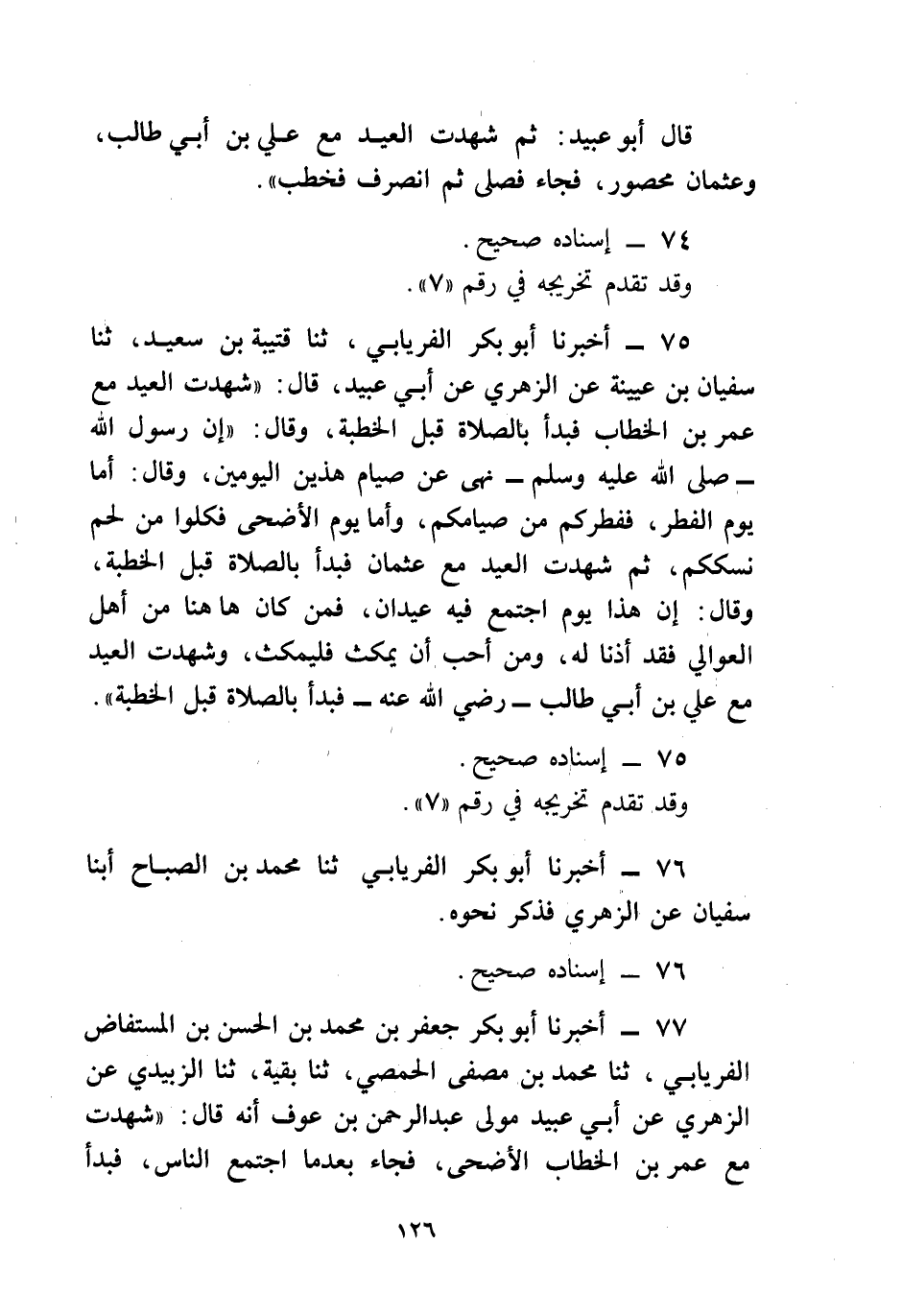 أَخْبَرَنَا أَبُو بَكْرٍ الْفِرْيَابِيُّ، ثنا قُتَيْبَةُ بْنُ سَعِيدٍ، ثنا سُفْيَانُ بْنُ عُيَيْنَةَ، عَنِ الزُّهْرِيِّ، عَنْ أَبِي عُبَيْدٍ، قَالَ: " شَهِدْتُ الْعِيدَ مَعَ عُمَرَ بْنِ الْخَطَّابِ فَبَدَأَ بِالصَّلَاةِ قَبْلَ الْخُطْبَةِ، وَقَالَ: " إِنَّ رَسُولَ اللَّهِ صَلَّى اللهُ عَلَيْهِ وَسَلَّمَ نَهَى عَنْ صِيَامِ هَذَيْنِ الْيَوْمَيْنِ، وَقَالَ: §أَمَّا يَوْمُ الْفِطْرِ، فَفِطْرُكُمْ مِنْ صِيَامِكُمْ، وَأَمَّا يَوْمُ الْأَضْحَى فَكُلُوا مِنْ لَحْمِ نُسُكِكُمْ "، ثُمَّ شَهِدَت الْعِيدَ مَعَ عُثْمَانَ فَبَدَأَ بِالصَّلَاةِ قَبْلَ الْخُطْبَةِ، وَقَالَ: إِنَّ هَذَا يَوْمٌ اجْتَمَعَ فِيهِ عِيدَانِ، فَمَنْ كَانَ هَاهُنَا مِنْ أَهْلِ الْعَوَالِي فَقَدْ أَذِنَّا لَهُ، وَمَنْ أَحَبَّ أَنْ يَمْكُثَ فَلْيَمْكُثْ، وَشَهِدْتُ الْعِيدَ مَعَ عَلِيِّ بْنِ أَبِي طَالِبٍ رَضِيَ اللَّهُ عَنْهُ فَبَدَأَ بِالصَّلَاةِ قَبْلَ الْخُطْبَةِ، أَخْبَرَنَا أَبُو بَكْرٍ الْفِرْيَابِيُّ، ثنا مُحَمَّدُ بْنُ الصَّبَّاحِ، أبنا سُفْيَانُ، عَنِ الزُّهْرِيِّ، فَذَكَرَ نَحْوَهُ
