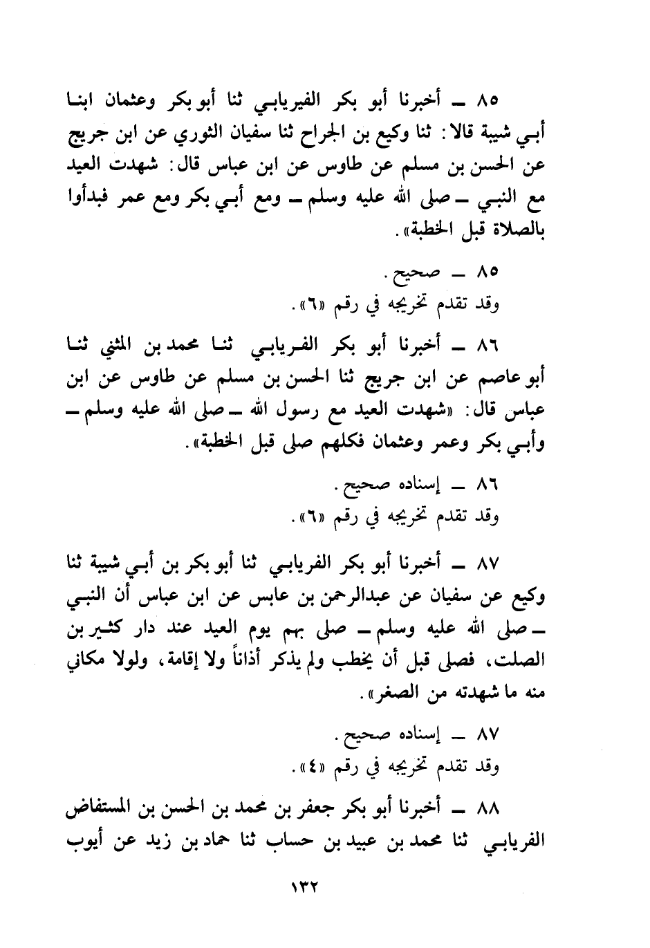 85 - أَخْبَرَنَا أَبُو بَكْرٍ الْفِرْيَابِيُّ، ثنا أَبُو بَكْرٍ، وَعُثْمَانُ، ابْنَا أَبِي شَيْبَةَ، قَالَا: ثنا وَكِيعُ بْنُ الْجَرَّاحِ، ثنا سُفْيَانُ الثَّوْرِيُّ، عَنِ ابْنِ جُرَيْجٍ، عَنِ الْحَسَنِ بْنِ مُسْلِمٍ، عَنْ طَاوُسٍ، عَنِ ابْنِ عَبَّاسٍ، قَالَ: «شَهِدْتُ الْعِيدَ مَعَ النَّبِيِّ صَلَّى اللهُ عَلَيْهِ وَسَلَّمَ، وَمَعَ أَبِي بَكْرٍ، وَمَعَ عُمَرَ §فَبَدَأُوا بِالصَّلَاةِ قَبْلَ الْخُطْبَةِ»